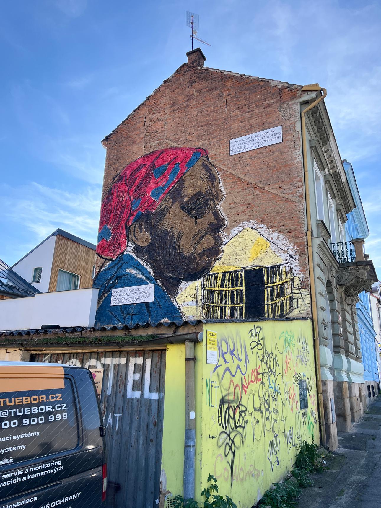 The mural, created for the 2021 WALLZ street art festival, is part of People In Need’s “Faces of Climate Change”, which seeks to motivate people to become involved in solving global issues and challenges facing today’s world. It portrays Zambian woman Maliwa Mukelabai, whose family is affected by climate change in Zambia.