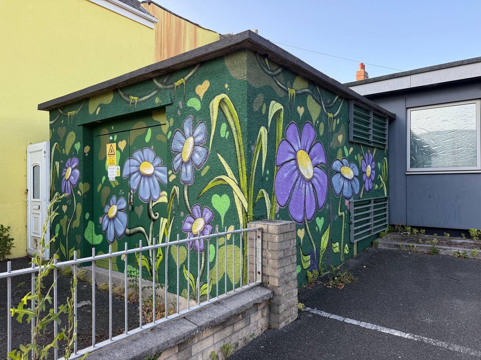 Flowers on electrical substation. I believe by Roy Christie