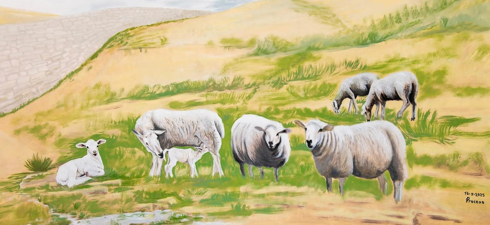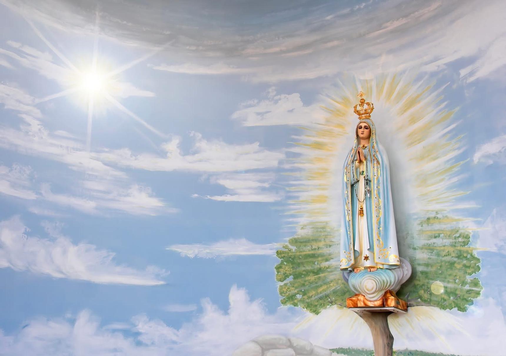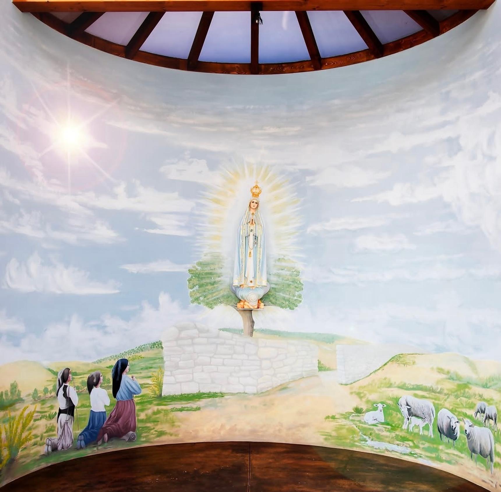 The mural, located in the hermitage, depicts the apparition of the Virgin of Fatima to some shepherd.