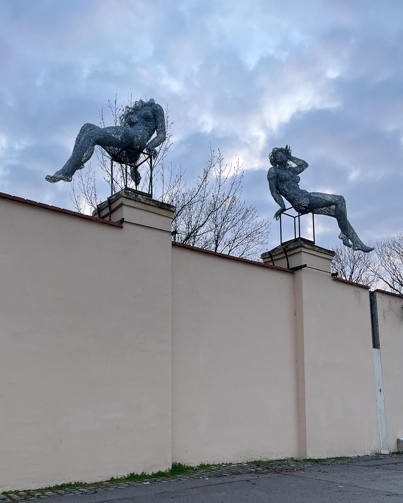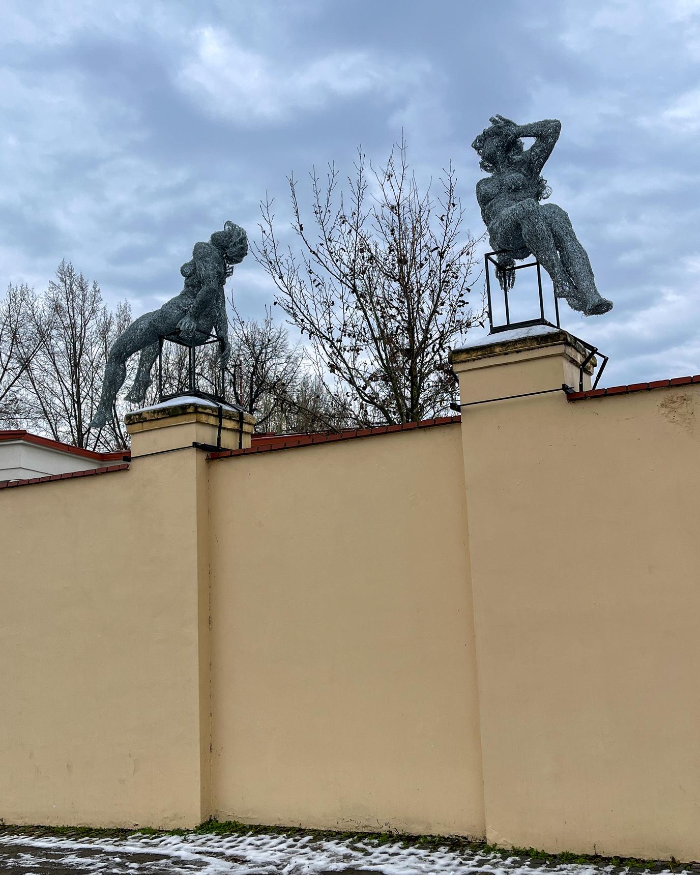 Site-specific installation created in 2023 for a sealed gate in a Baroque wall on Kampa Island in Prague. Galvanized wire mesh female figures inspired by Baroque and Neoclassical sculptural decorations.