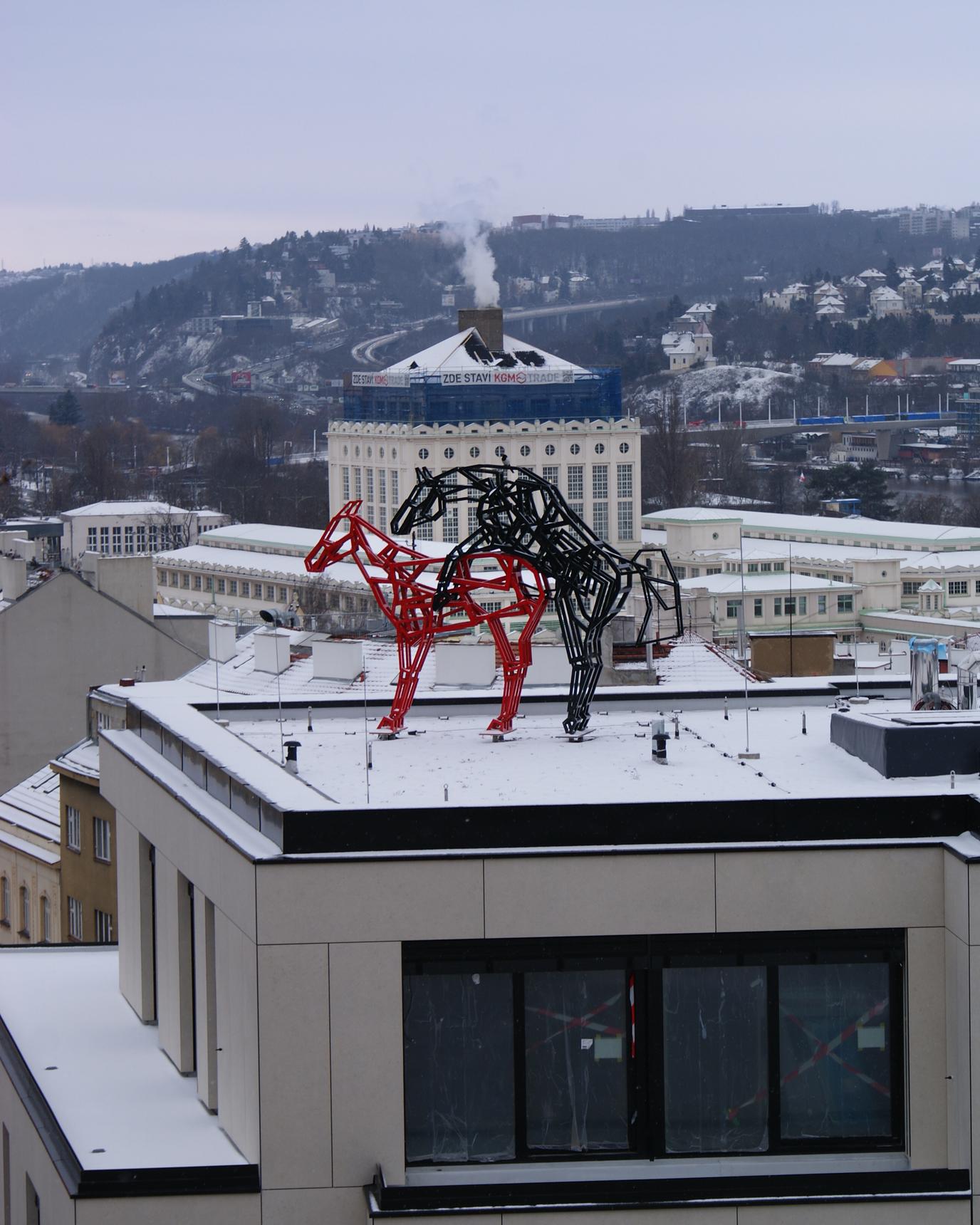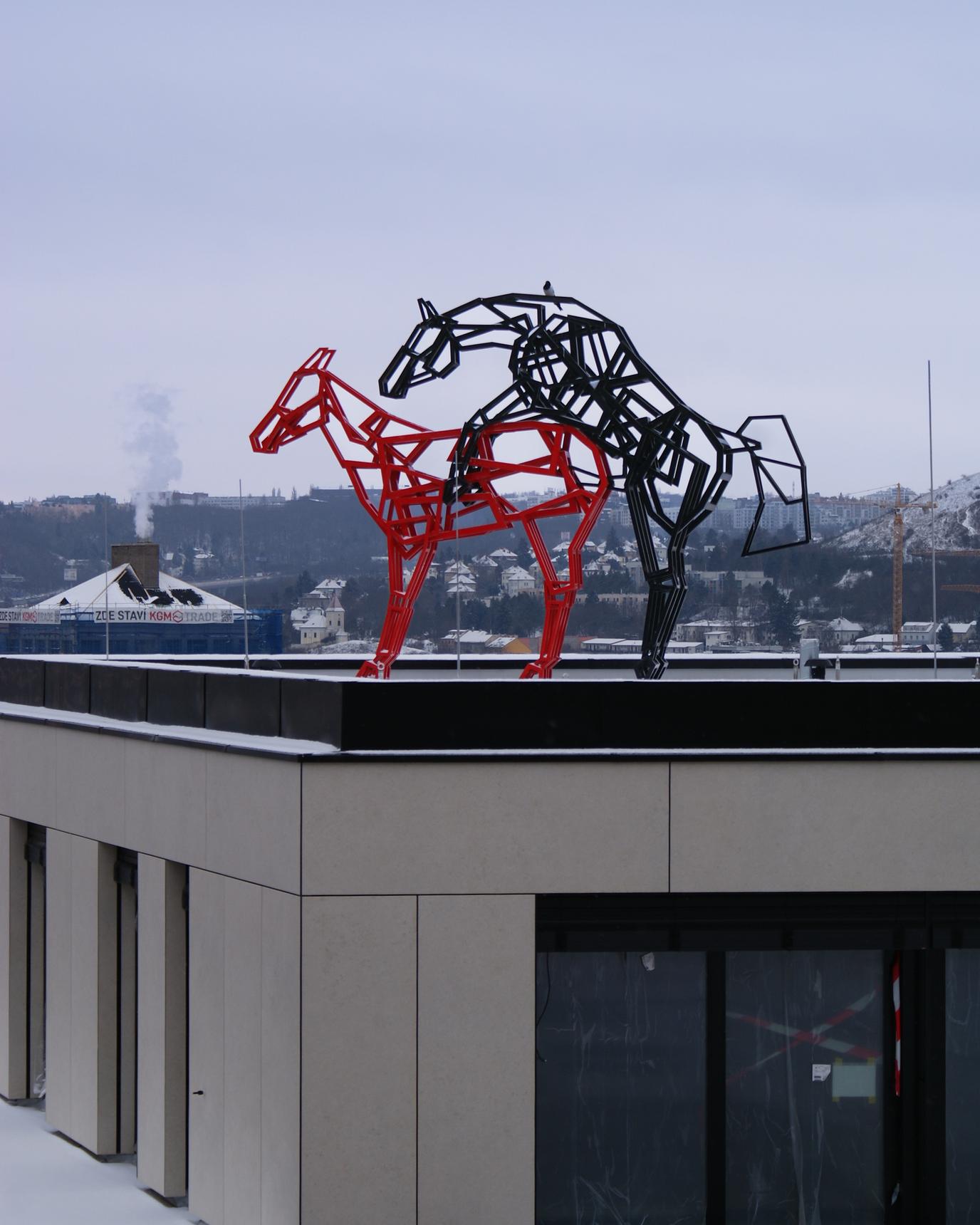 This playful sculpture reimagines the legend of the heroic horse Šemík with an unexpected twist. Originally, the faithful horse saved his master by leaping from Vyšehrad to escape execution, but died from exhaustion. This playful new finale symbolizes hope, joy, and a fresh beginning.