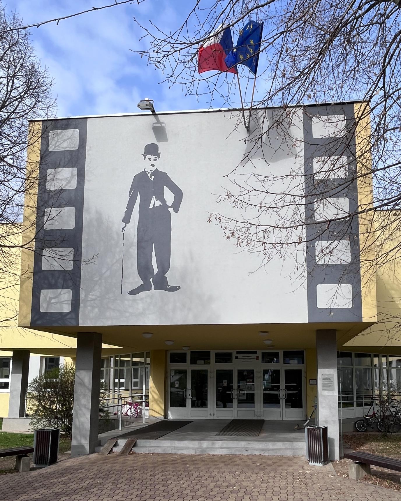 The portrait of Charlie Chaplin on the Barrandov school building, next to the square named after him.