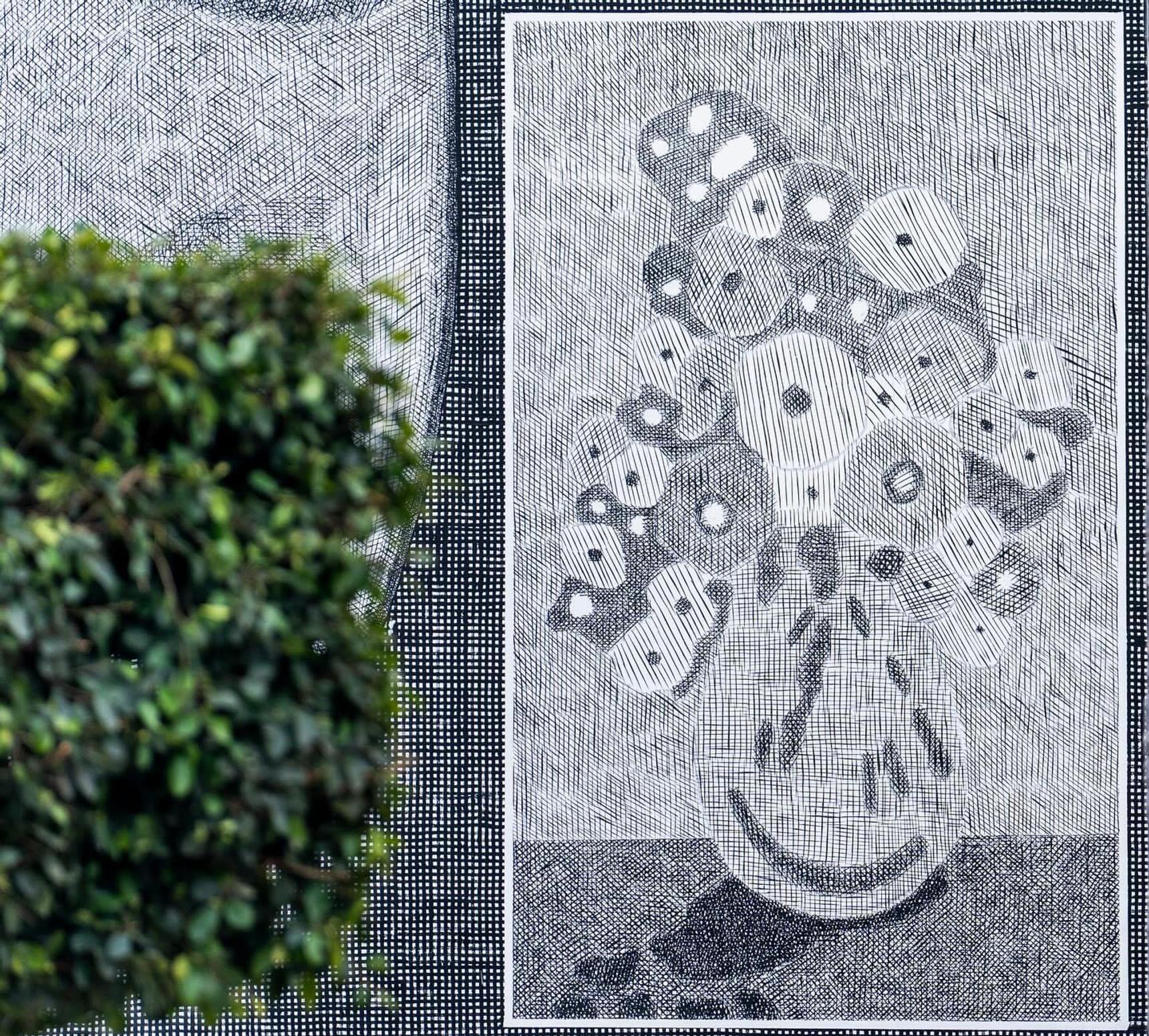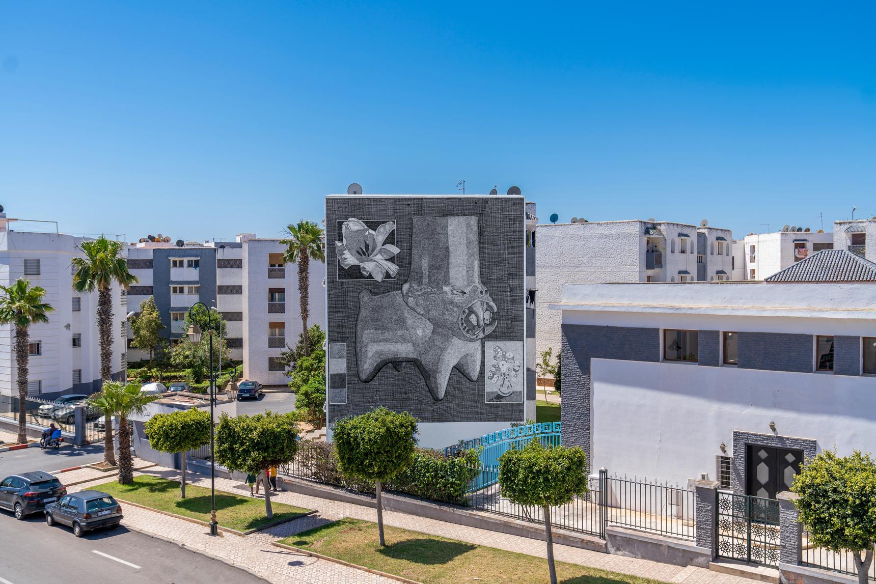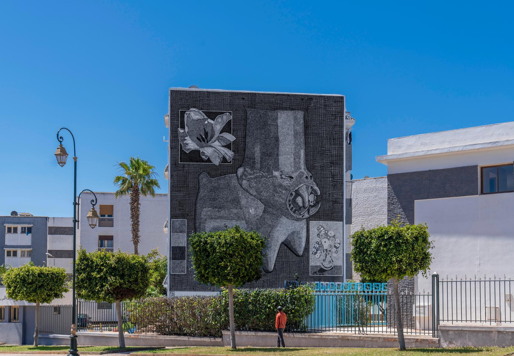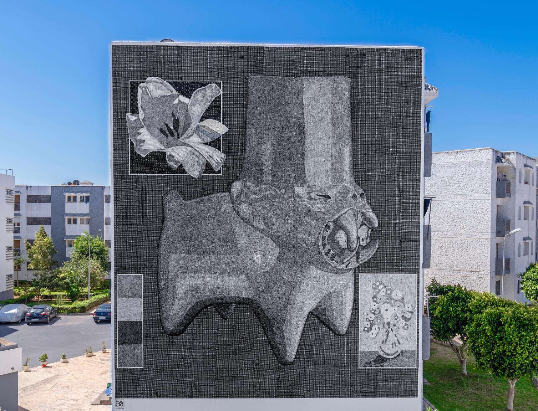 With his textured technique, Facio's monochromatic mural transformed this building in Hay El Fath into a cultural landmark with a timeless appeal
