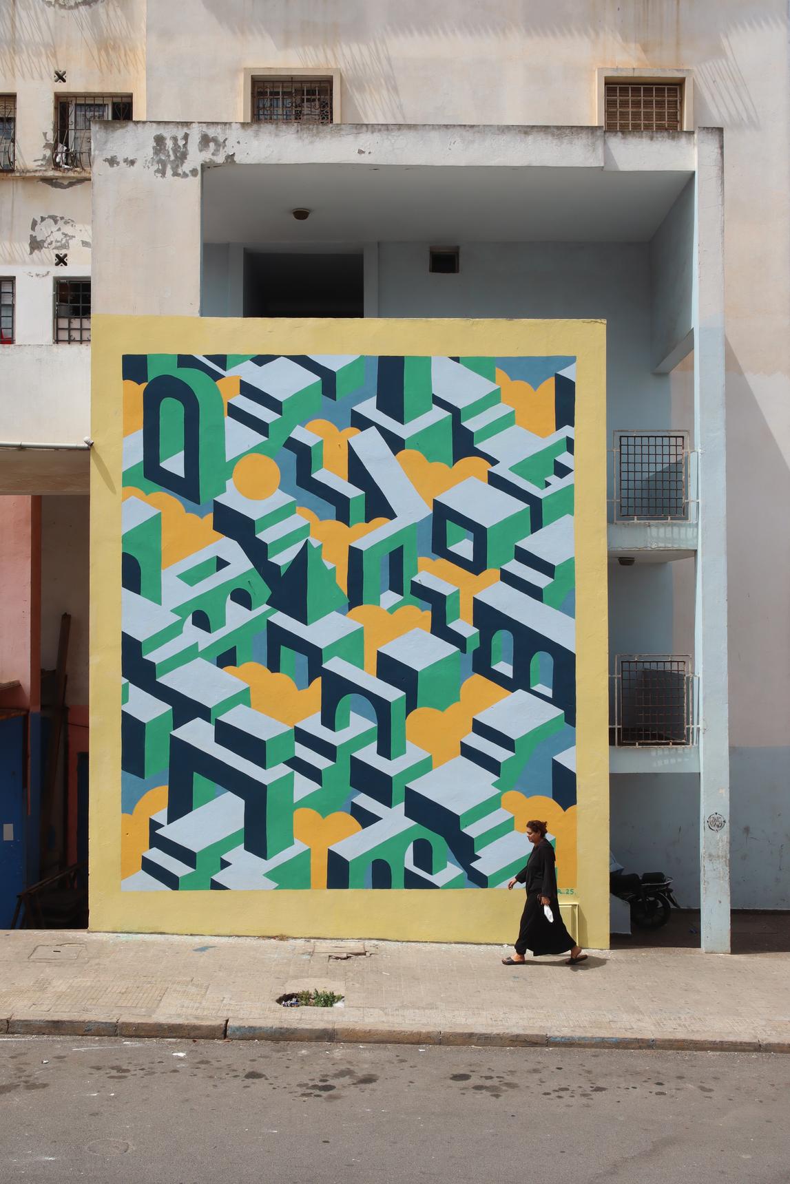 The mural MEDINA was created, inspired by traditional Maghreb architecture. It presents a visual interpretation of the medinas through geometric patterns, arches, and maze-like passages. The work evokes the markets and historic neighborhoods, where paths intertwine and every turn reveals a new perspective. Through its design, MEDINA explores the memory of these places and the richness of local architectural traditions.