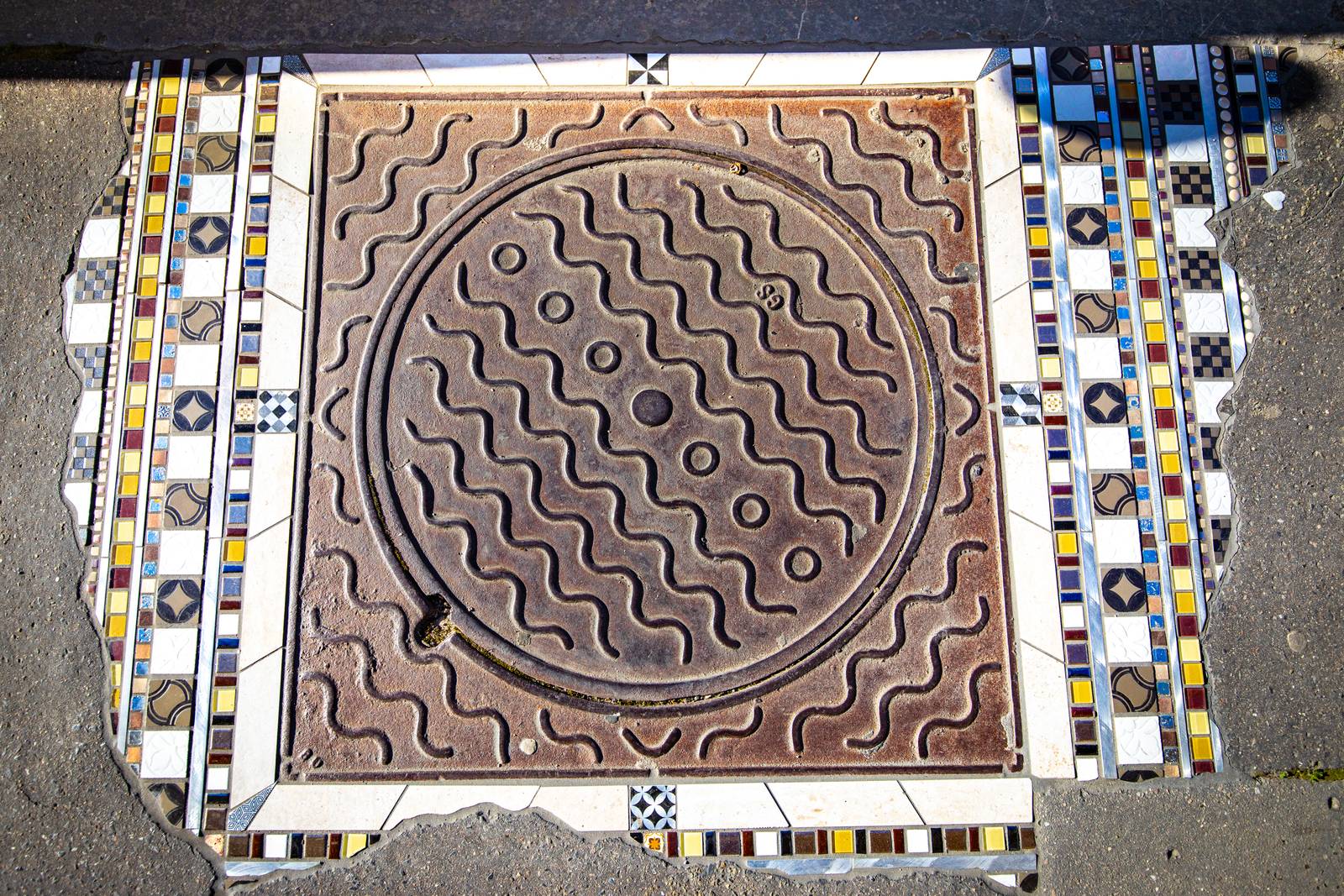 Lyon-based artist Ememem defines himself as a sidewalk poet, a mender of bitumen. The mosaic work is composed entirely of reused materials, and heals the street to echo the city of Reims' repair work, as part of the centenary of Art Deco and post-First World War Reconstruction.