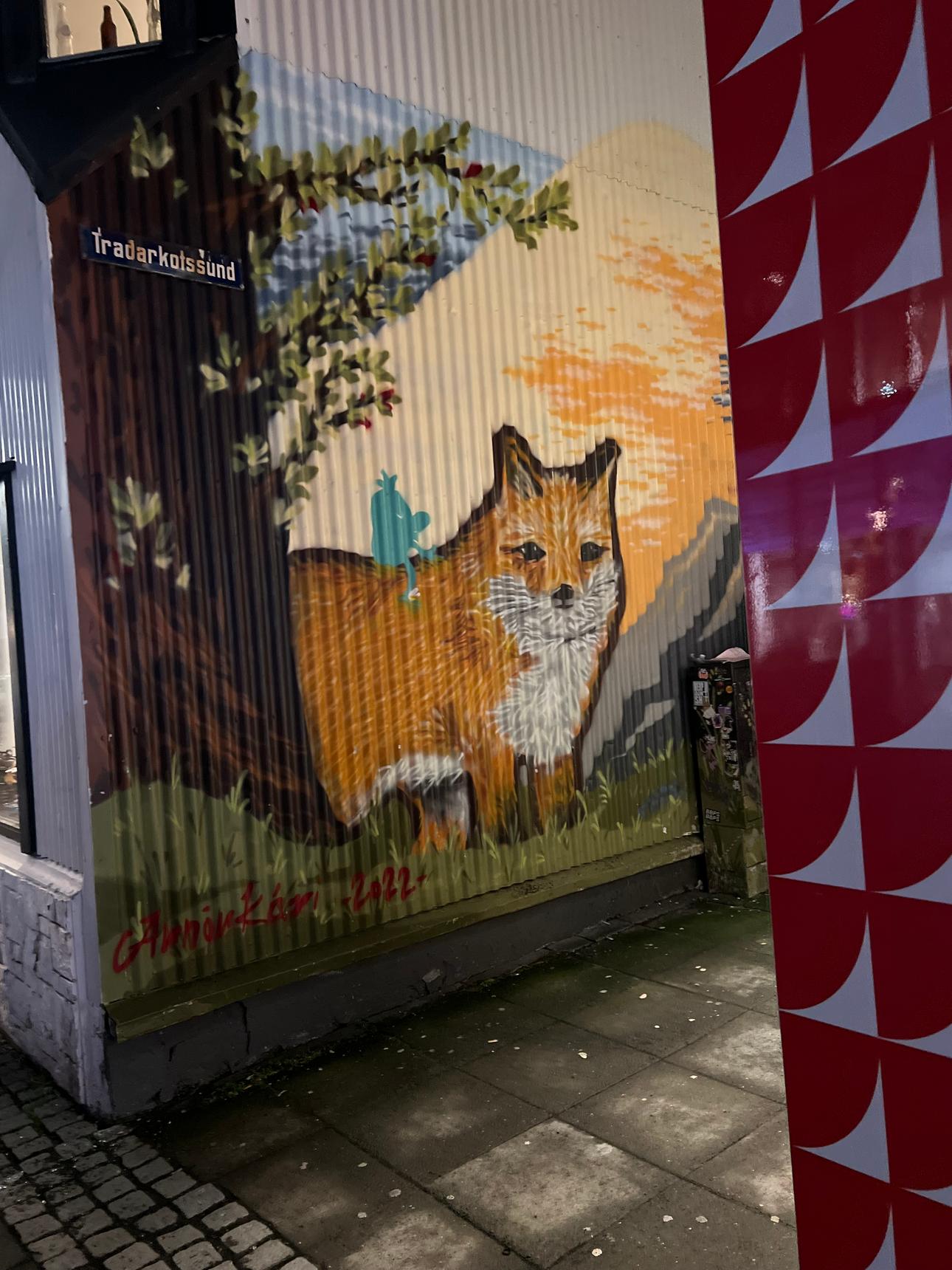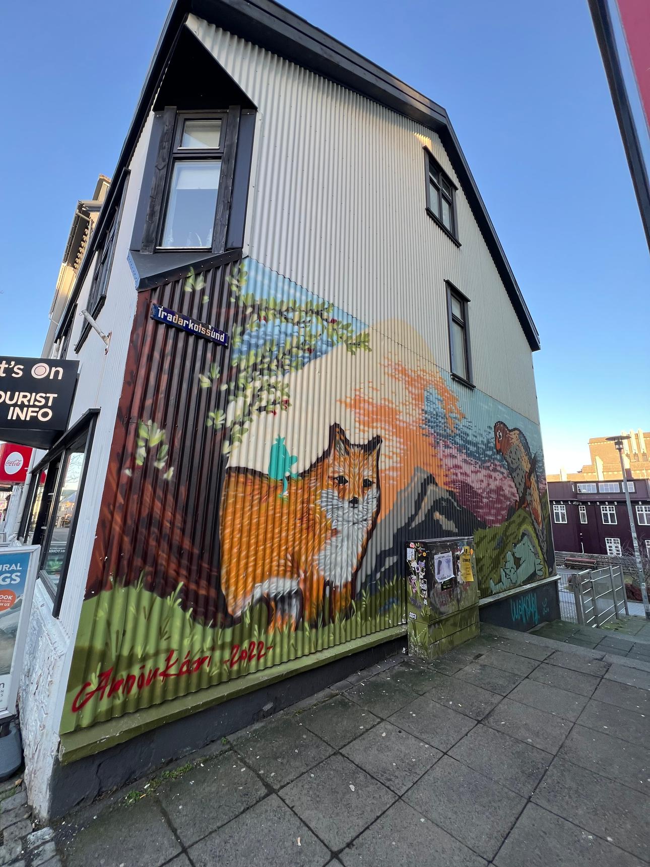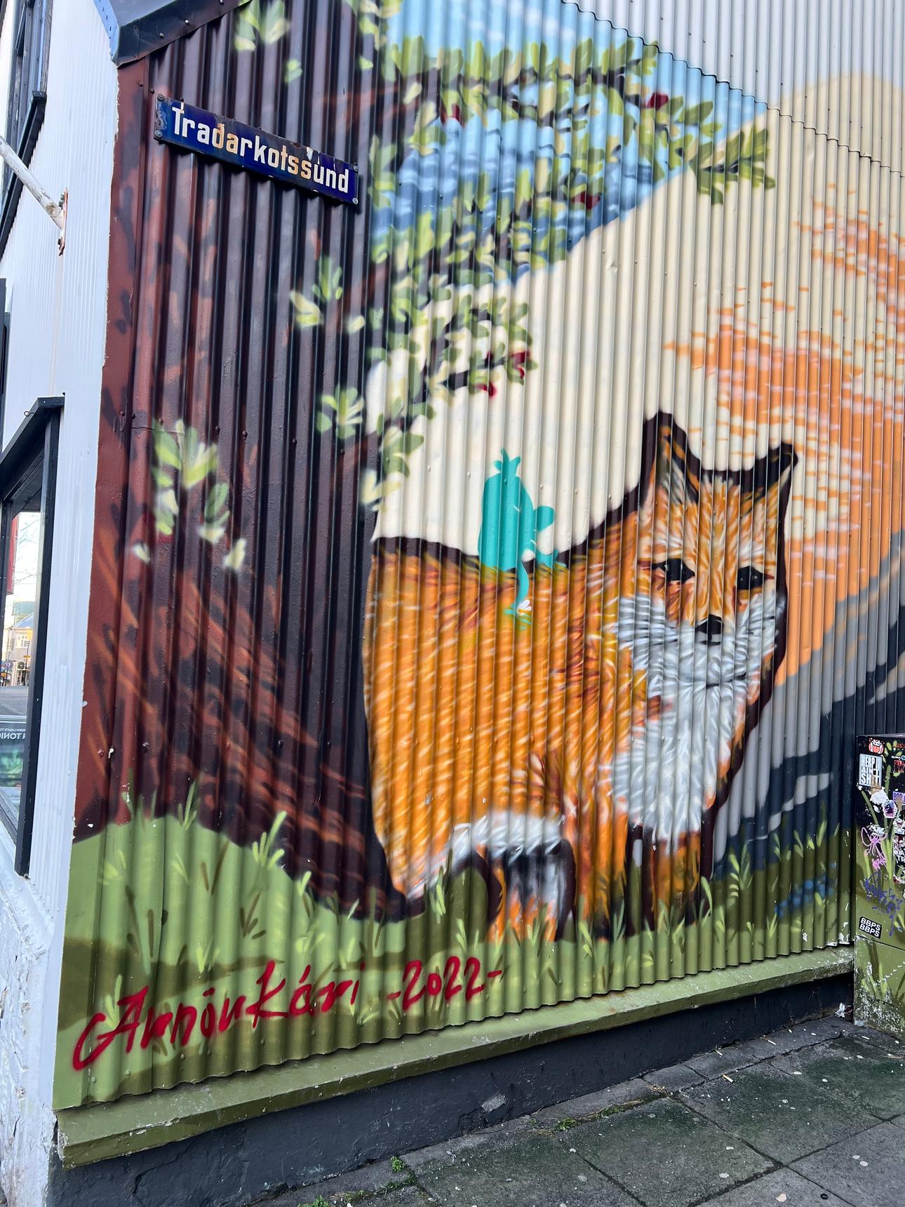 The image shows a vibrant mural of a fox in Reykjavik, Iceland.