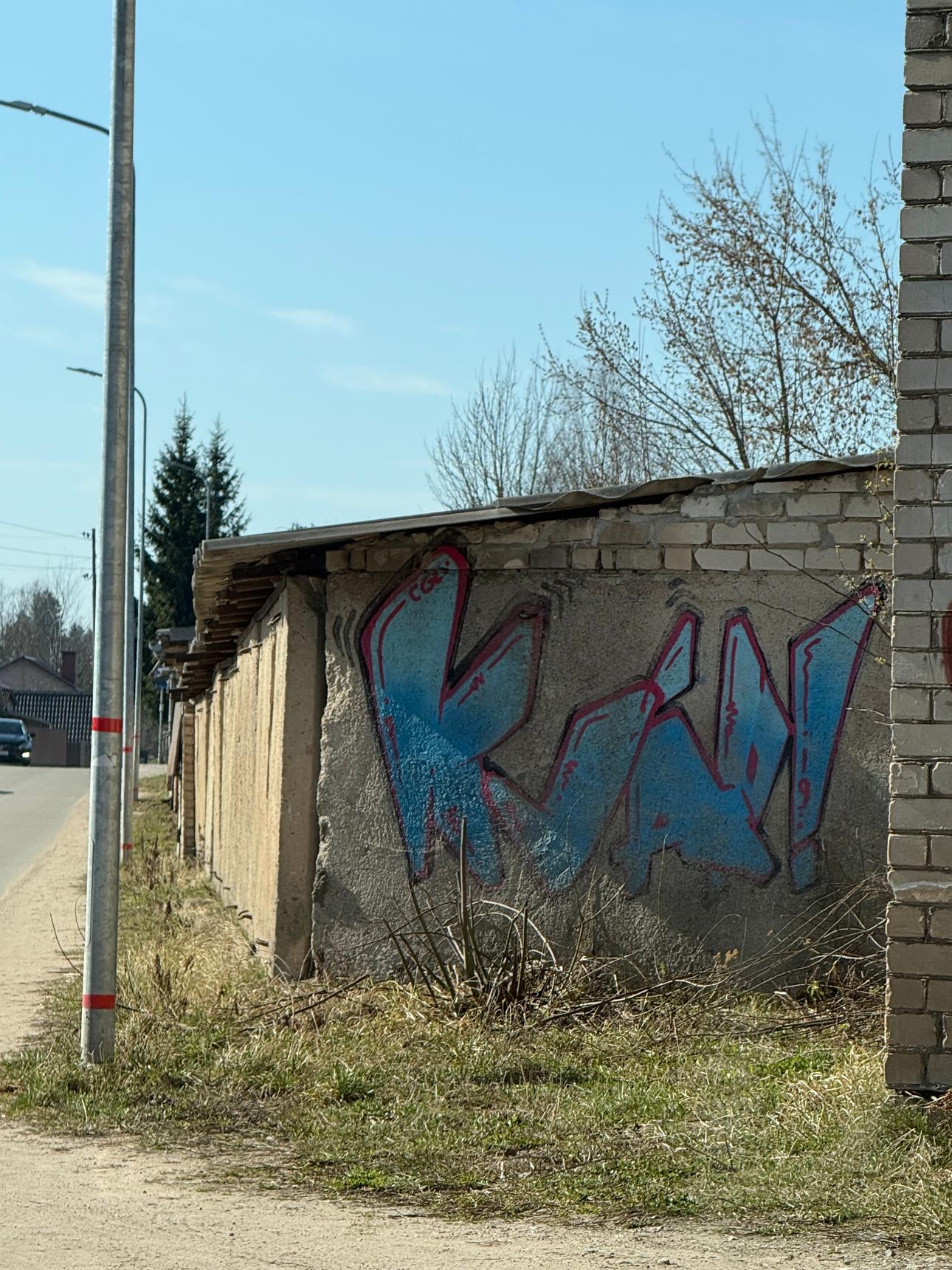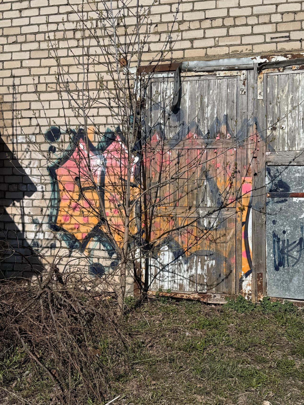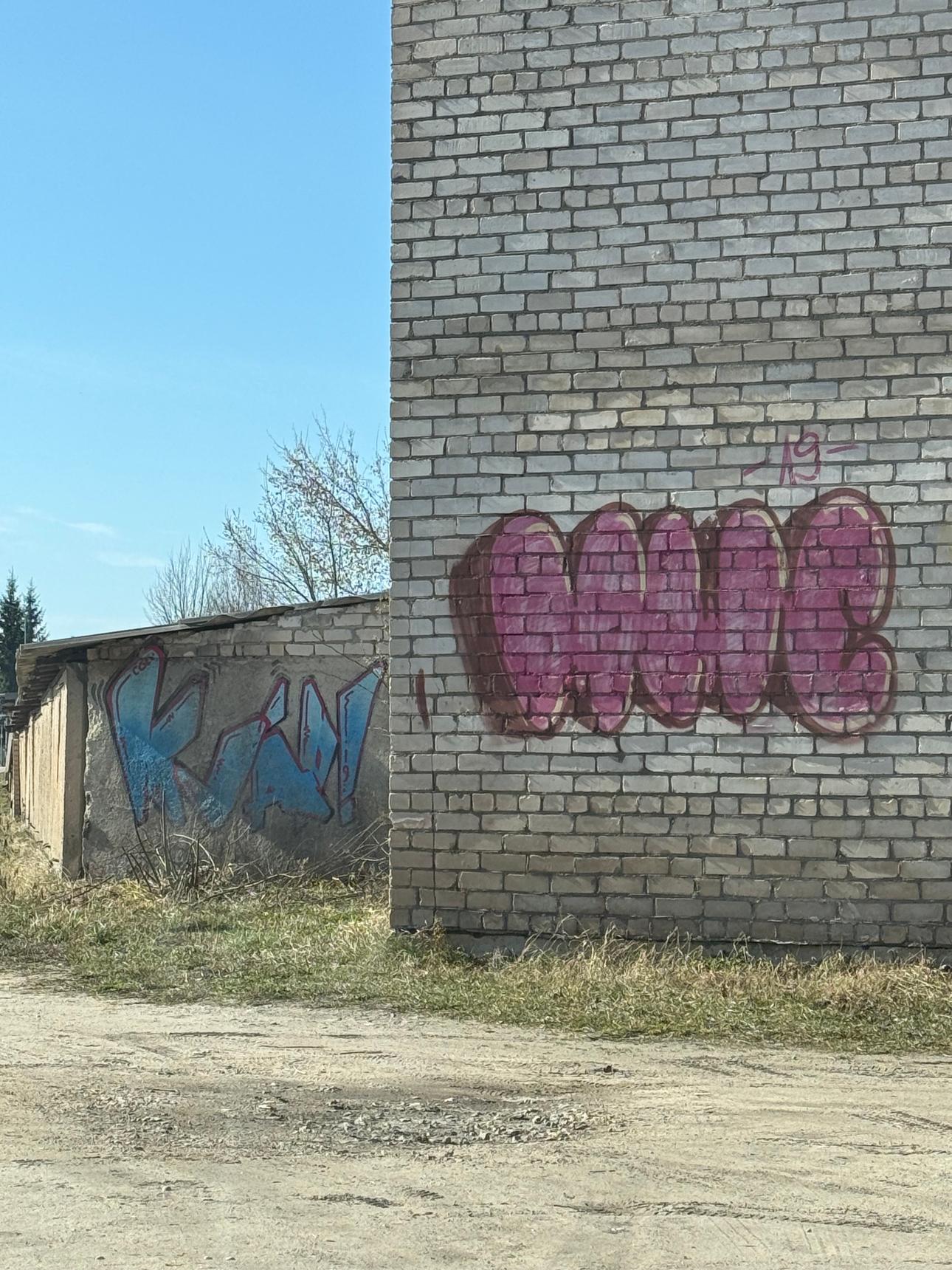 Graffiti tags on a garrage walls.
