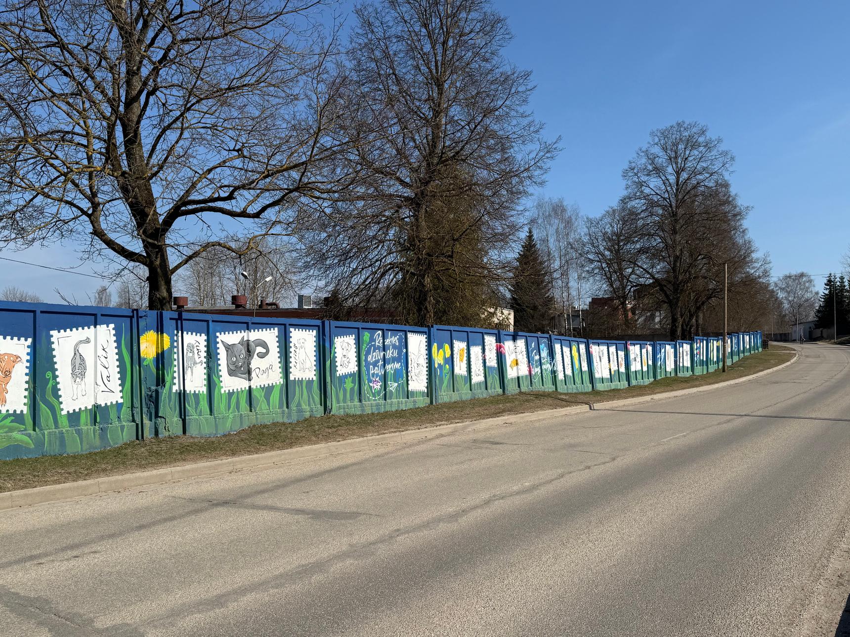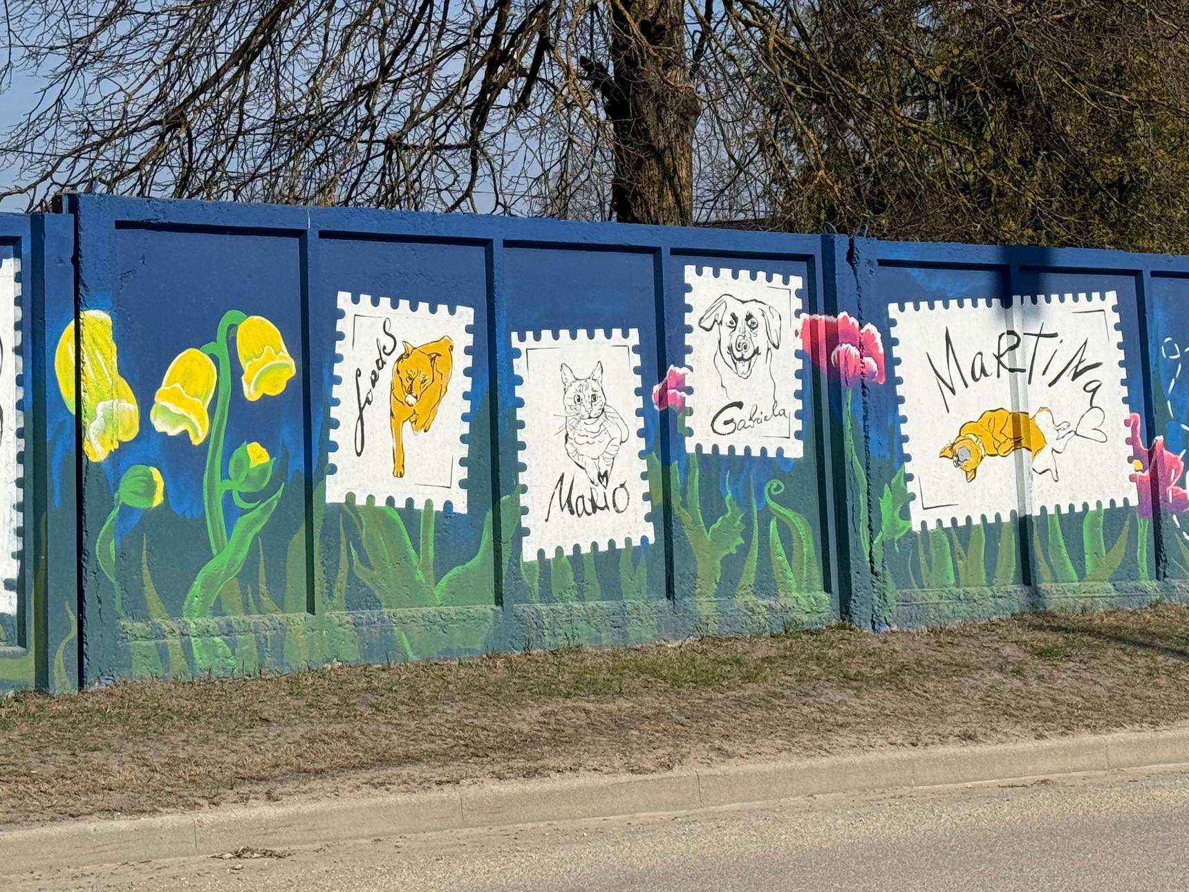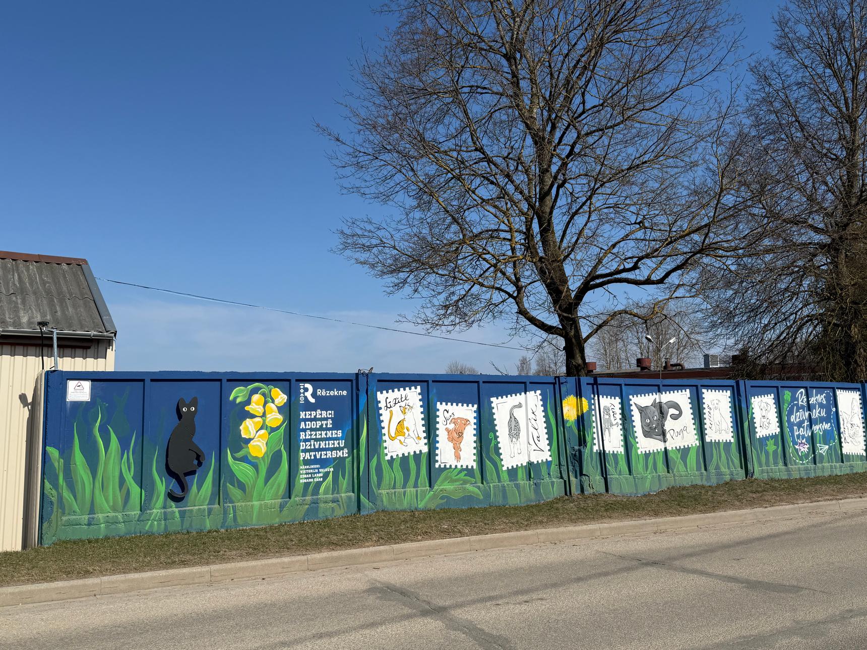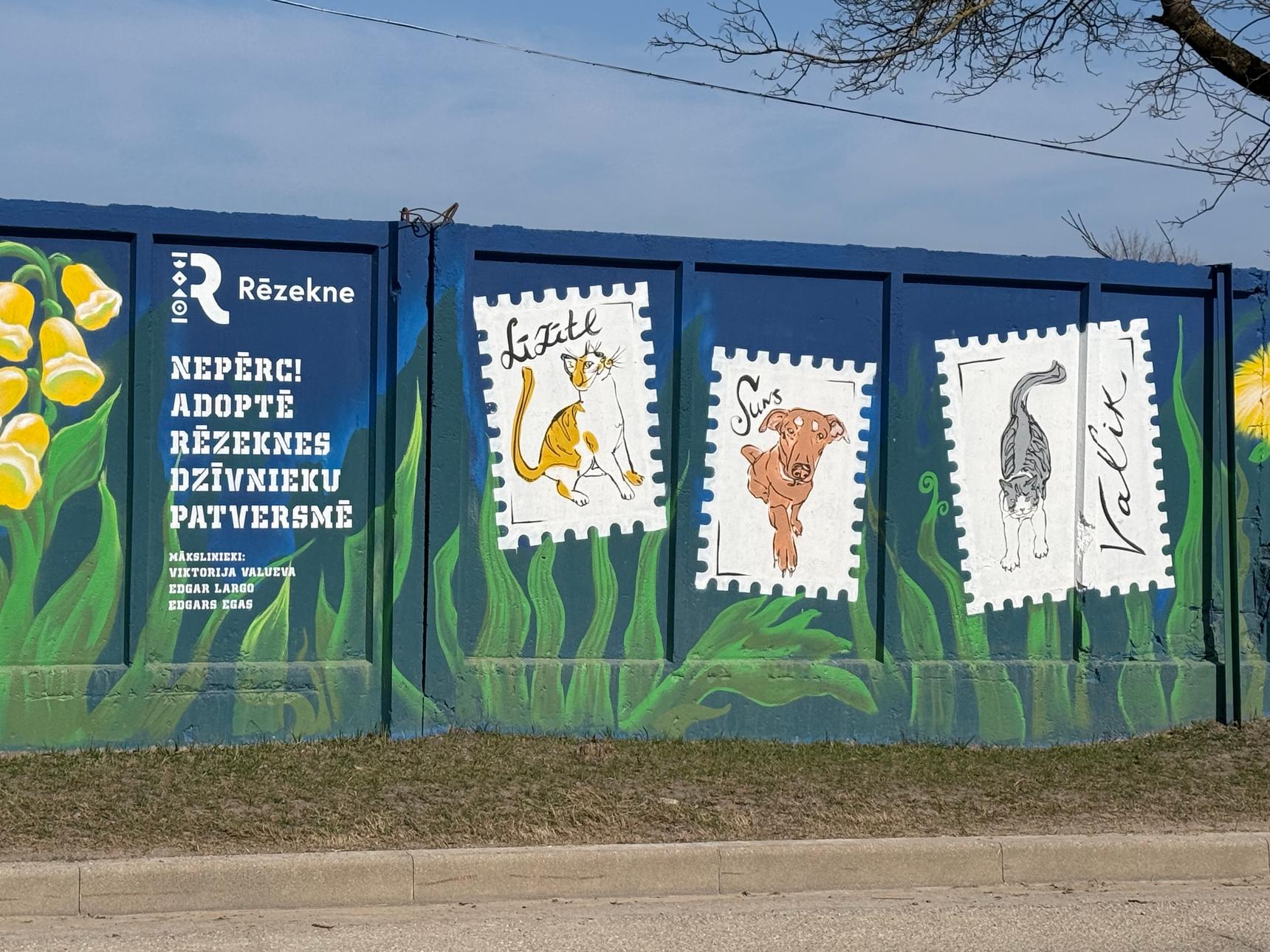 The mural was created on the fence of the Rēzekne animal shelter. The animals depicted are real residents of the shelter. Each image includes the name of the animal.