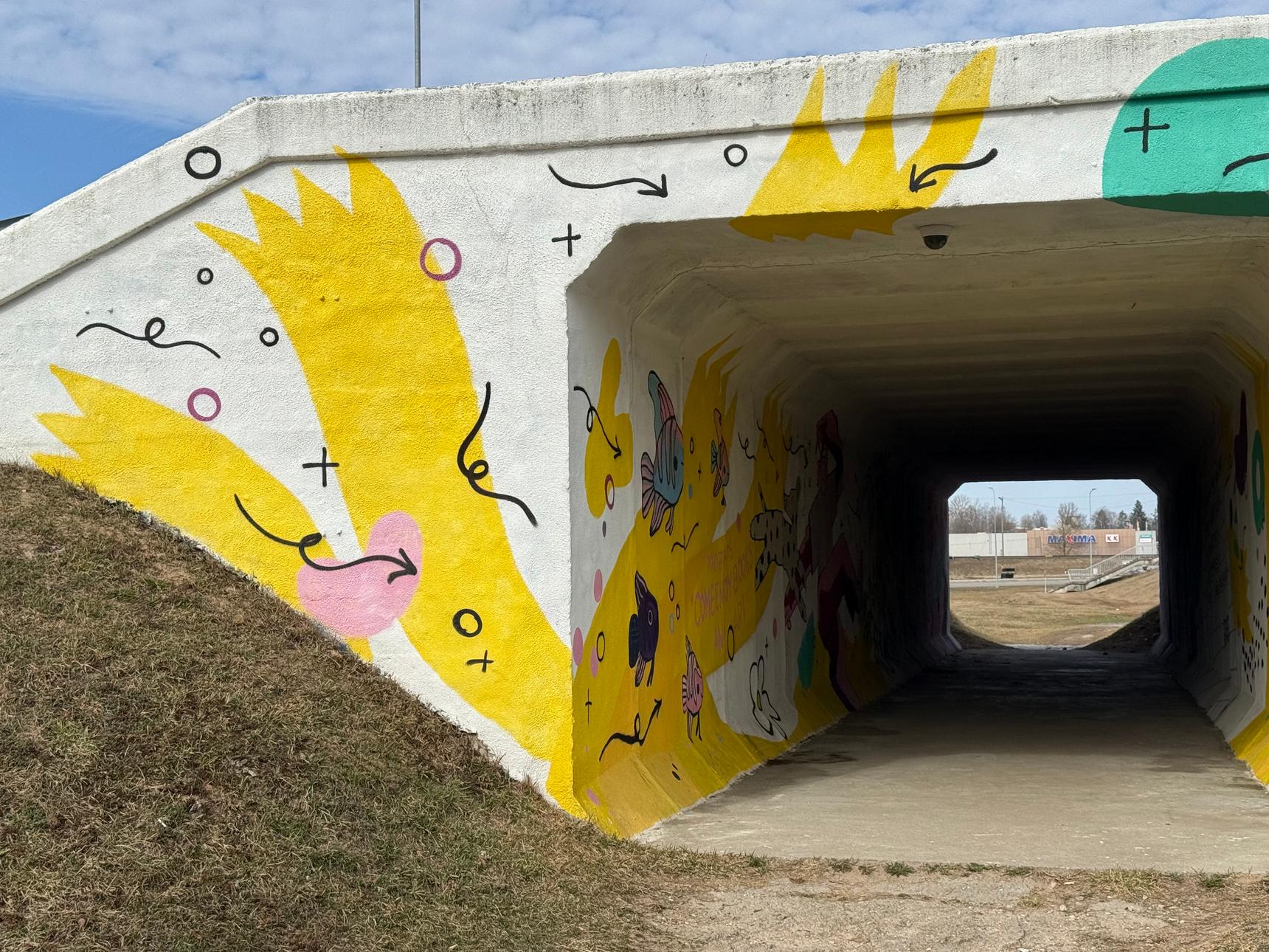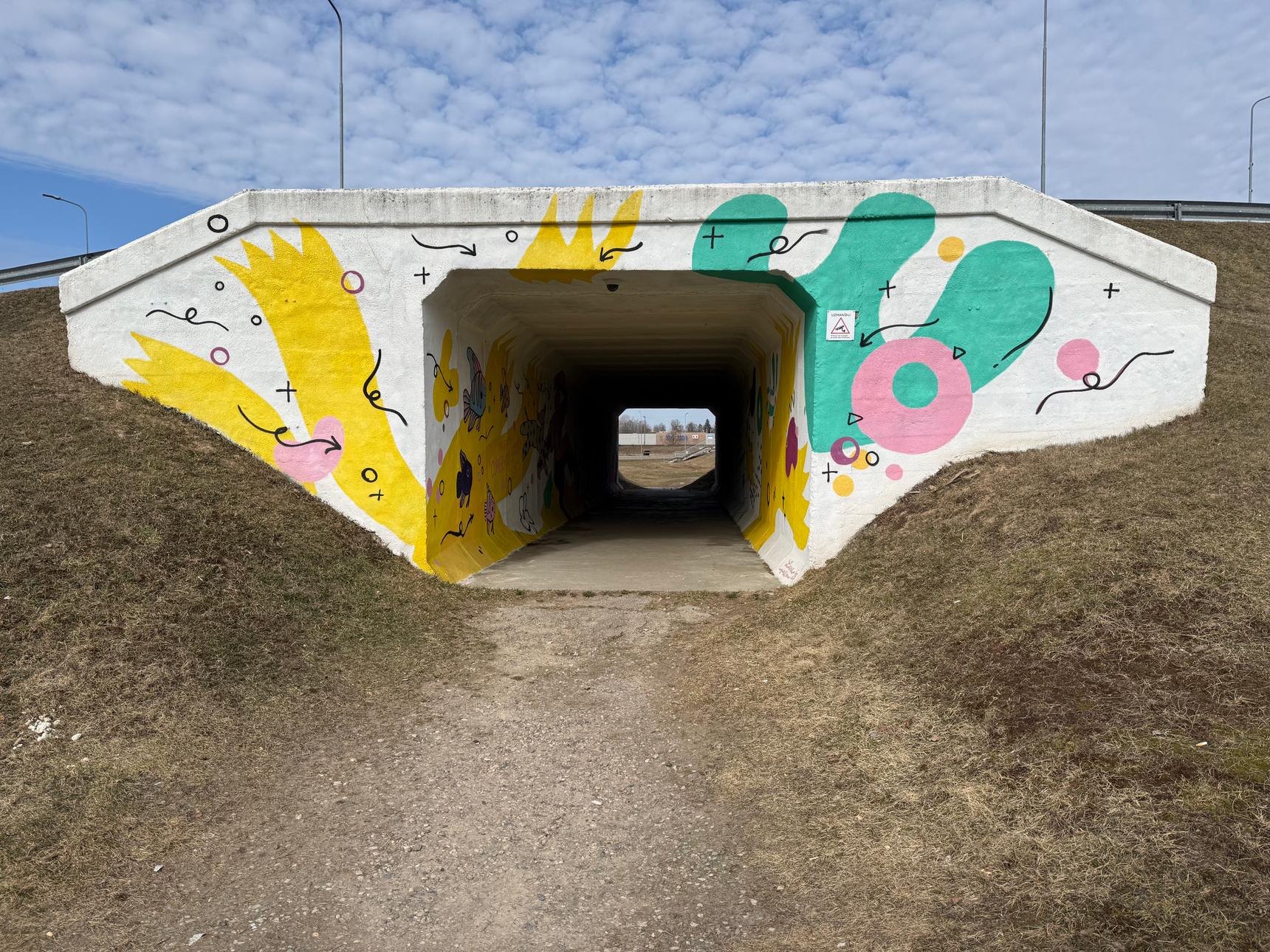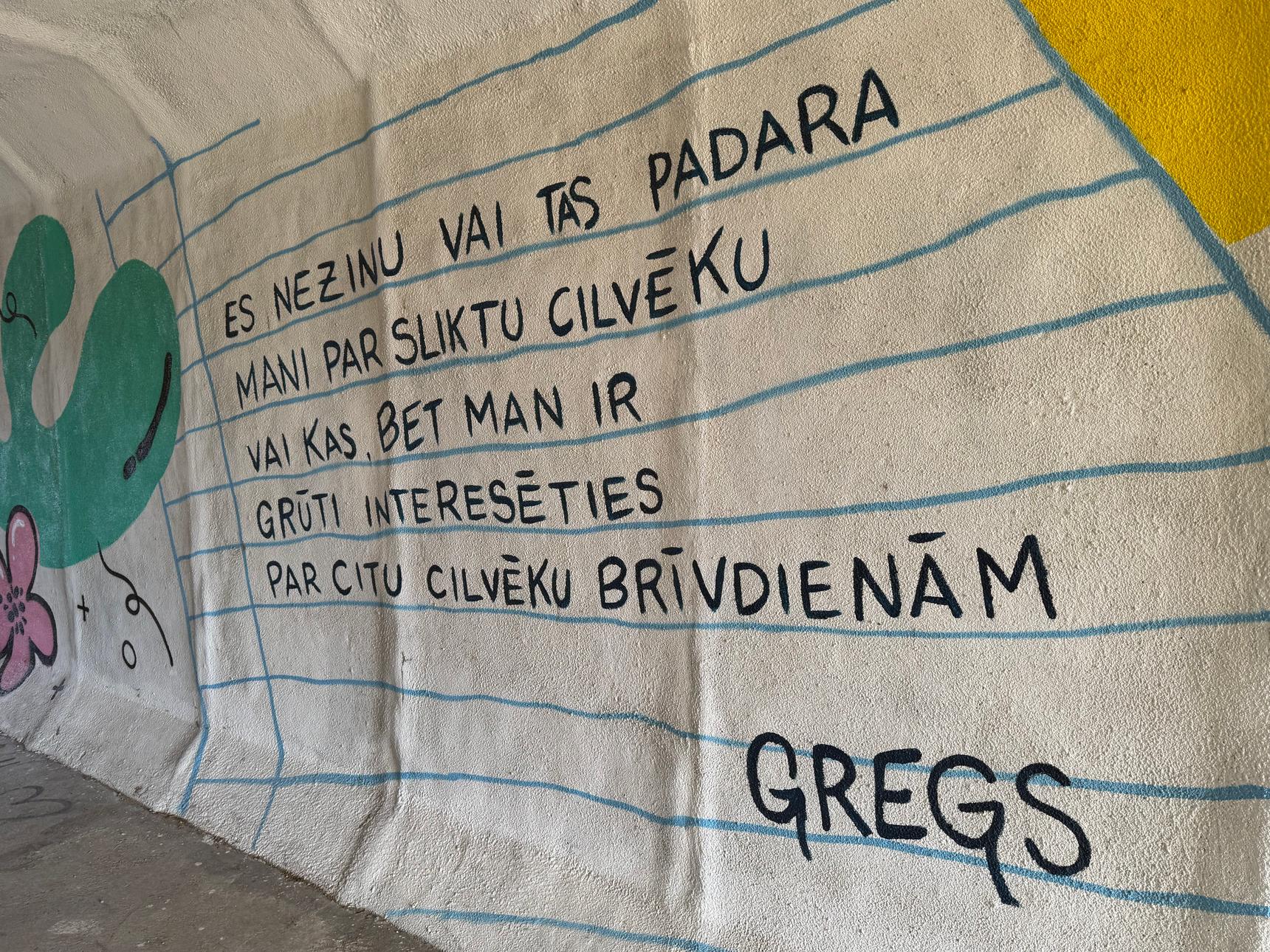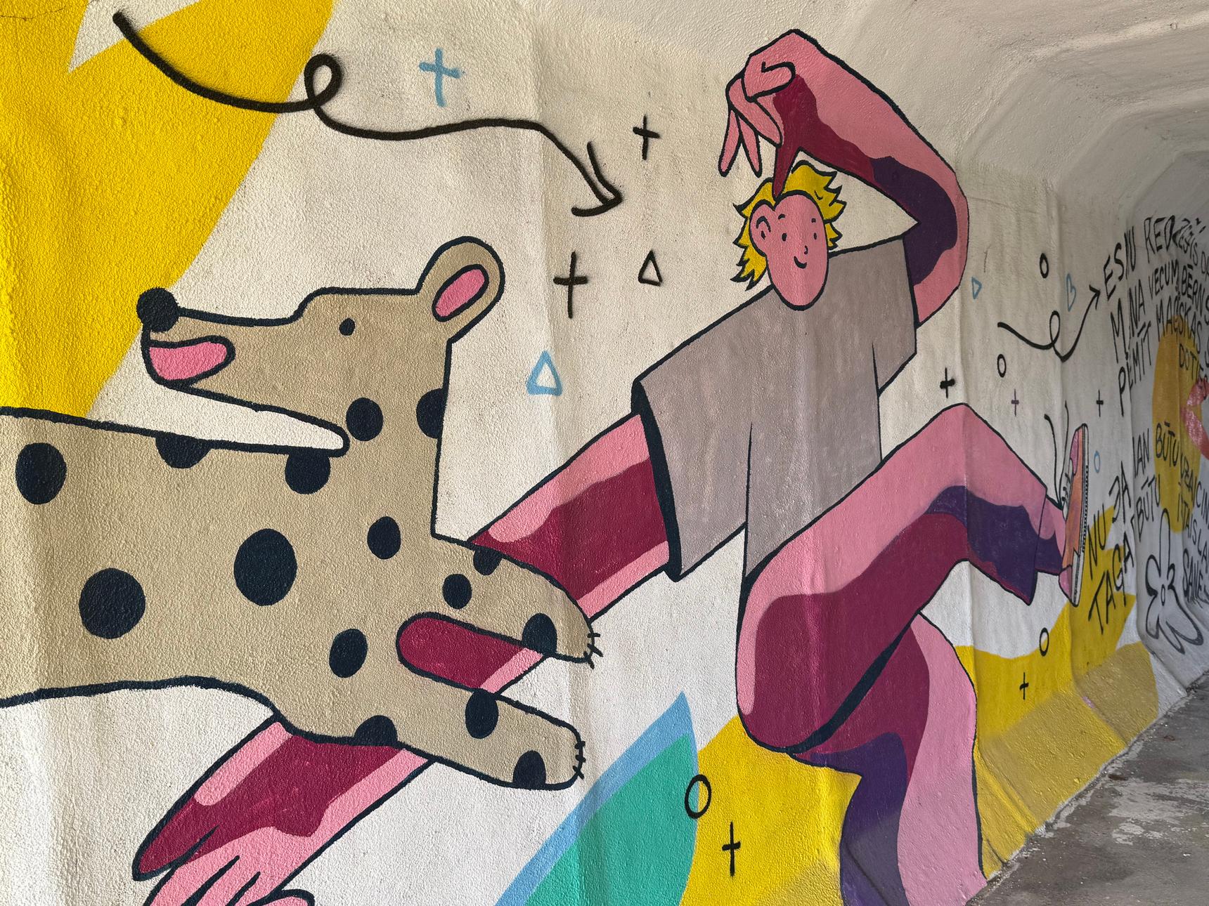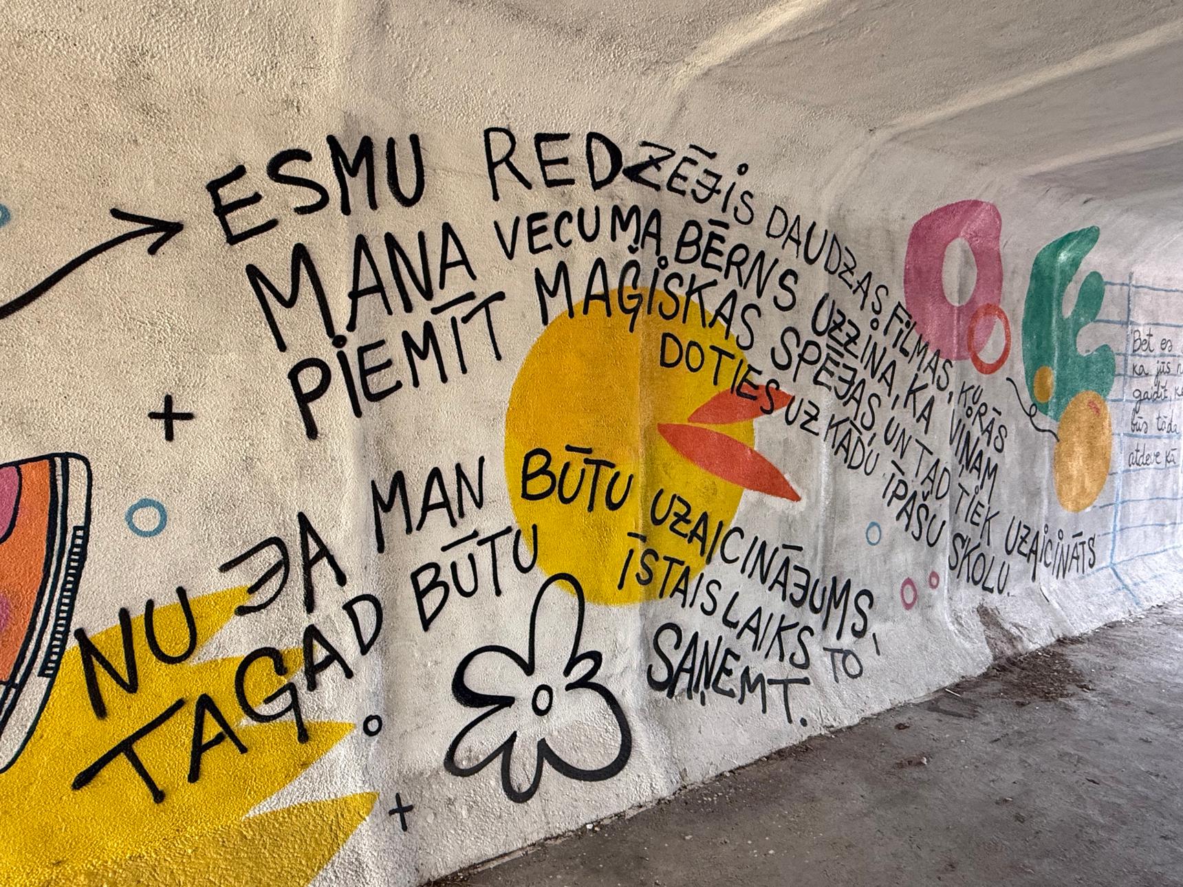 Mural is located on a tunnel walls. Can be found right next to an adress mentioned, because tunnel itself has no adress. Artwork is inspired by famous Greg’s diary motivs. Text is in Latvian.