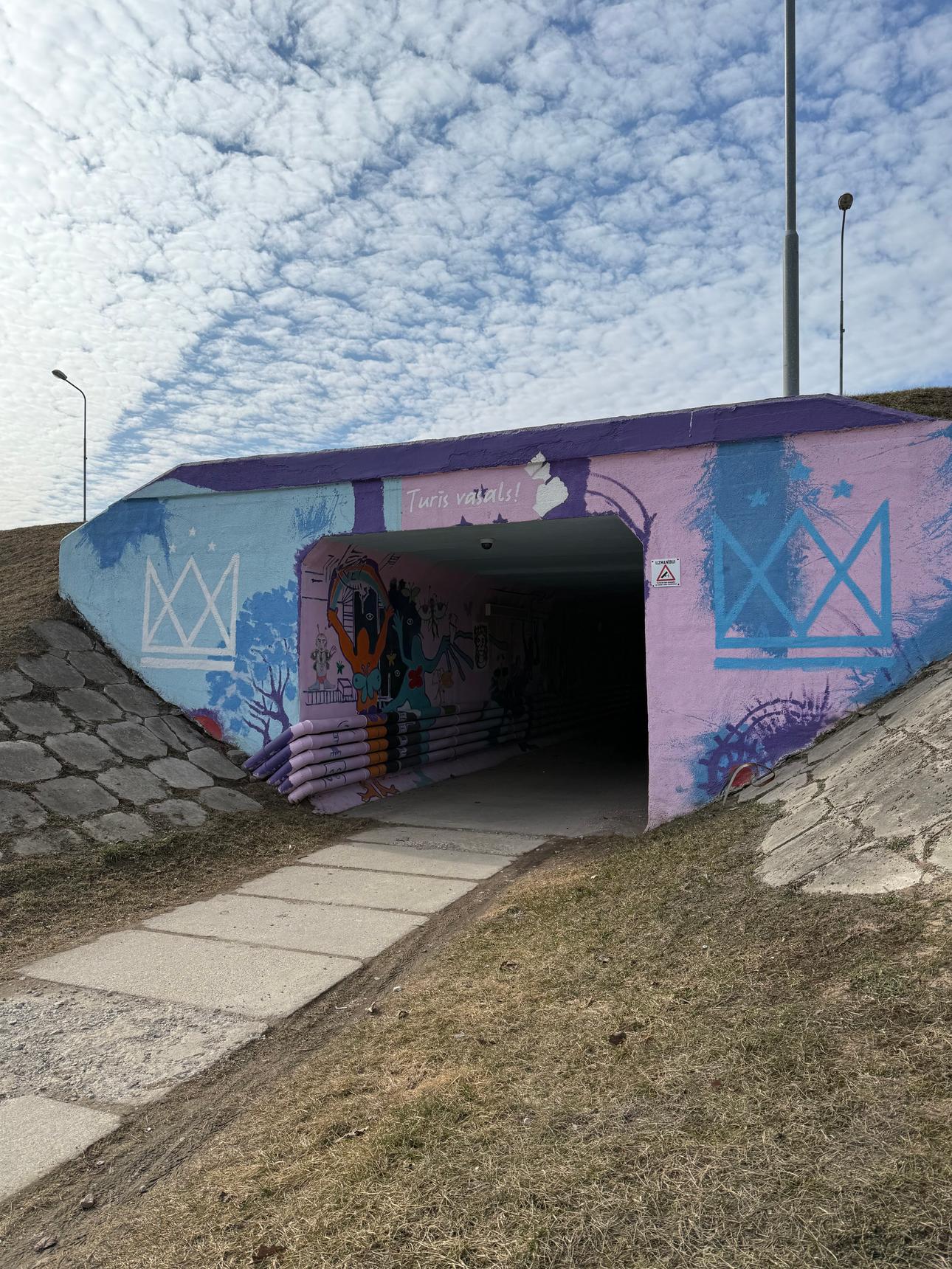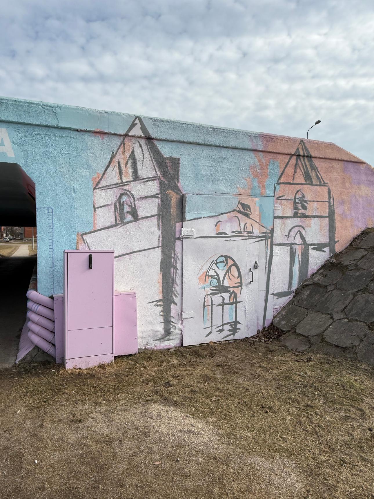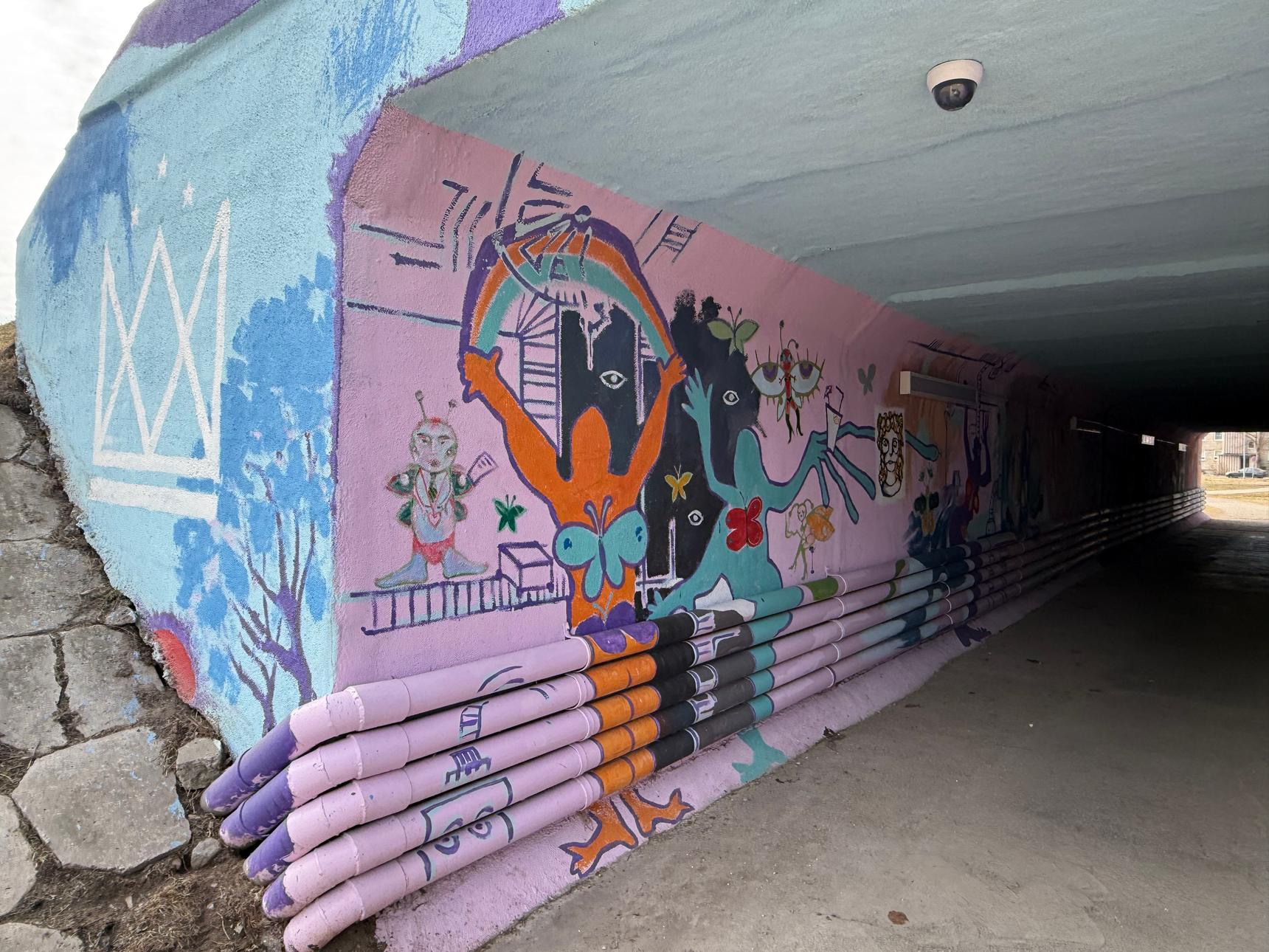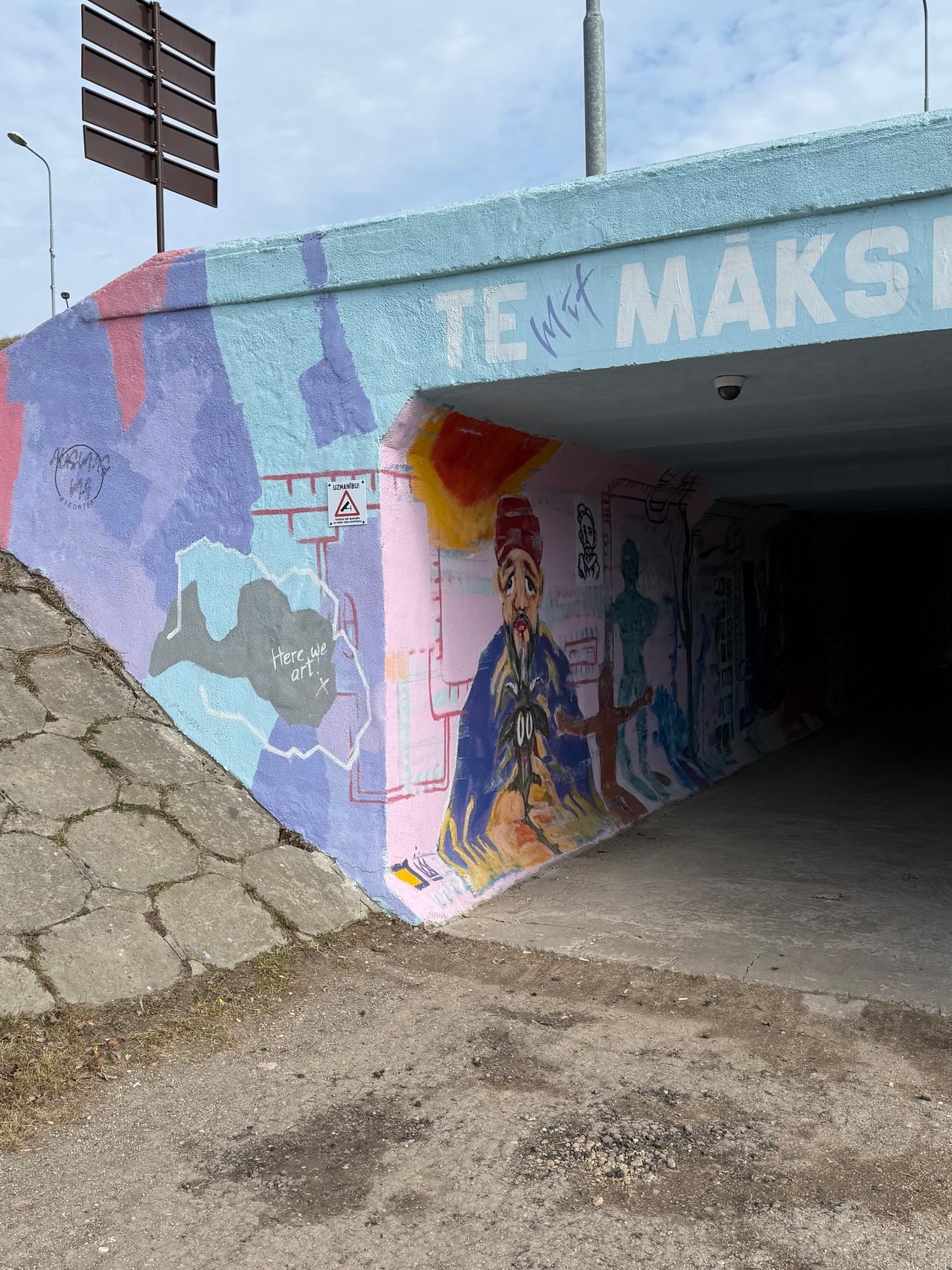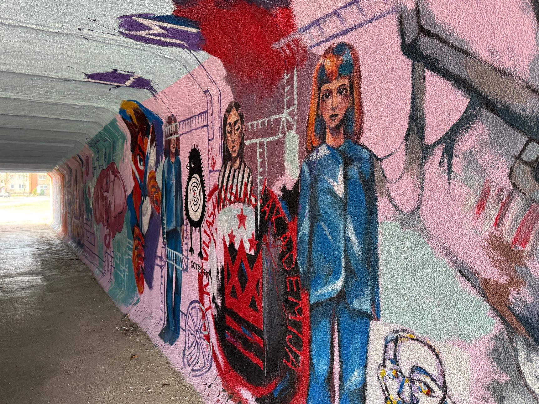 The artwork was created as part of a community participation project. Students, together with their painting teacher made the tunnel walls visually appealing, thereby making the place more enjoyable. It is a place where young people can gather and find inspiration. The artwork was created by four students from Art Academy of Latvia branch of Latgale during their artistic practice.