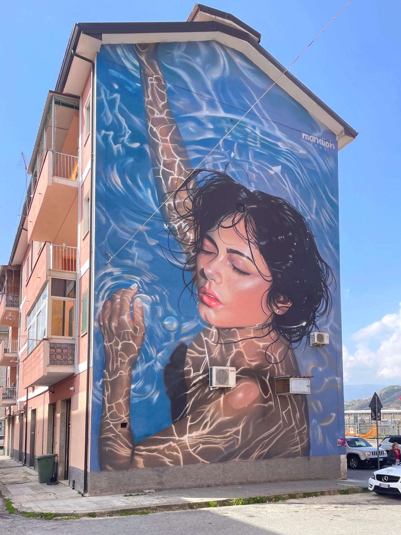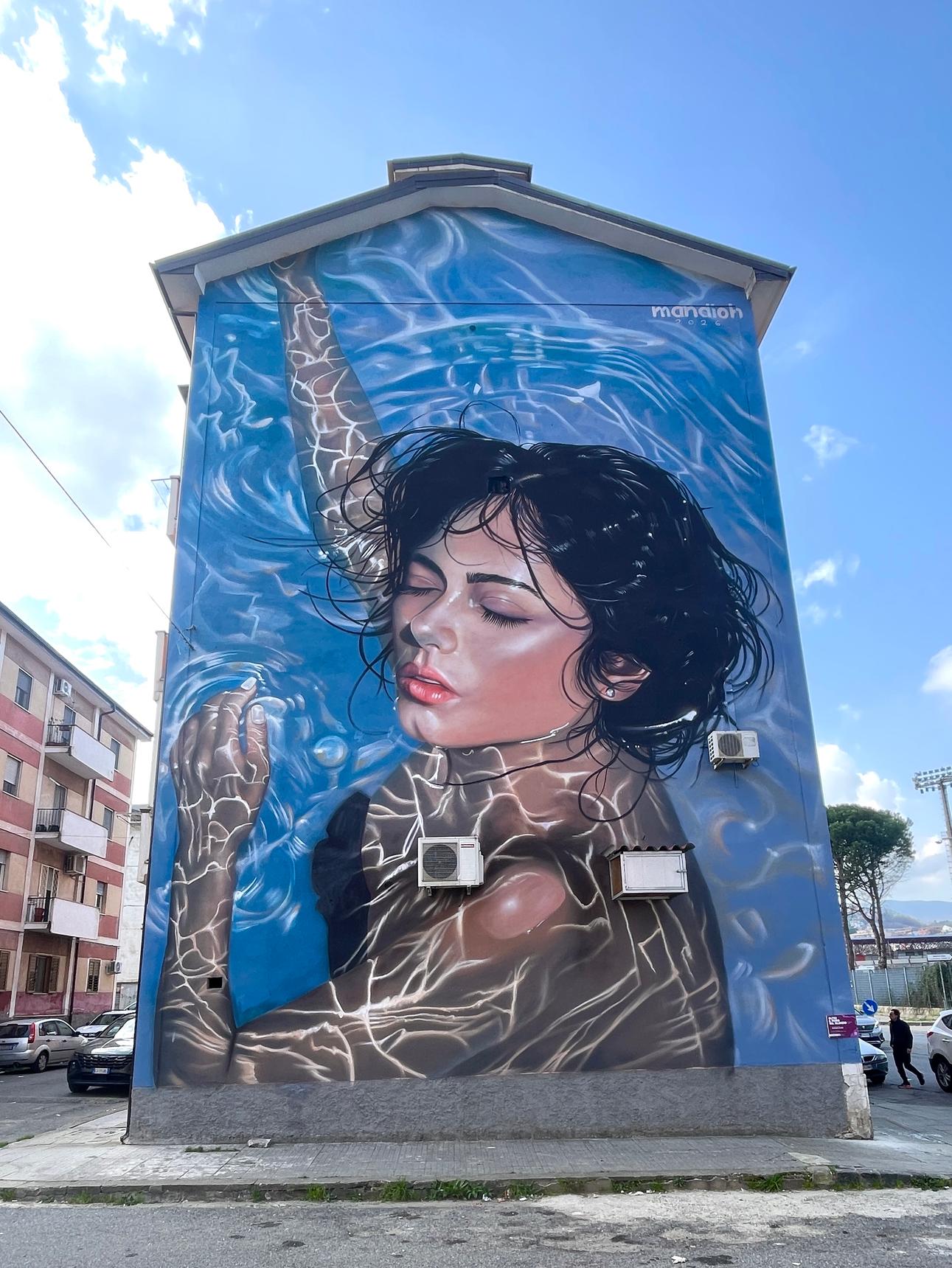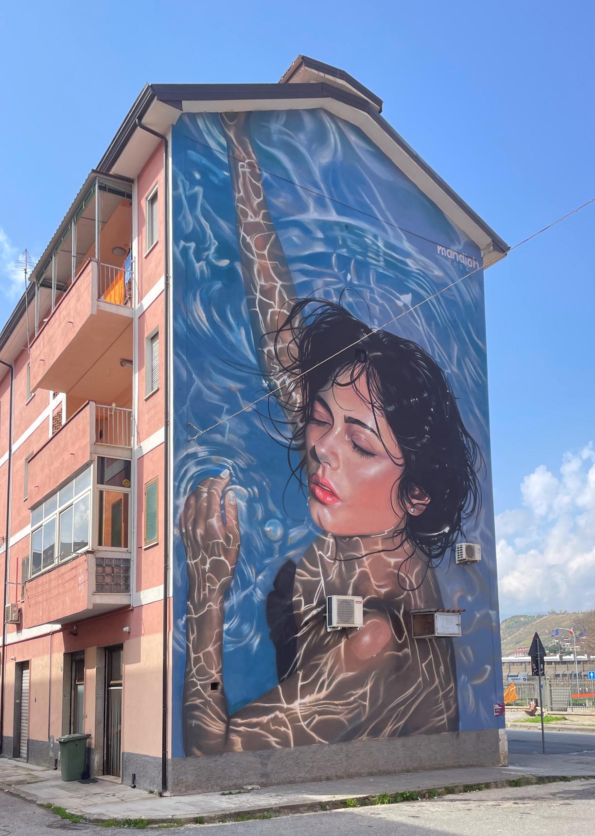 This wall talks about violence against women, subtly the woman portrayed is breathing after being underwater.