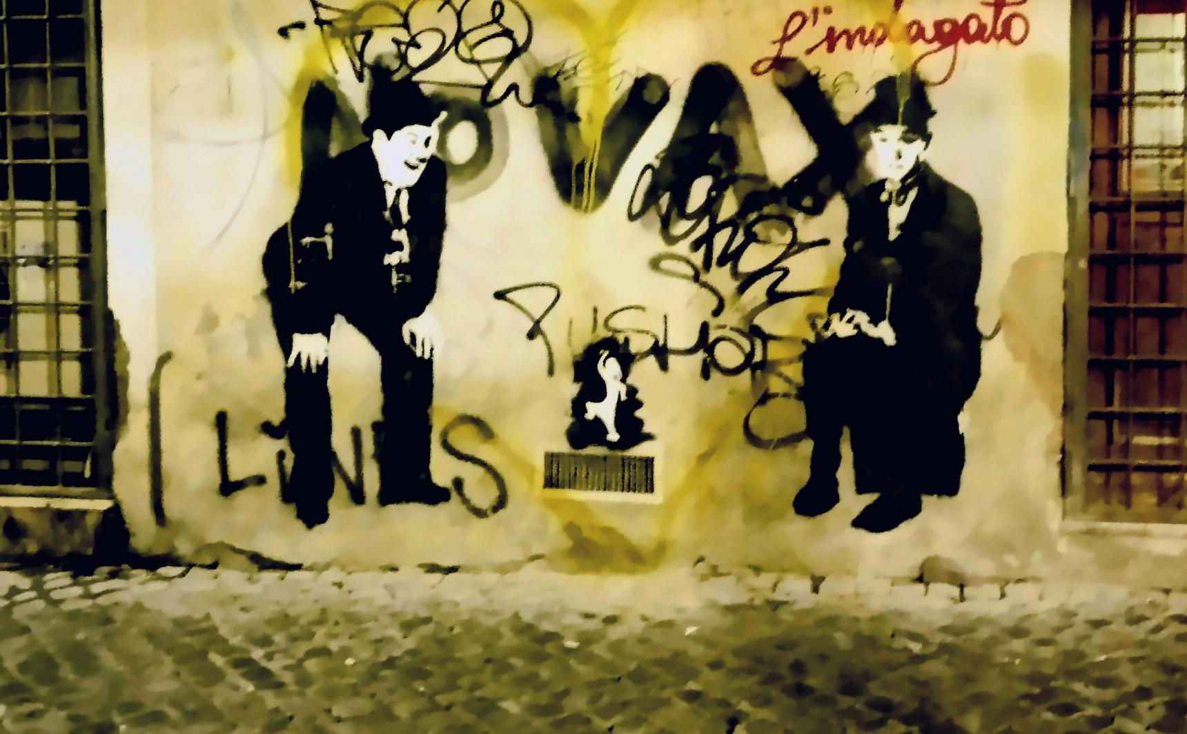 Street art intervention in Rome, featuring stencil figures interacting with the existing urban surface. The artwork is integrated into the historical city context, with layered graffiti and street textures forming part of the composition.