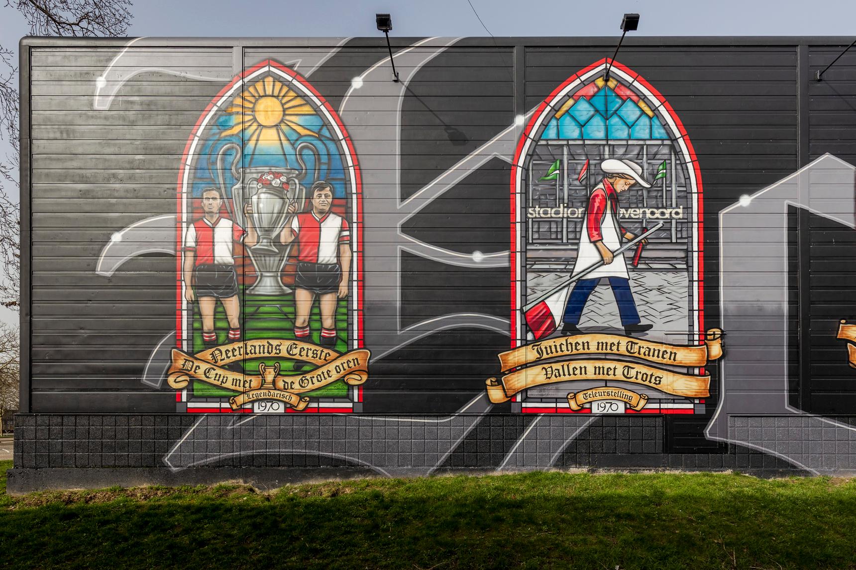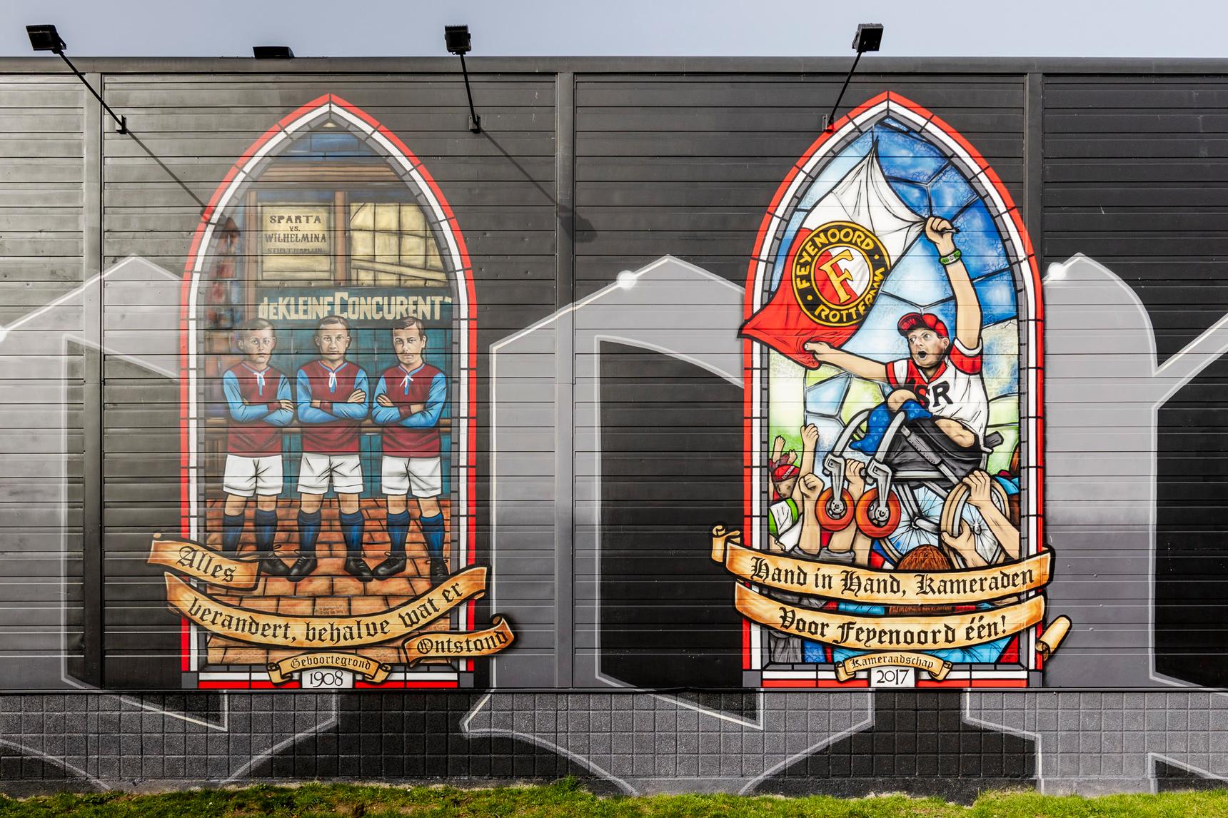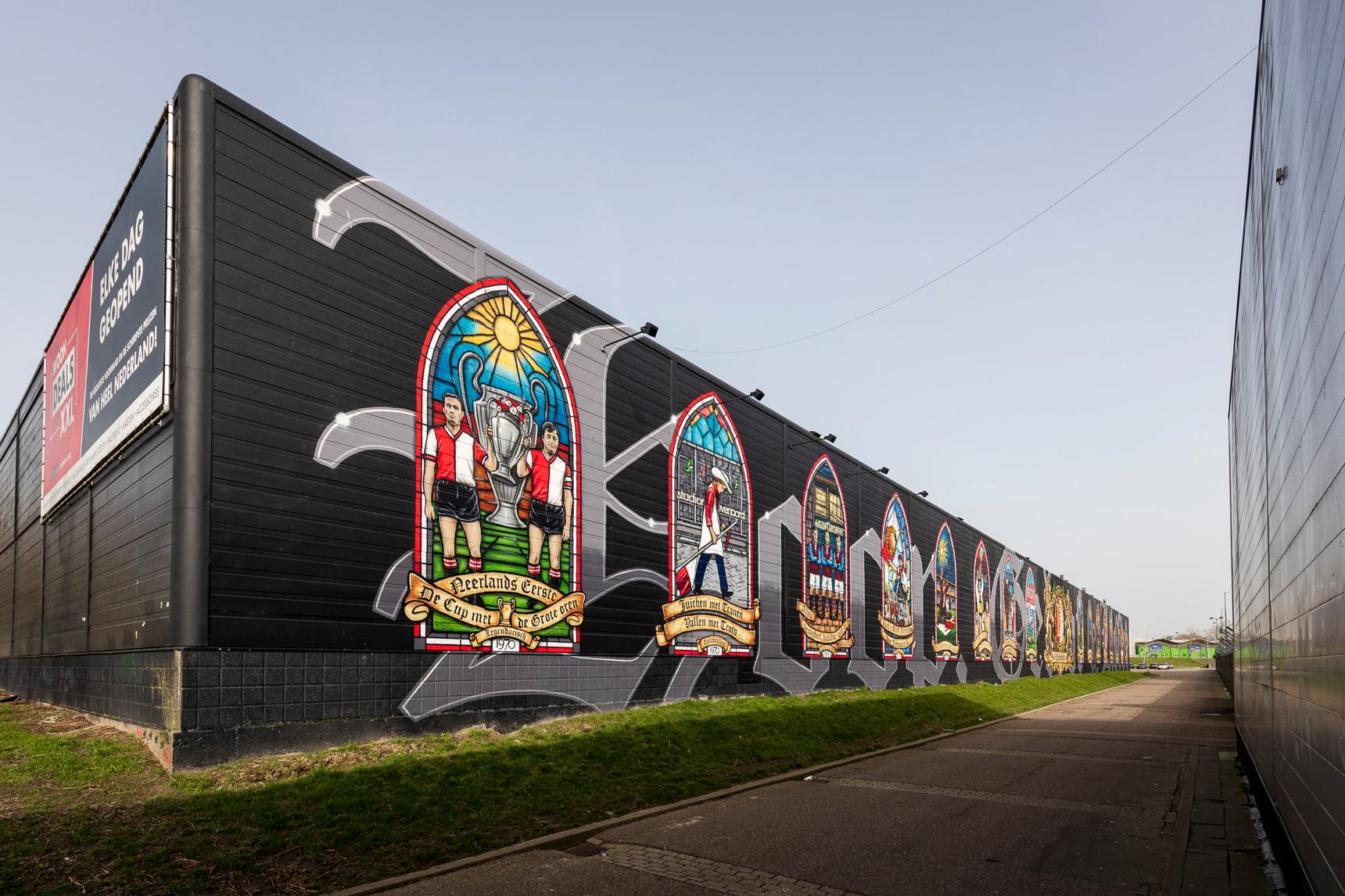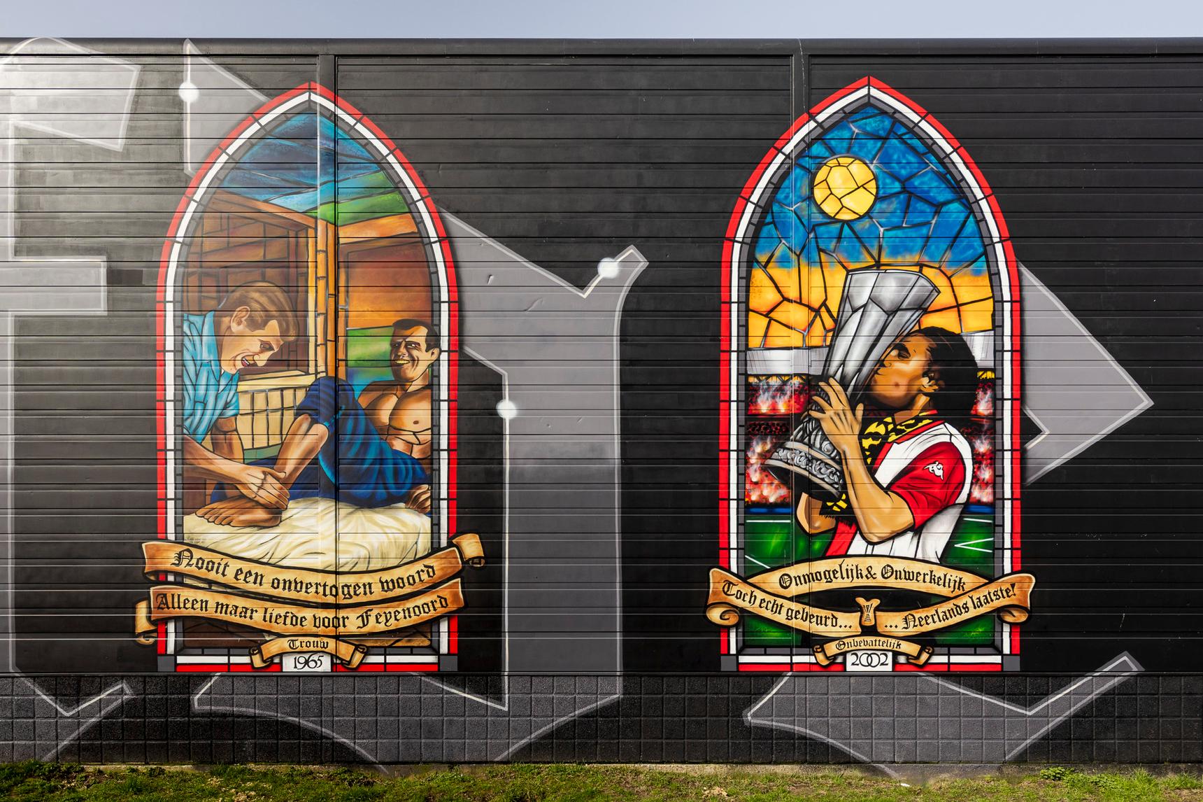 Deze - zeer - grote muurschildering direct naast het stadion vertelt de geschiedenis van Feyenoord aan de hand van 16 glas-in-loodramen. Elk raam heeft een eigen verhaal; een cruciaal moment in de clubgeschiedenis, supportersmomenten of iconische clubfiguren.