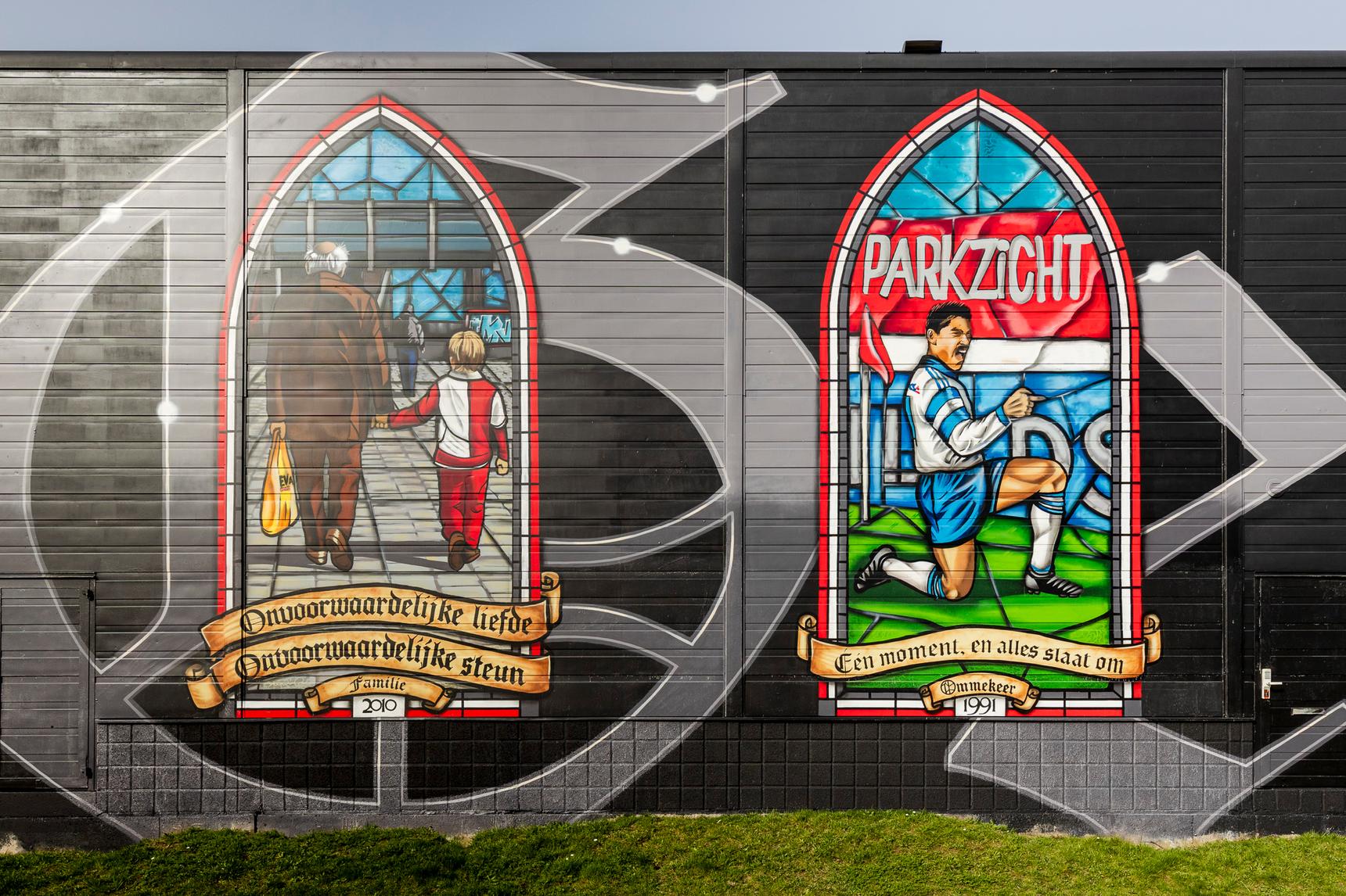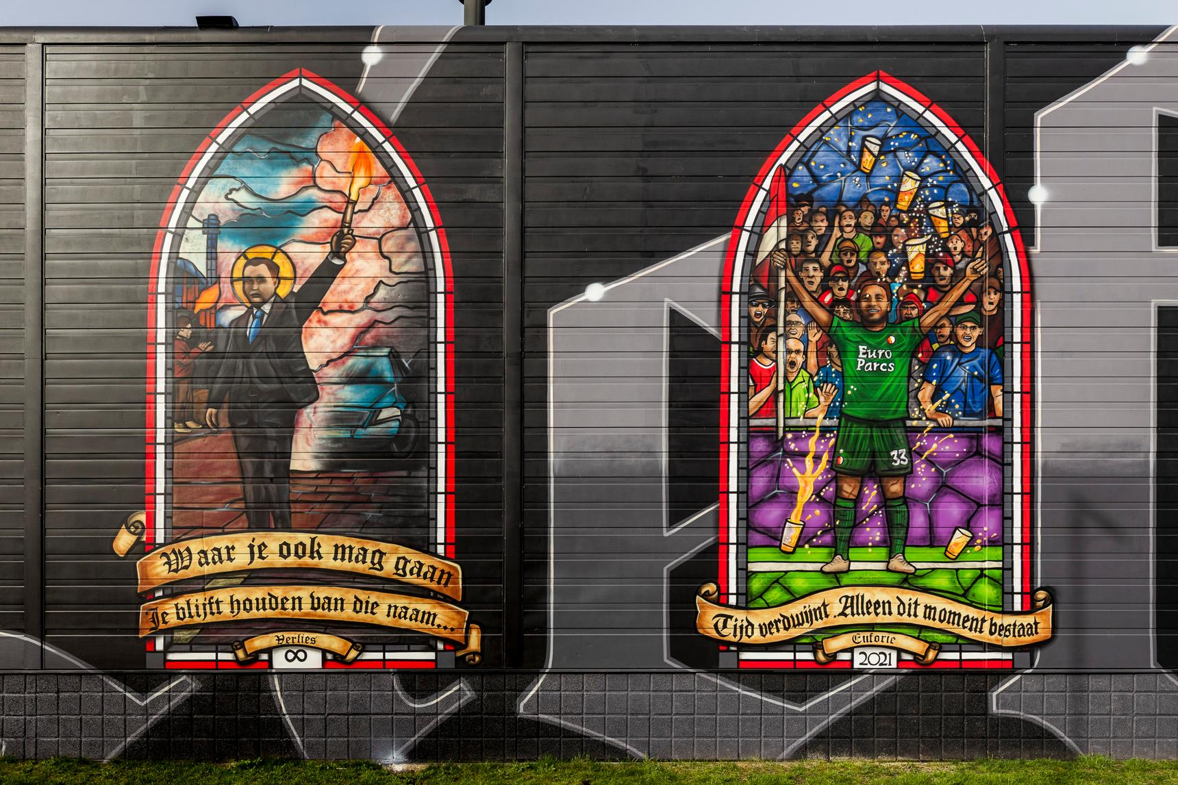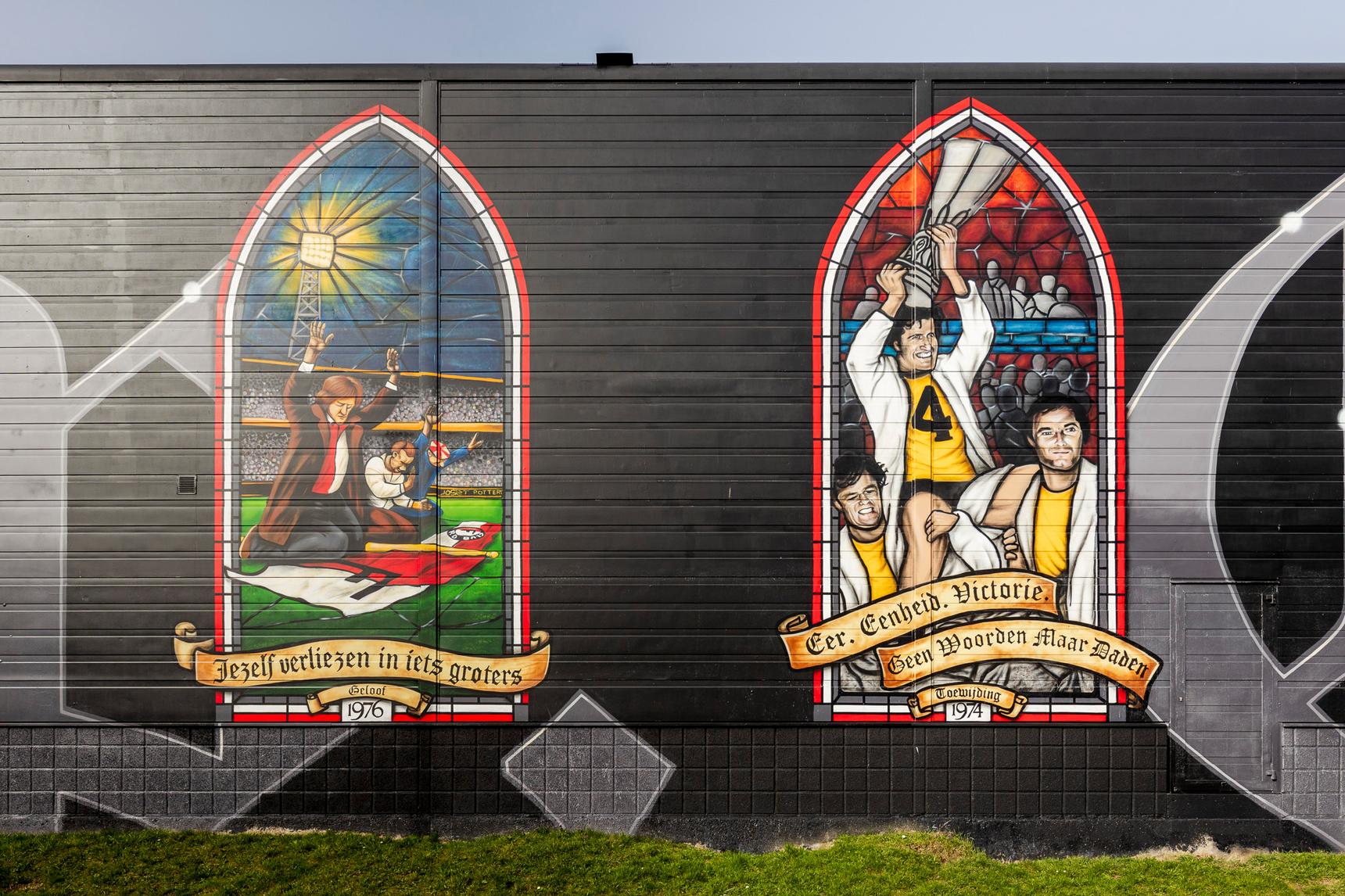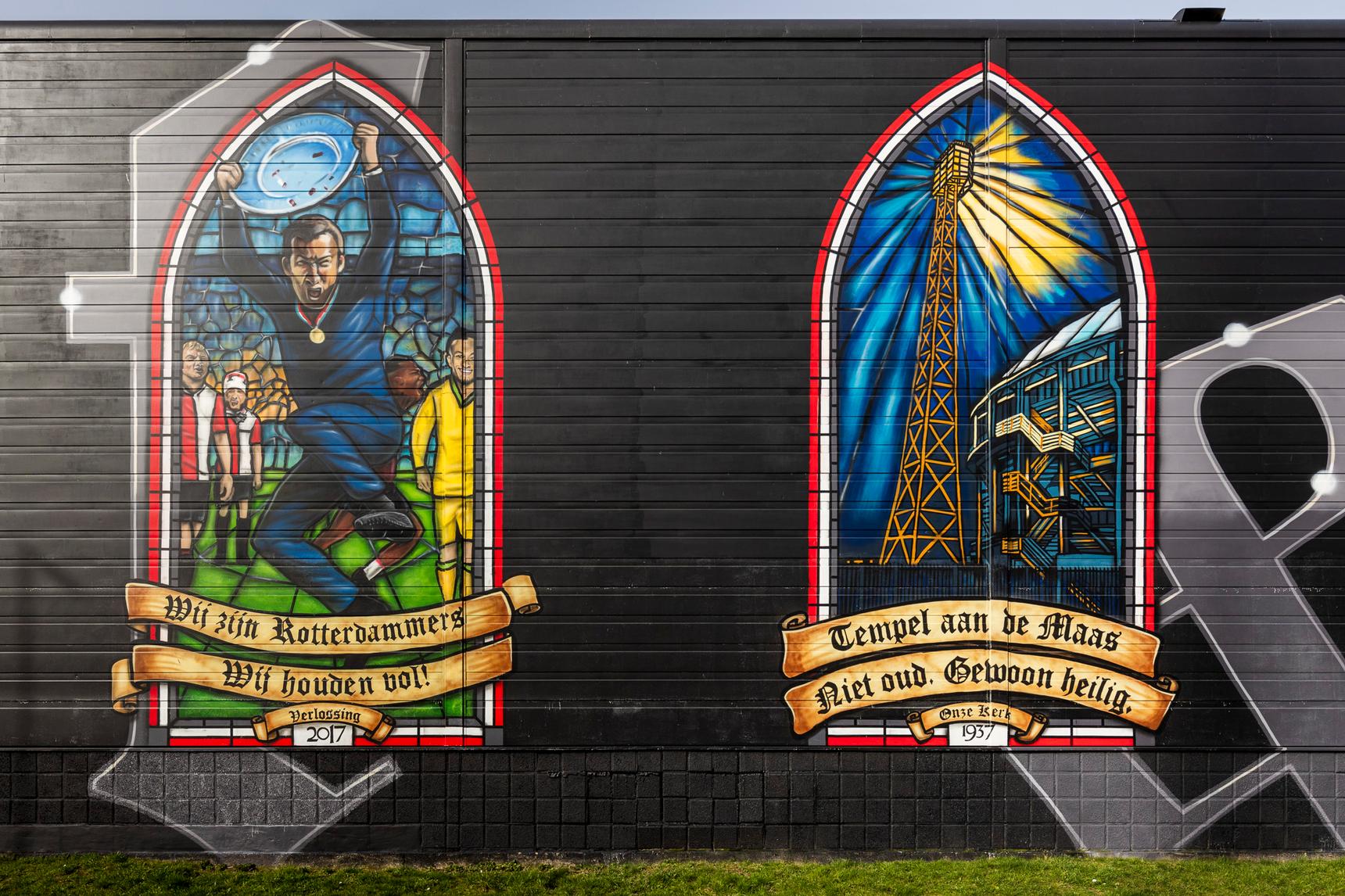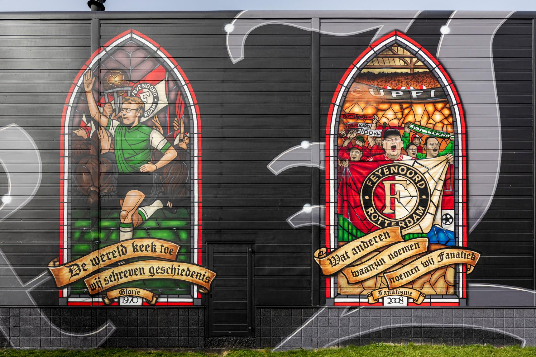 Deze - zeer - grote muurschildering direct naast het stadion vertelt de geschiedenis van Feyenoord aan de hand van 16 glas-in-loodramen. Elk raam heeft een eigen verhaal; een cruciaal moment in de clubgeschiedenis, supportersmomenten of iconische clubfiguren.