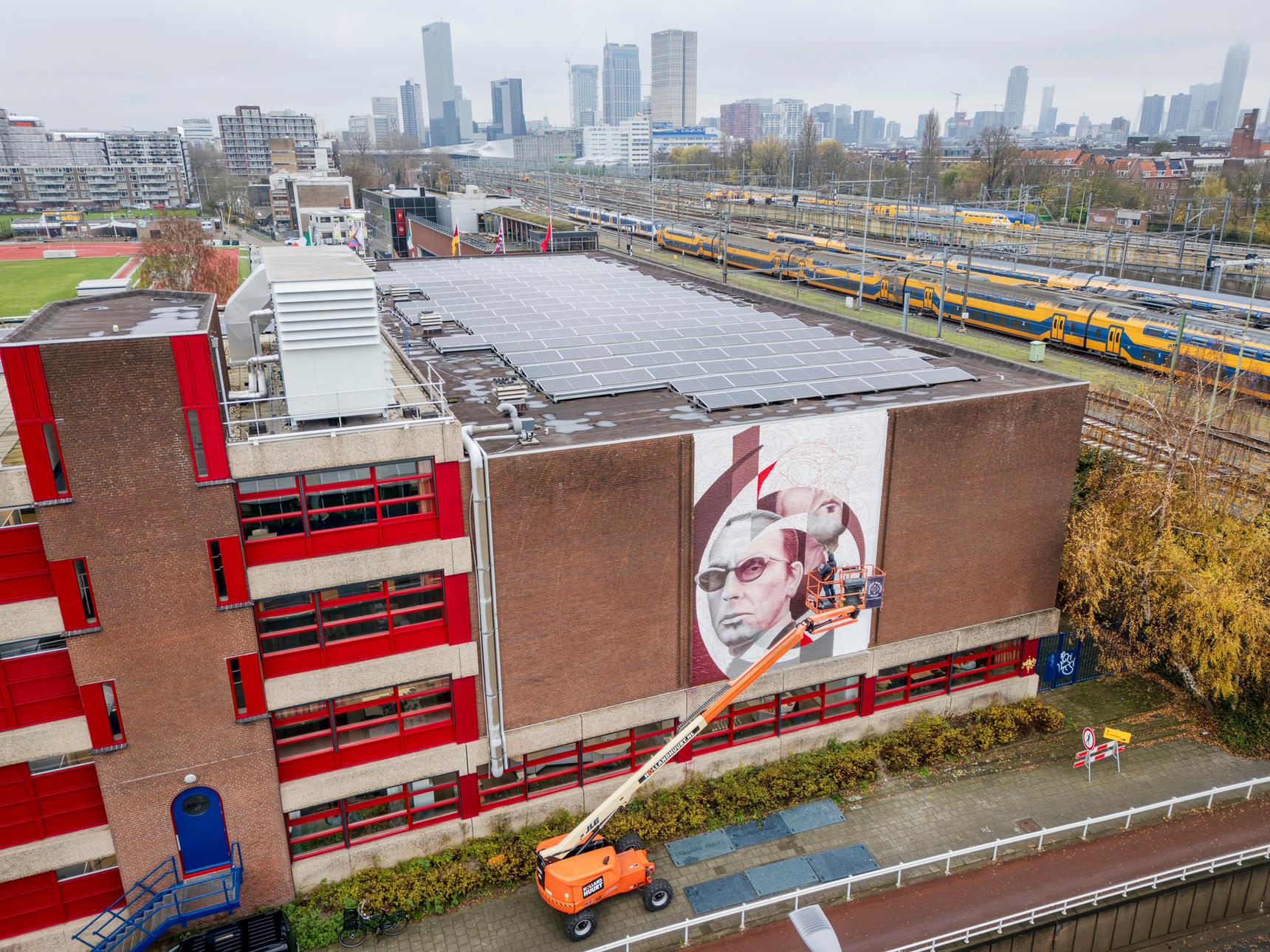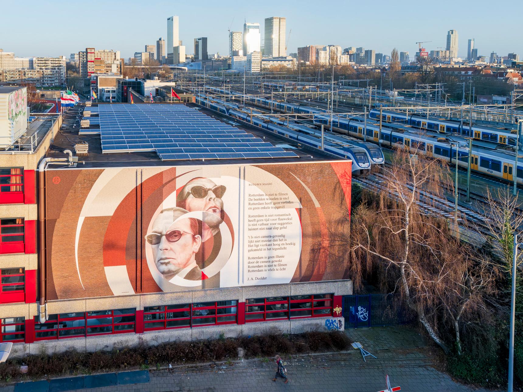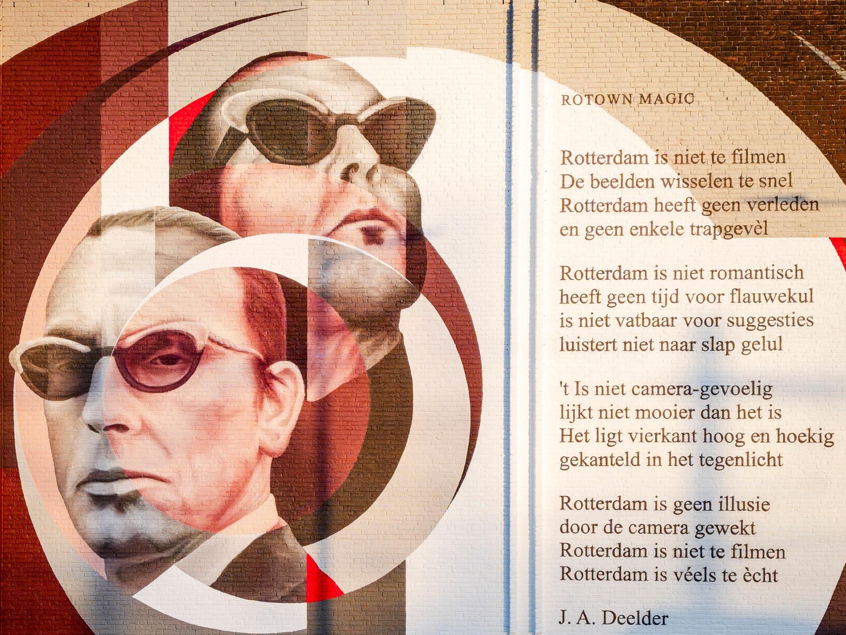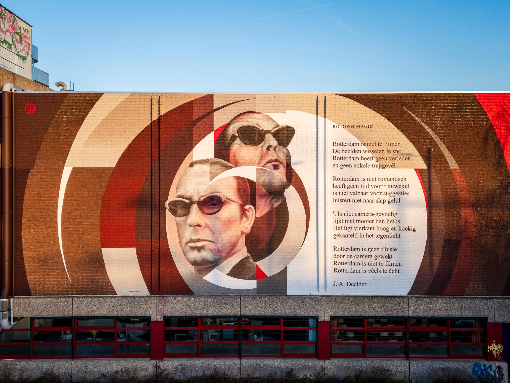 This mural is an ode to famous Rotterdam poet Jules Deelder (1944-2019). Besides his portrait, it shows one of his famous poems "Rotown Magic" from 2004. Deelder was a true Rotterdammer, with his hart on his sleeve, which was also a big theme in his poetry. Besides his poetry, he was a well know figure in the nightlife and cultural sector in the city, dubbed "mayor of the night".