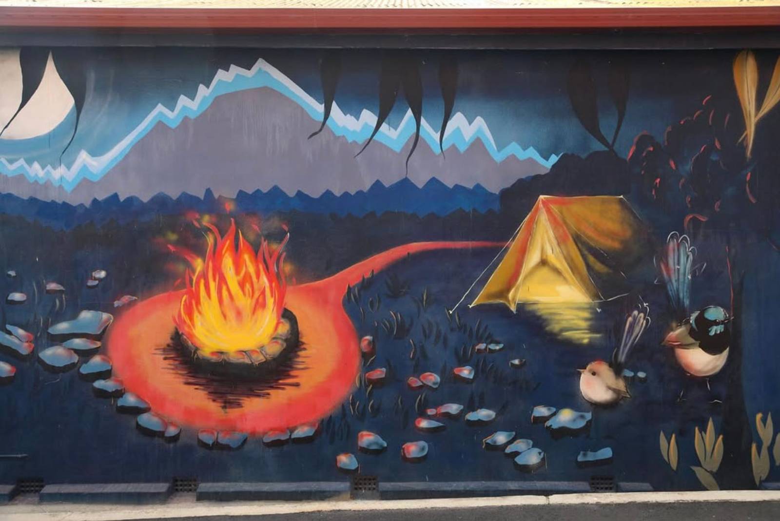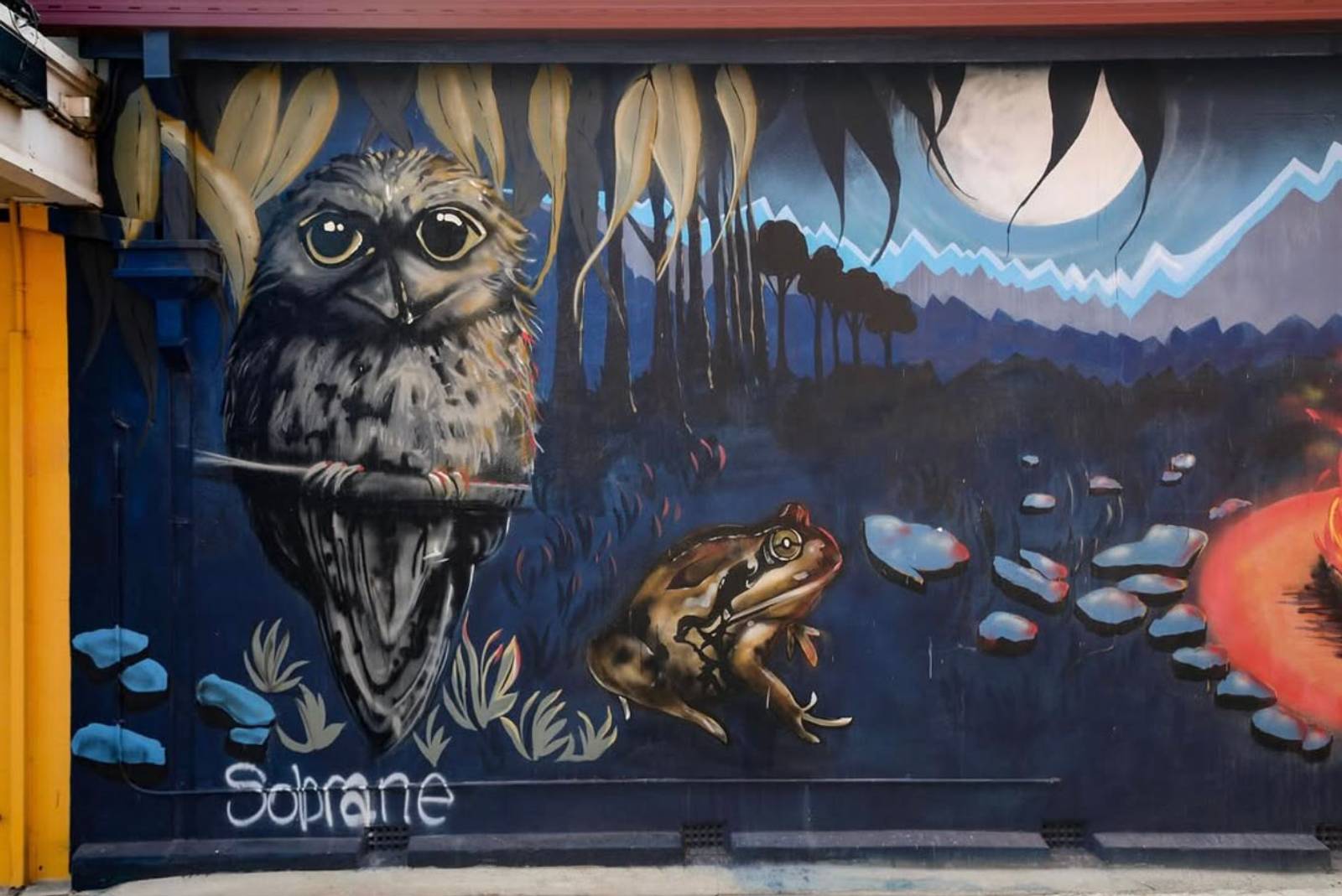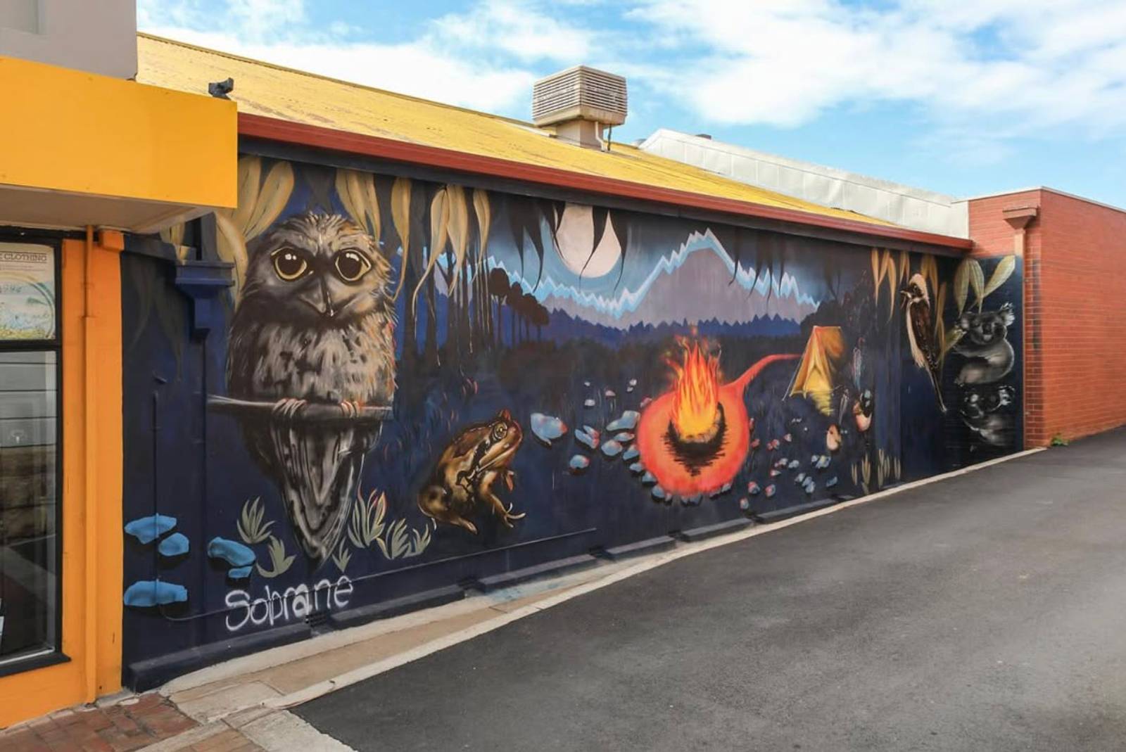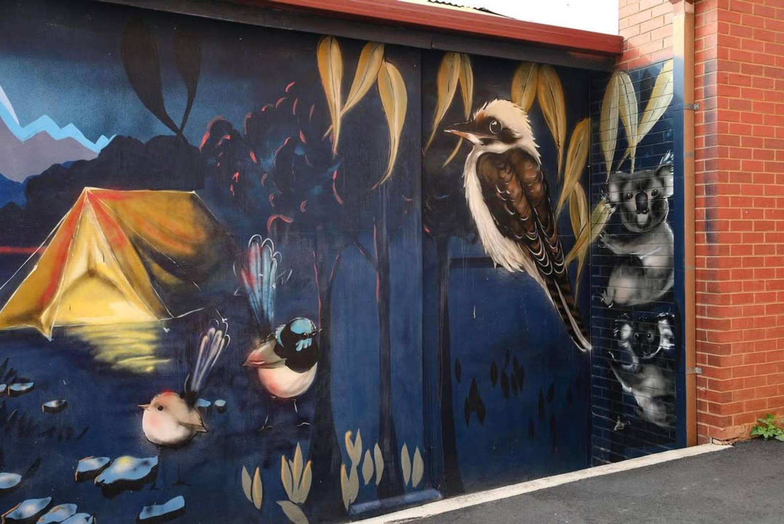 A lovely mural from Sobrane in Wangaratta featuring a lovely Tawny Frogmouth, Kookaburra and Koala.