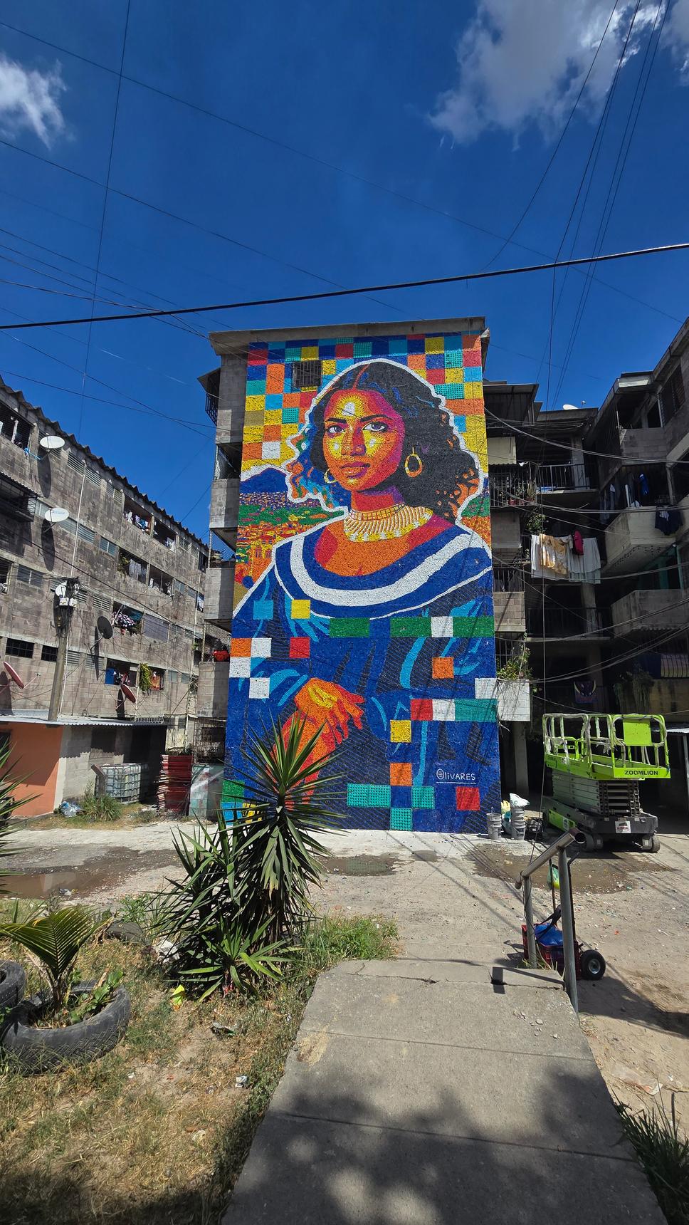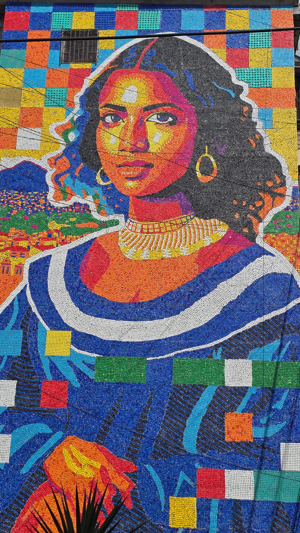 The mural’s warm palette, sun‑kissed face, and colorful background of homes and mountains celebrate Latin American identity while giving new life to plastic waste. Rising in a neighborhood once marked by gang violence, the artwork stands as a symbol of renewal, community effort, and the creative potential hidden in everyday materials.