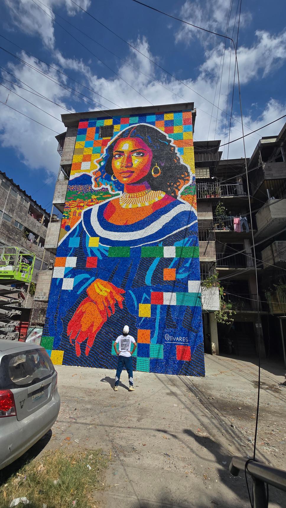A vibrant 13‑meter mural made from more than 100,000 recycled bottle caps now transforms an apartment building in Zacamil, Mejicanos (El Salvador). Created by Venezuelan artist Oscar Olivares together with CMS Foundation, Full Painting, and Asonares, the work reimagines the Mona Lisa as a modern Latin American icon. Inspired by Leonardo da Vinci and the pointillist techniques of Paul Signac, Olivares replaces paint with caps collected, washed, and sorted by local residents over several months.