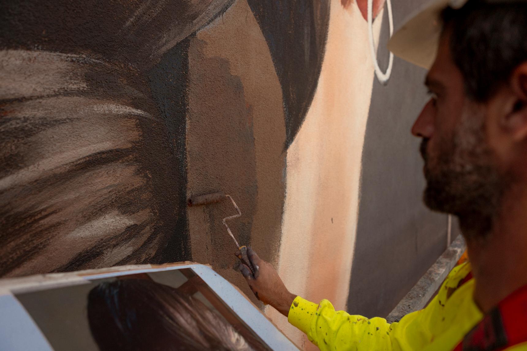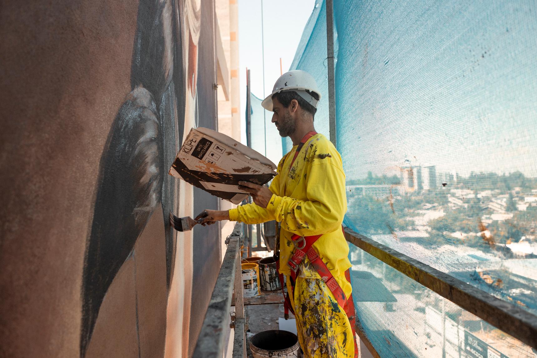 Light plays a central role in Florida. The figure emerges from a soft darkness, a chiaroscuro that lends the mural a romantic, timeless aura. Even at 26 meters tall, the gesture remains subtle, unforced, deeply human.