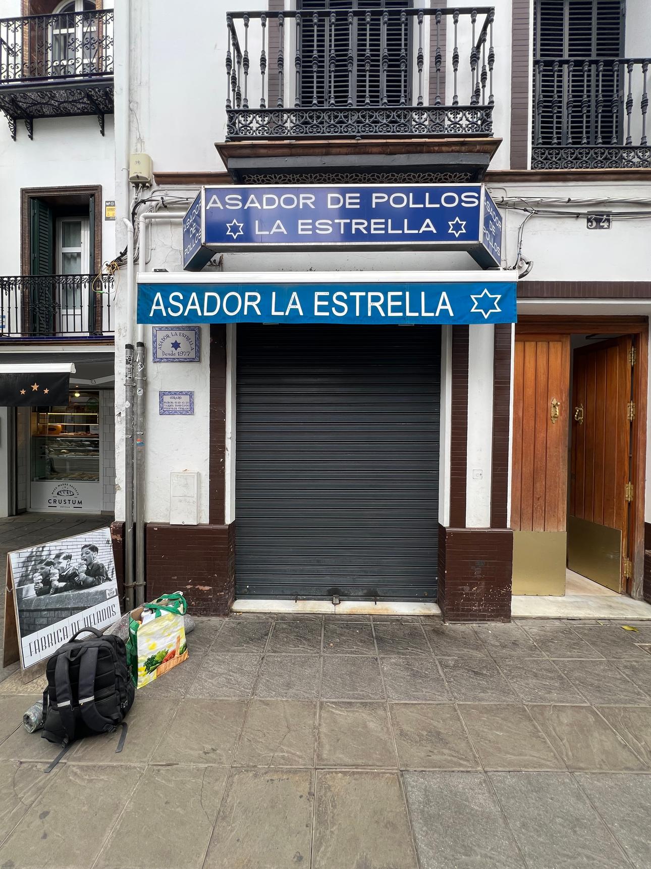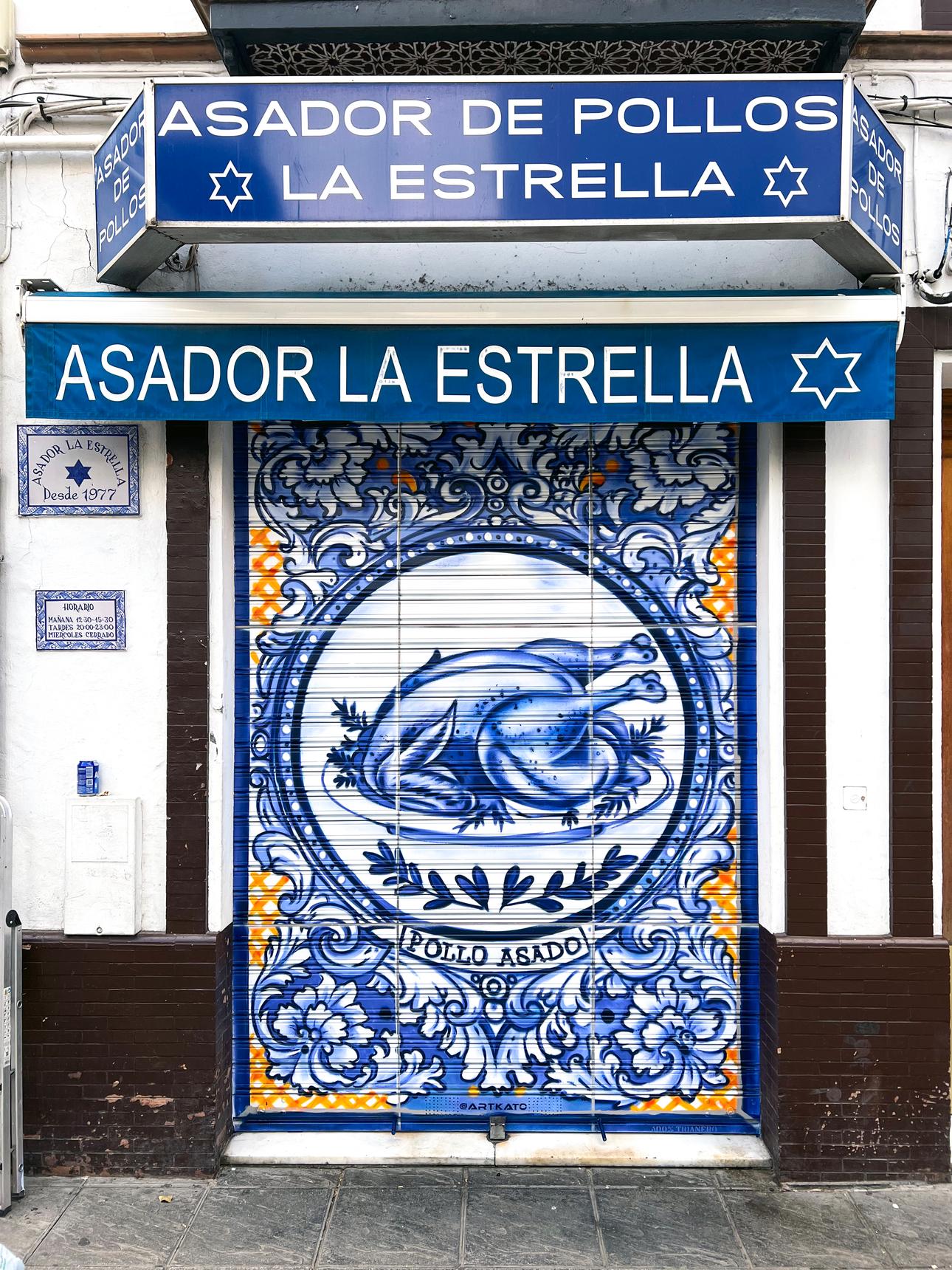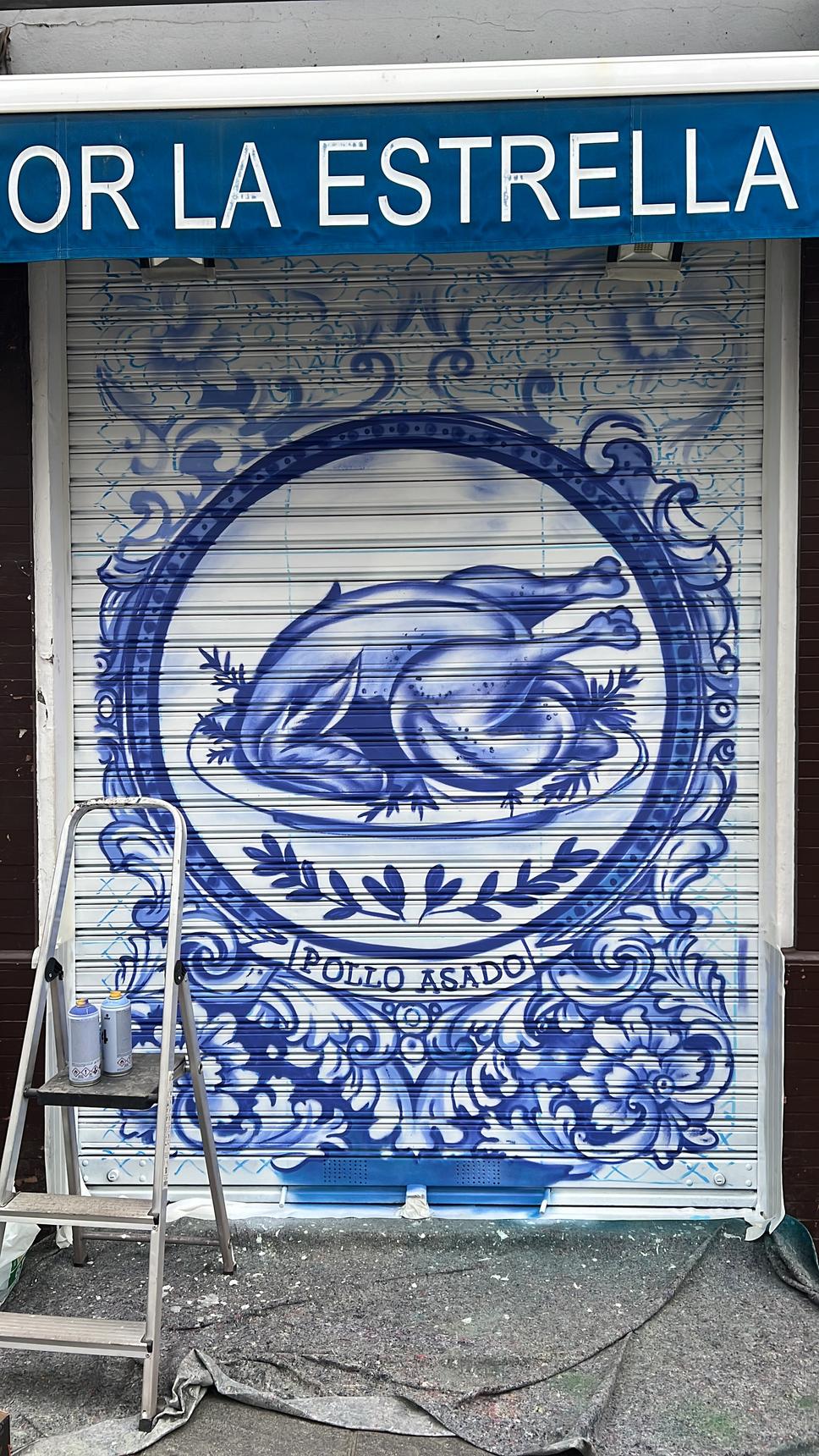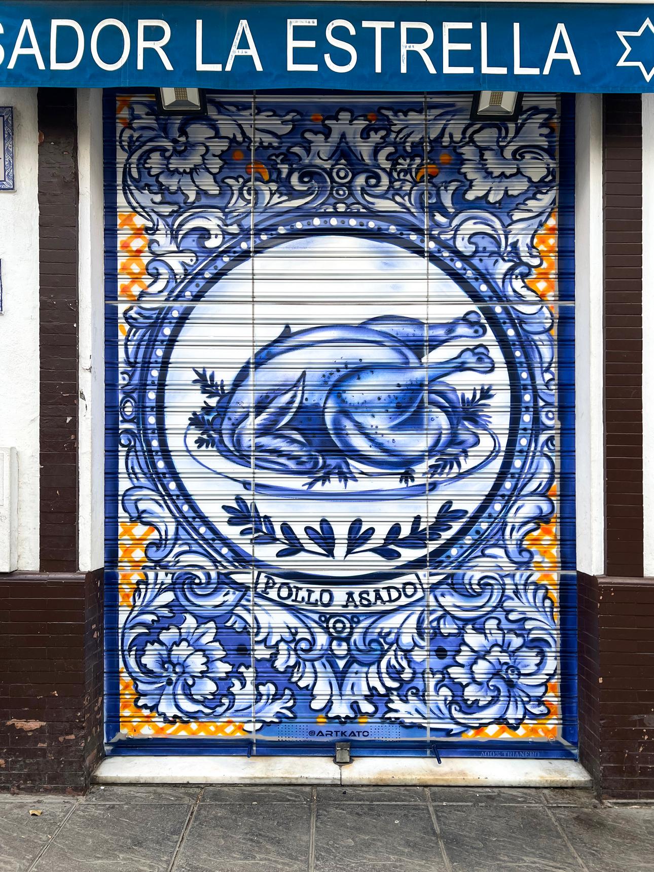The shutter of a chicken shop is decorated with a tile effect, inspired by the tiles in the Santa Ana bar, using the same colors and style.