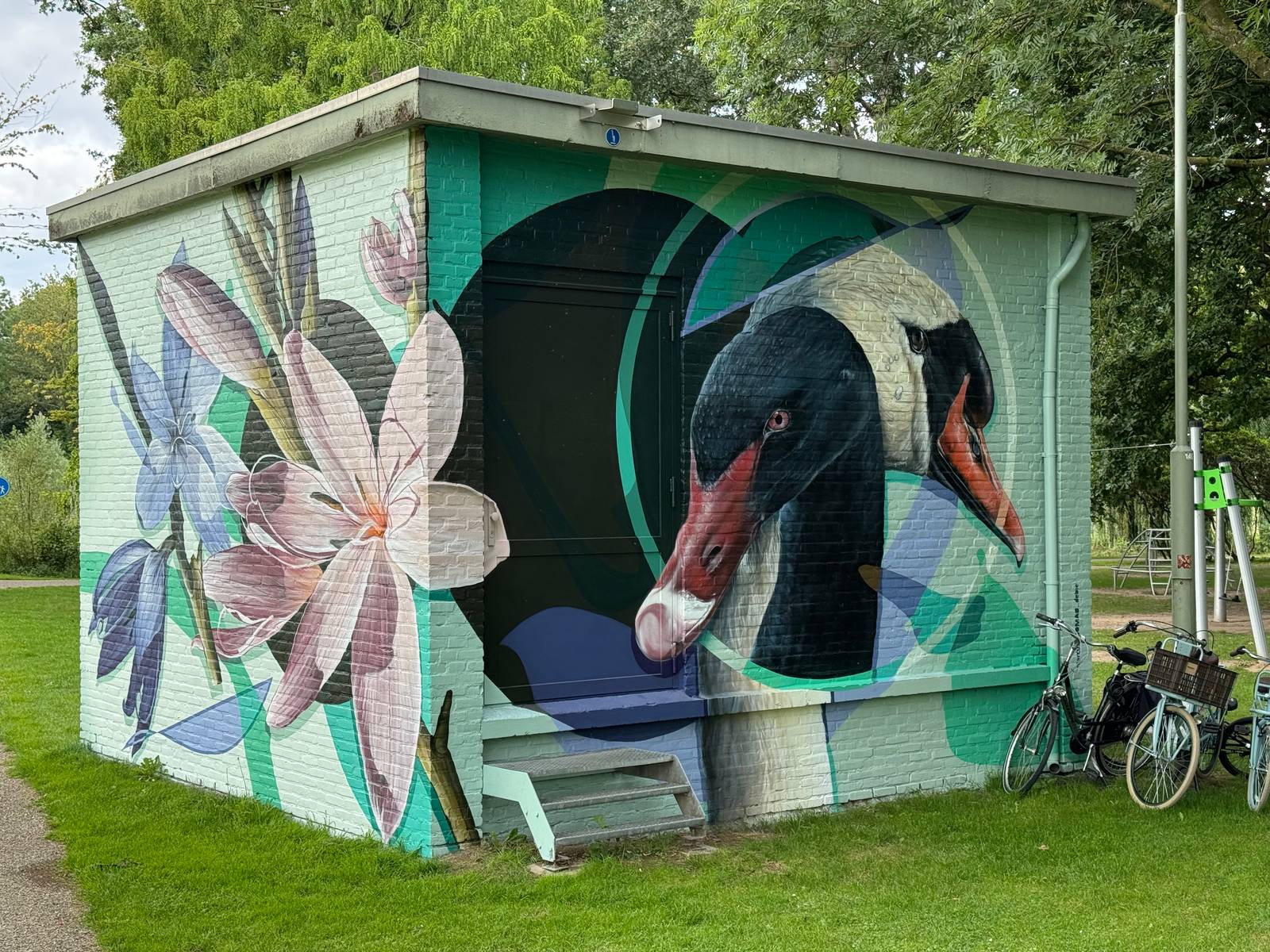This city park is a Dutch national monument and a stunning public space. The dilapidated transformer house of @enexisnetbeheer has been transformed with a nature mural themed “Pond” on all 4 sides.