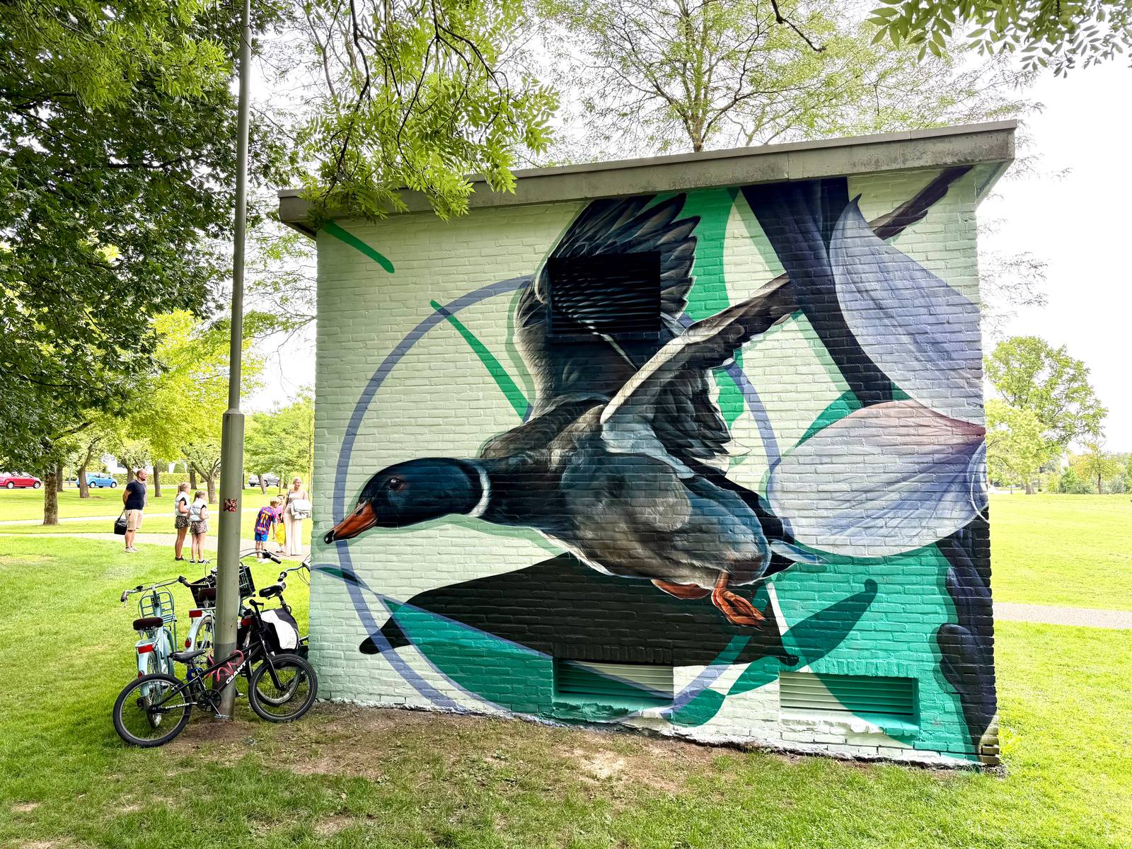 Originally designed by the late landscape architect Tersteeg as a people’s park, the city park features a characteristic interplay of straight and curved lines. This design language is subtly reflected in the mural, combined with soft green and violet tones. Waterfowl and pond plants complete the mural concept.