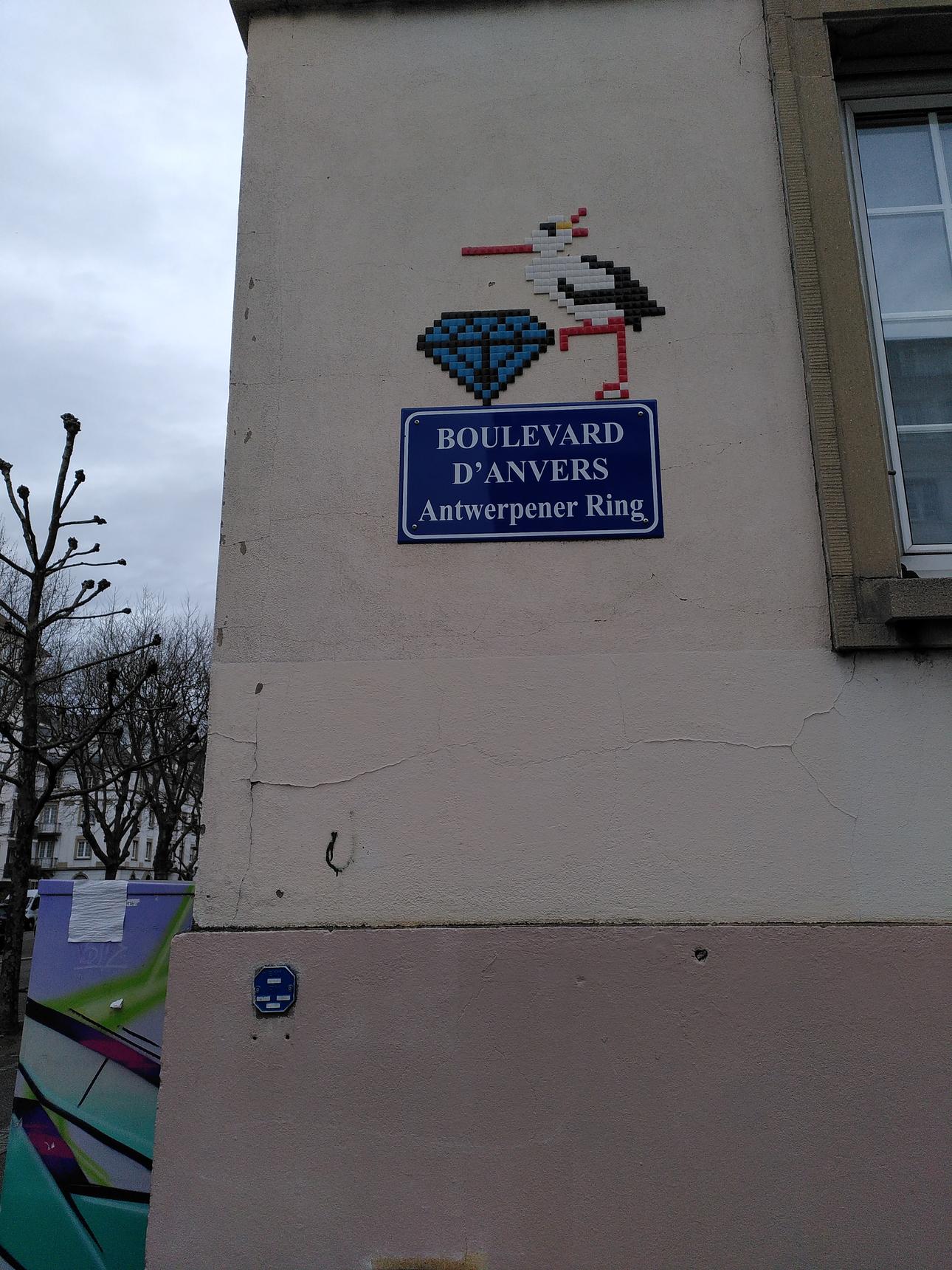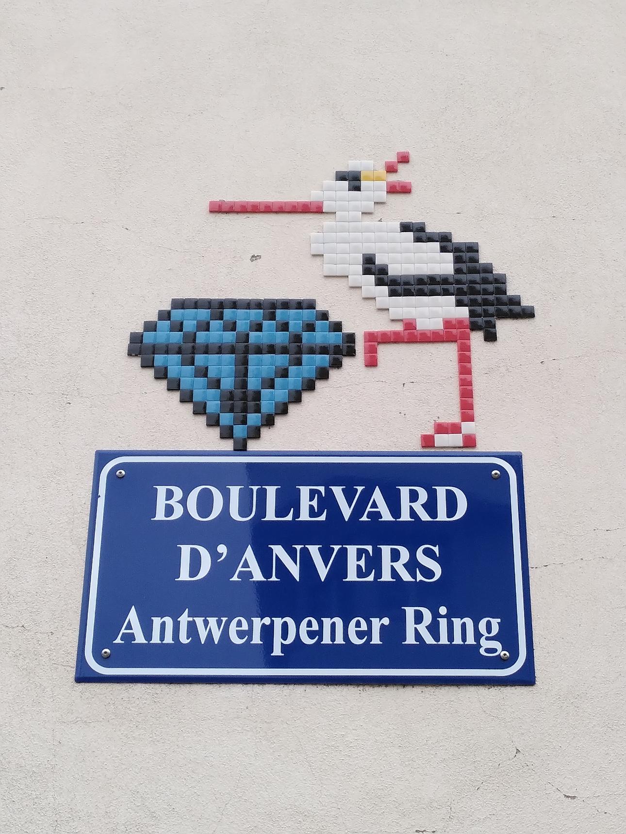 A stork with a diamond, referring to the street name, Boulevard of Antwerp, highlighting Antwerp as the world capital of diamonds.