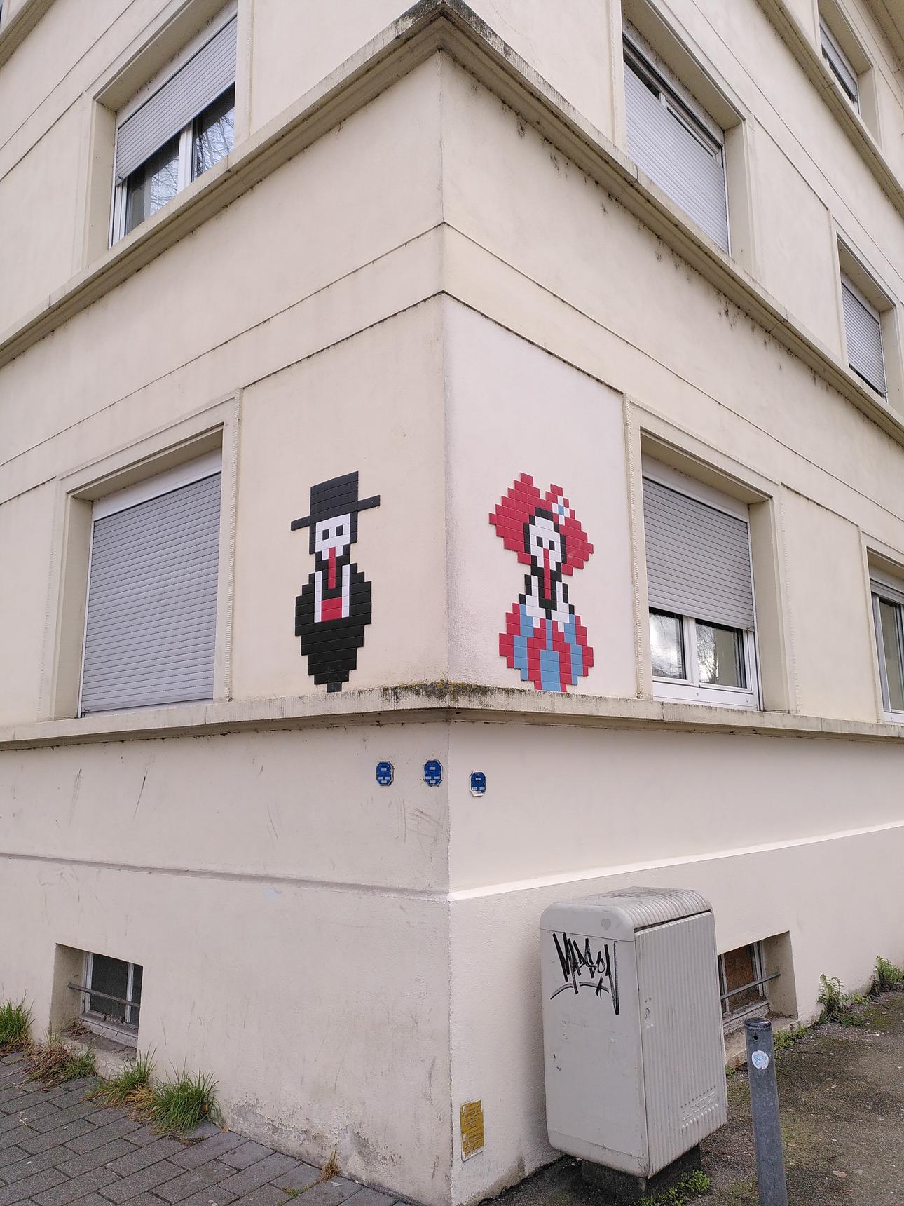 A couple of storks dressed in traditional Alsatian costume. Left male and right female.