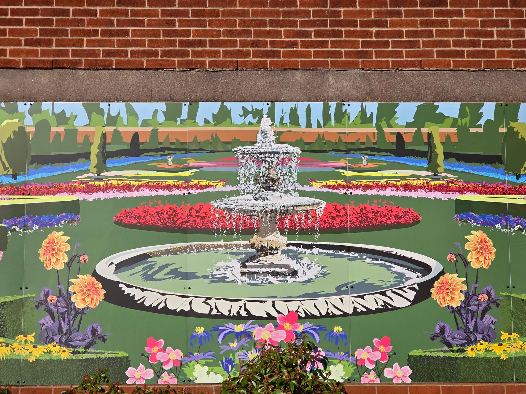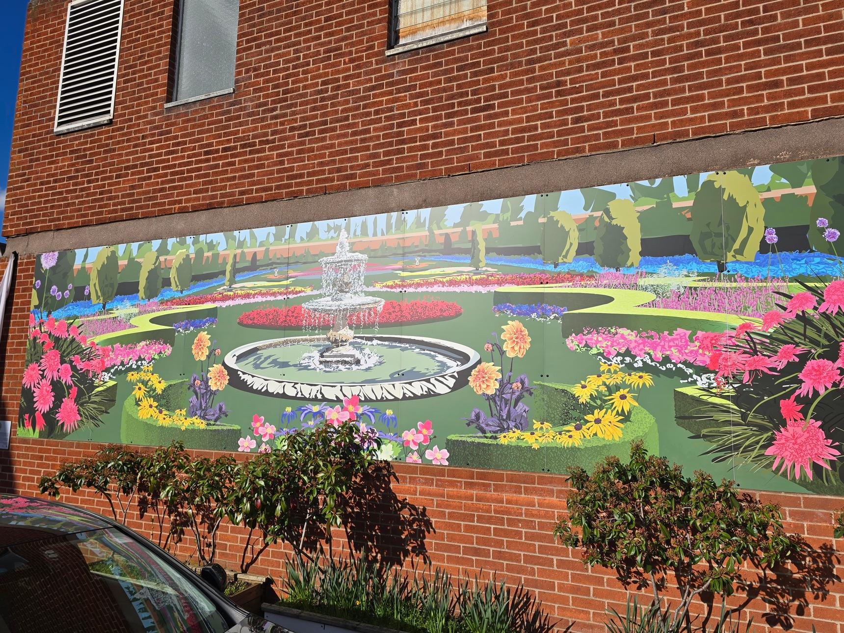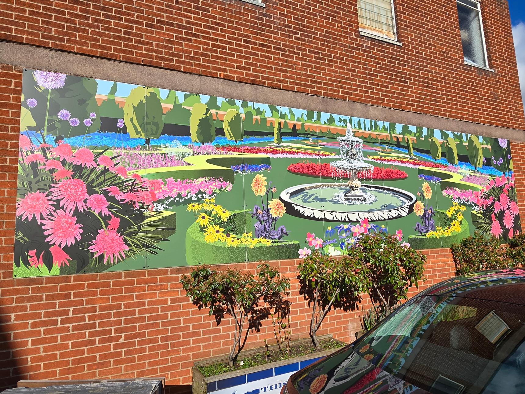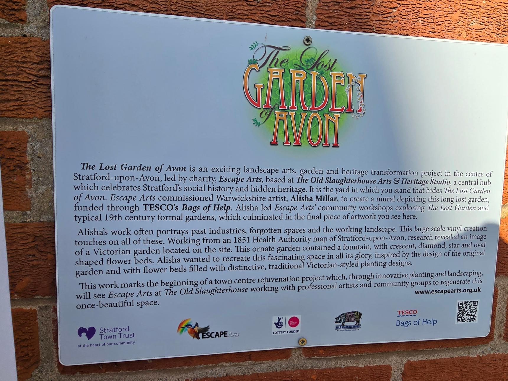 This artwork by Alisha Millar, depicting the lost garden of Stratford-upon-Avon, has been printed on board and mounted on a wall near the Escape Arts centre.