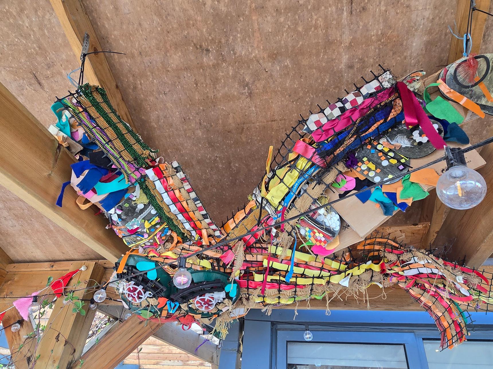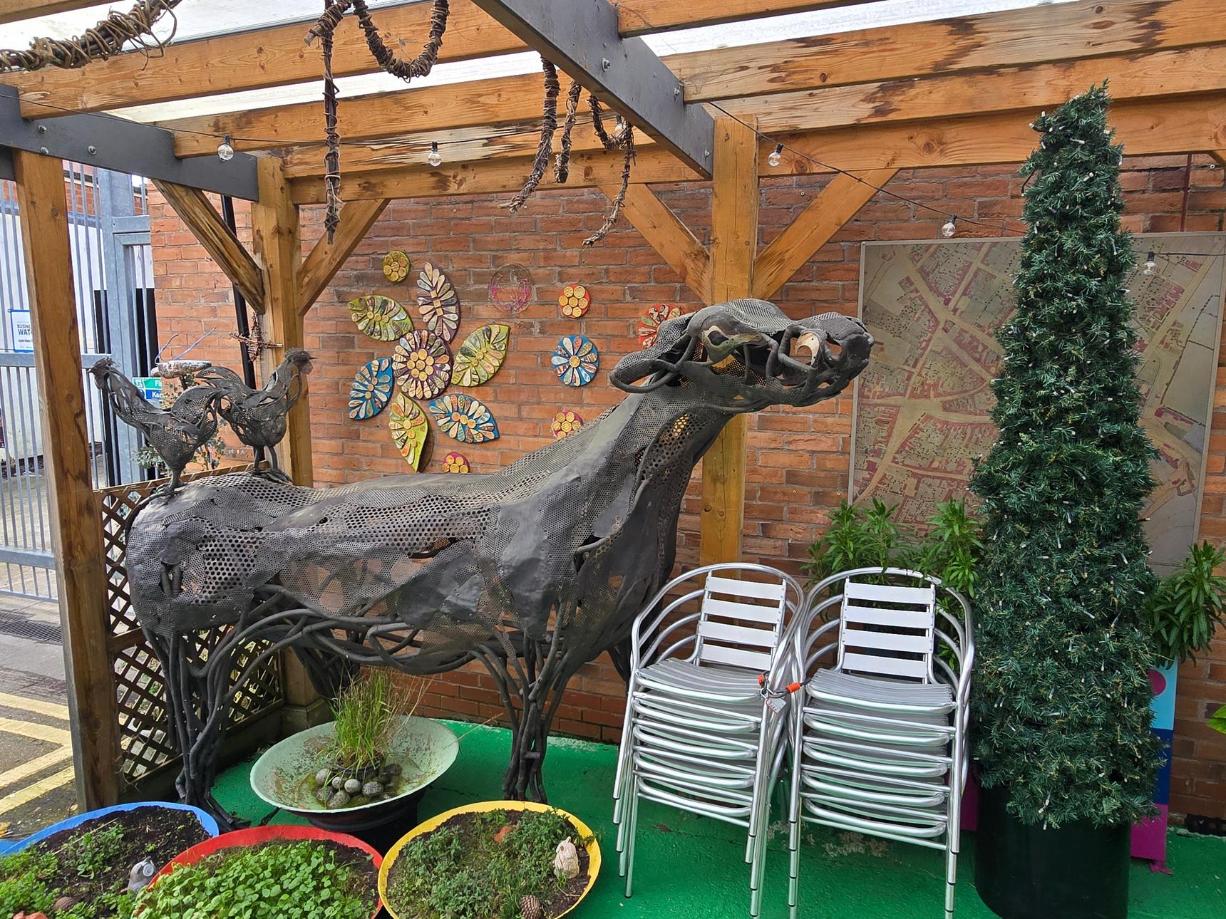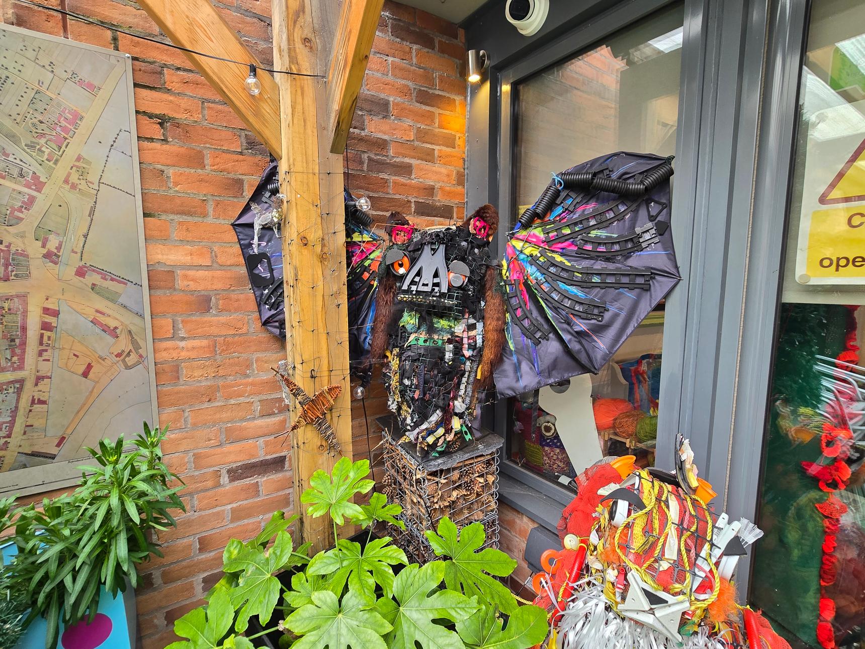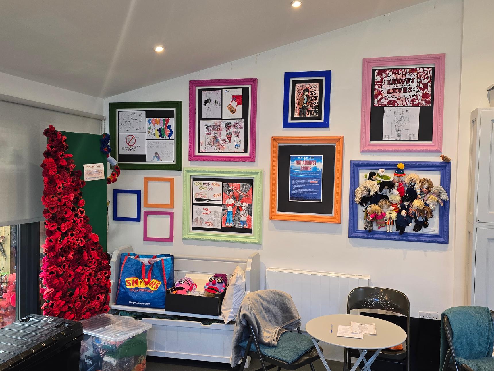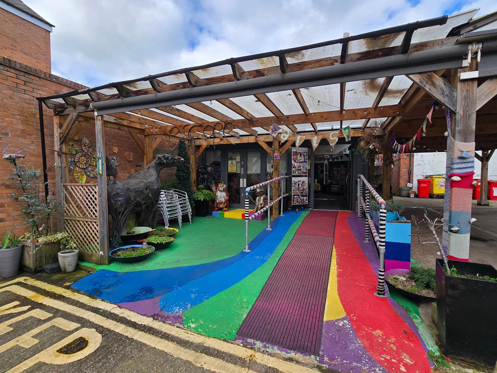 If you come on a day they aren't open, there is still a lot of artwork to see outside the building, created by Escape Art volunteers and the community they support. The colourful rainbow walkway outside was painted by Brink Contemporary Arts.