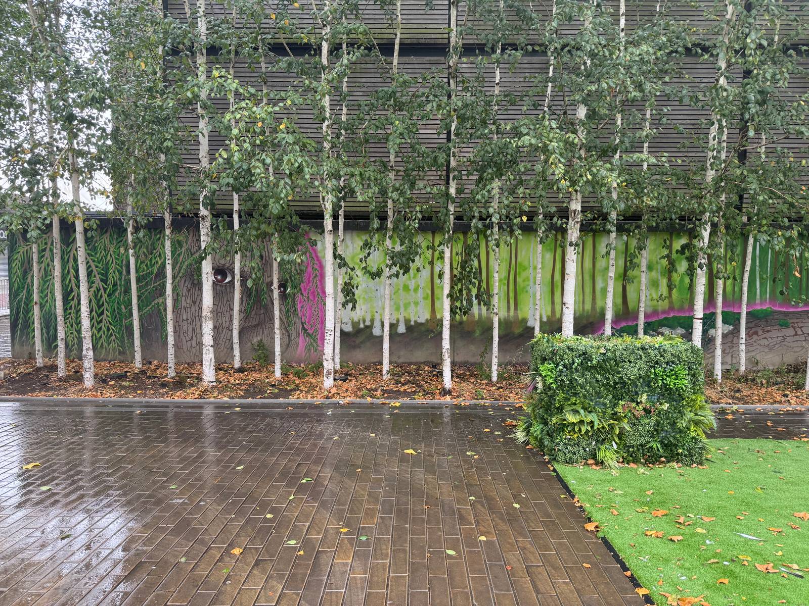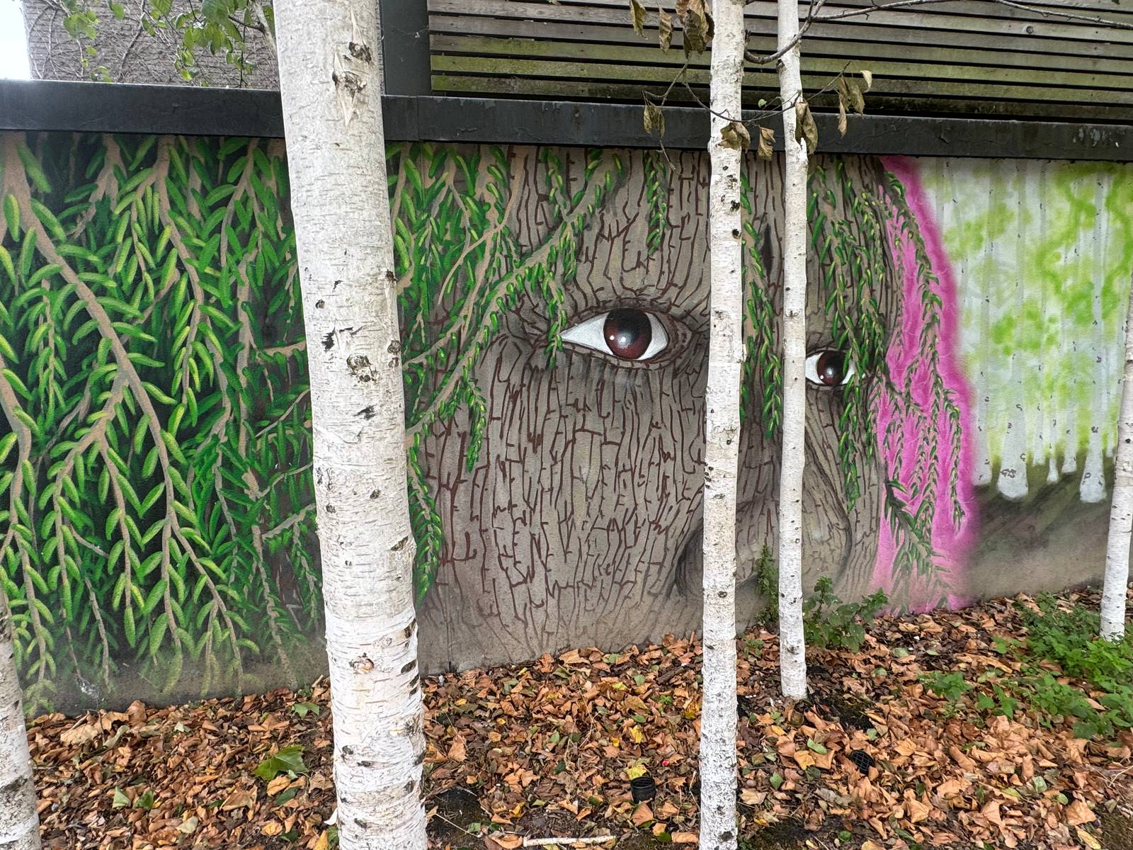 This very long collab wall from the artists (together known as Lyra sierra) blends the environment into the piece as the silver bark of the trees in front of the piece melt into the visage of Mother Nature as her outstretched arm delivers the geometric colour burst of the flower of life. Spanning the four seasons this work is truly epic and beautiful.