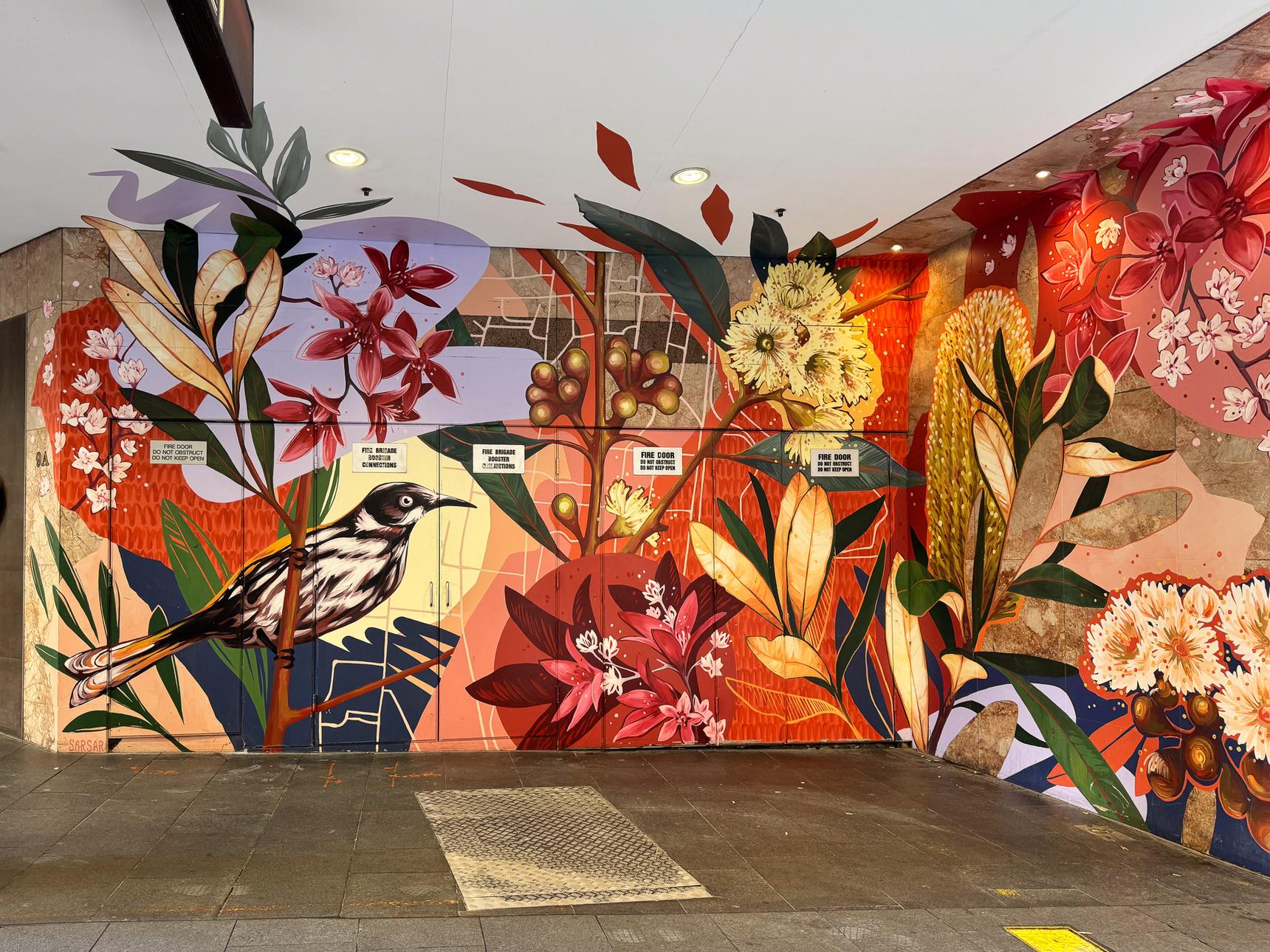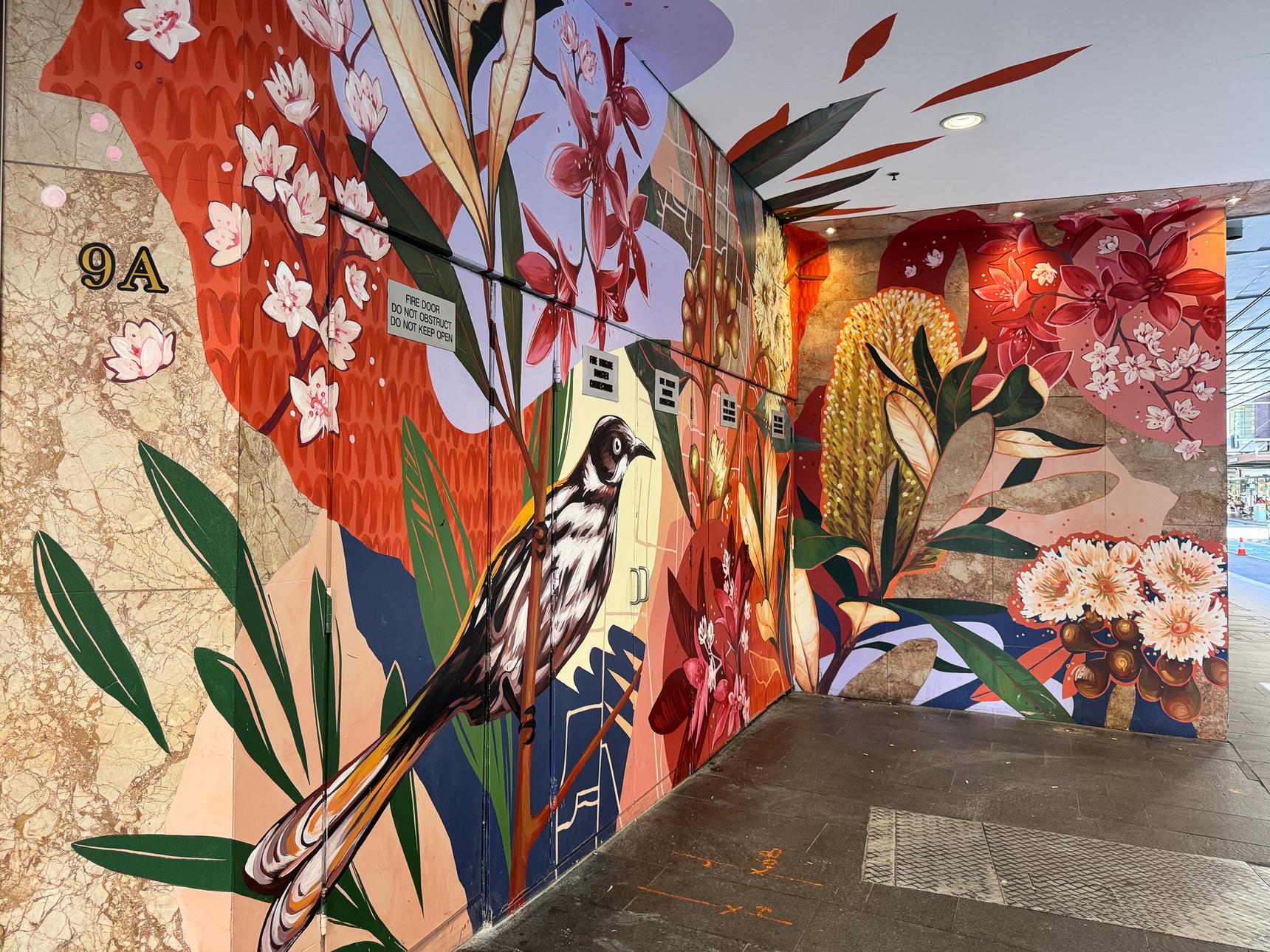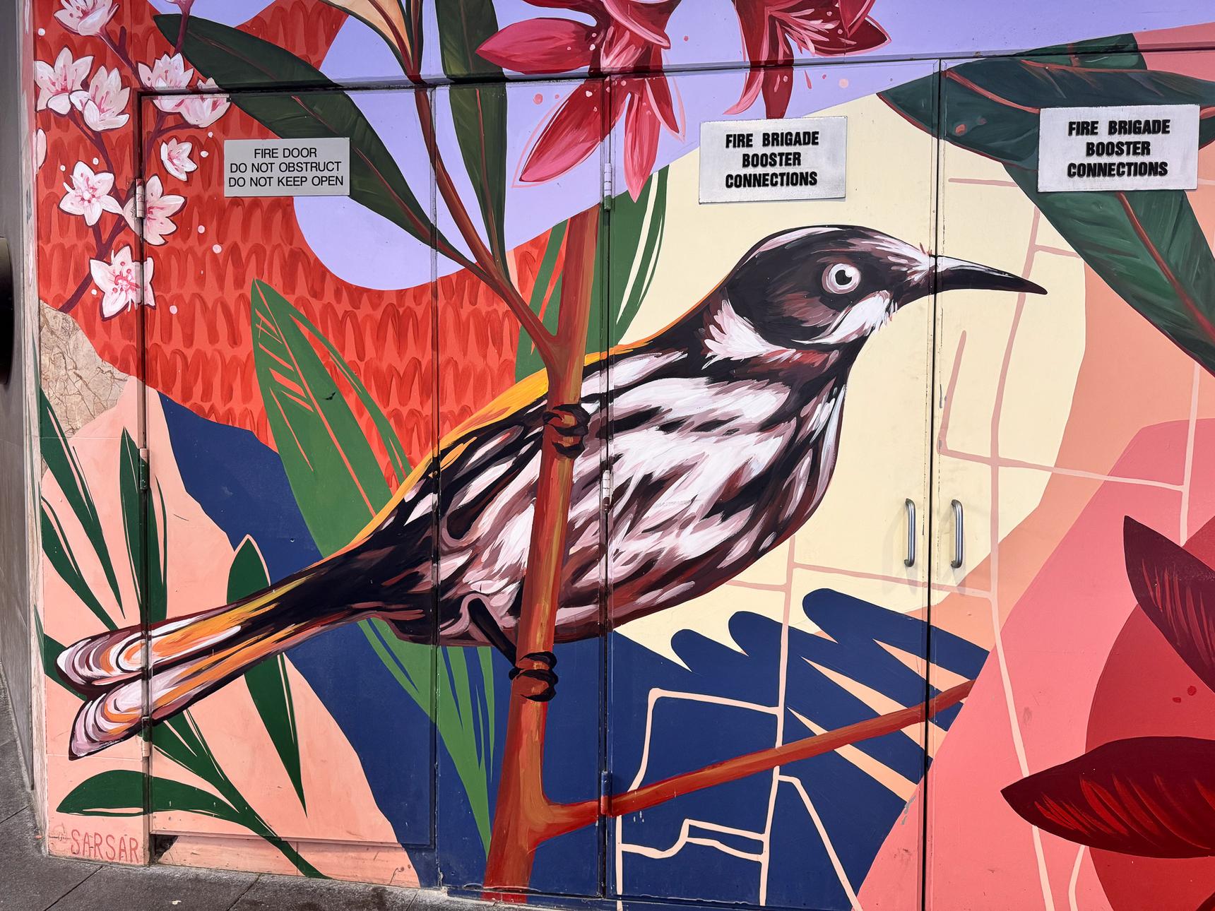 Colourful mural featuring a new holland honeyeater and lovely local flora.