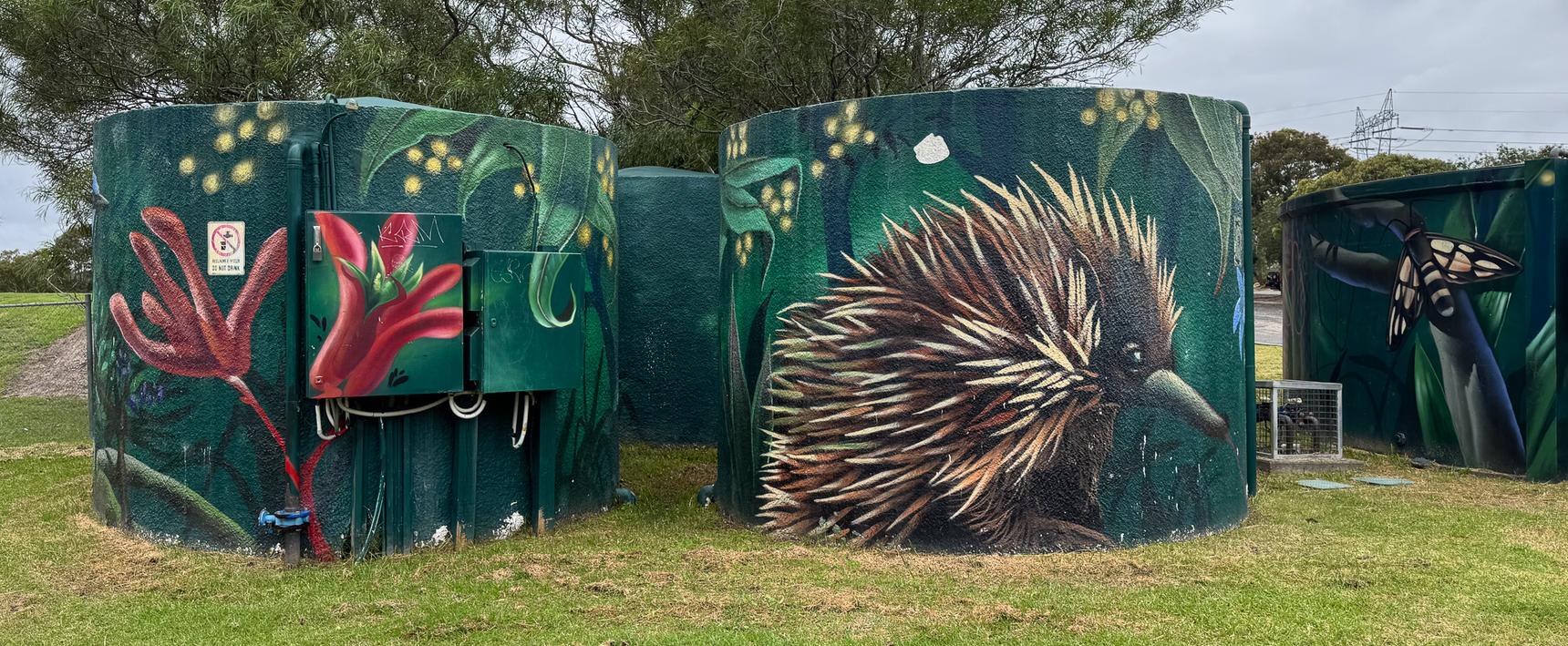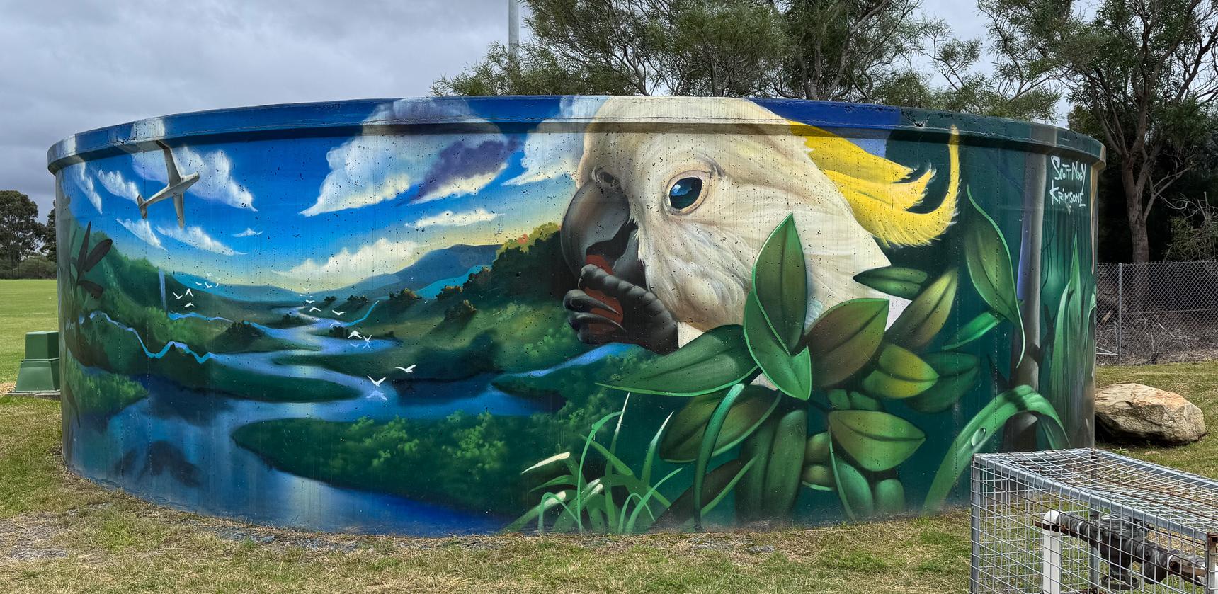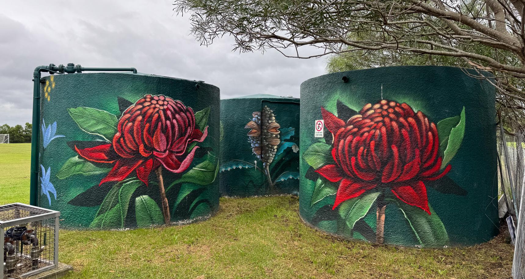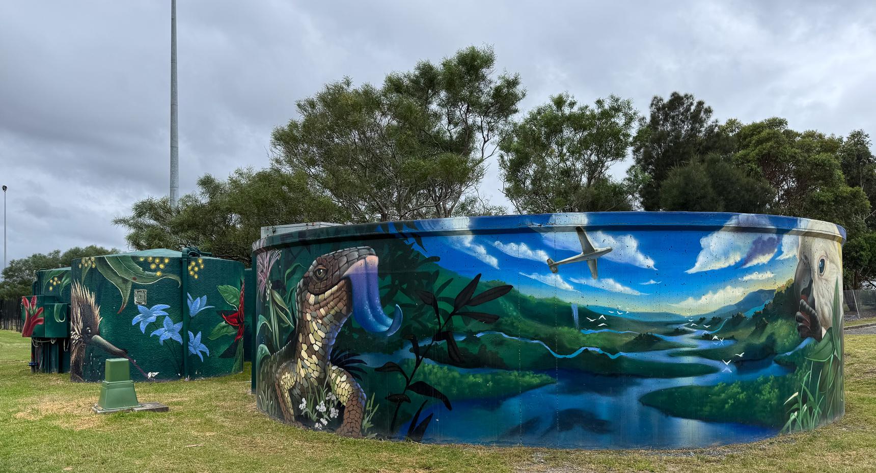 Five water tanks painted with vibrant images of Australian flora and fauna, as well as the local landscape. There are 5 tanks in total - for at the location shown below, which is a large sporting complex, the other is in playing field #5.