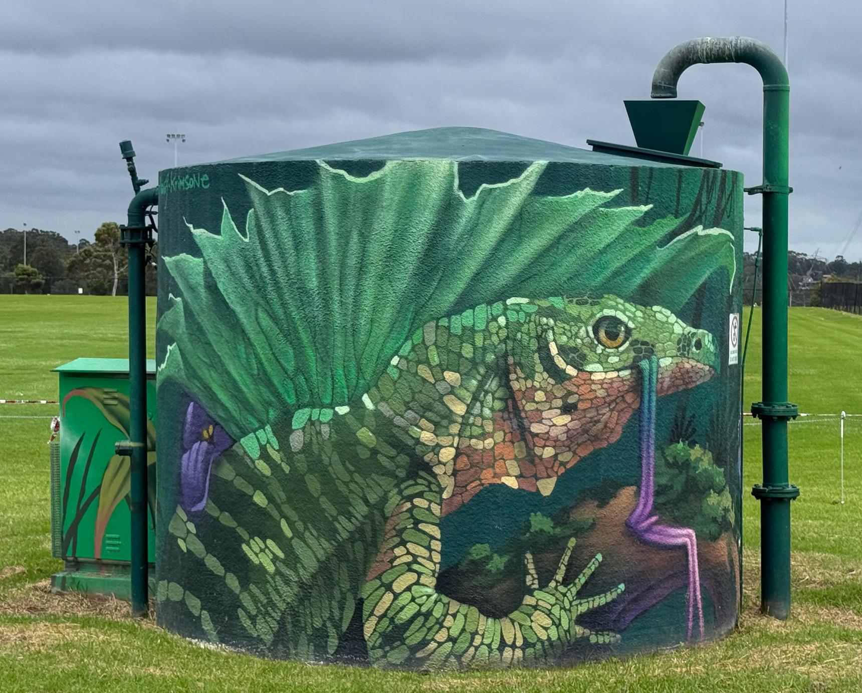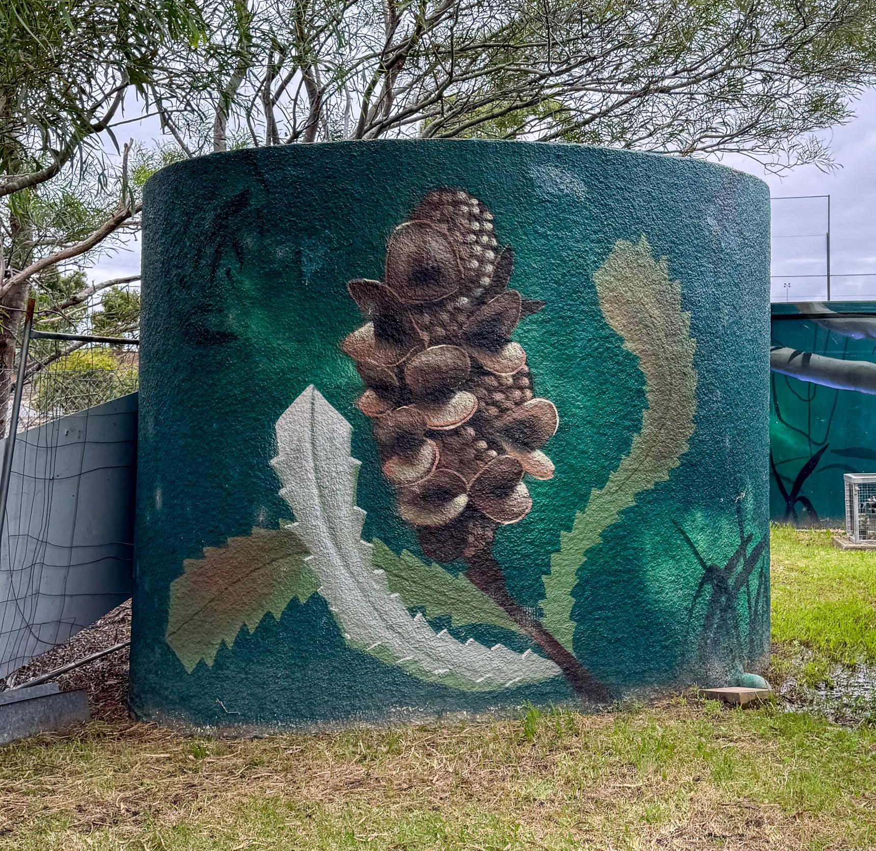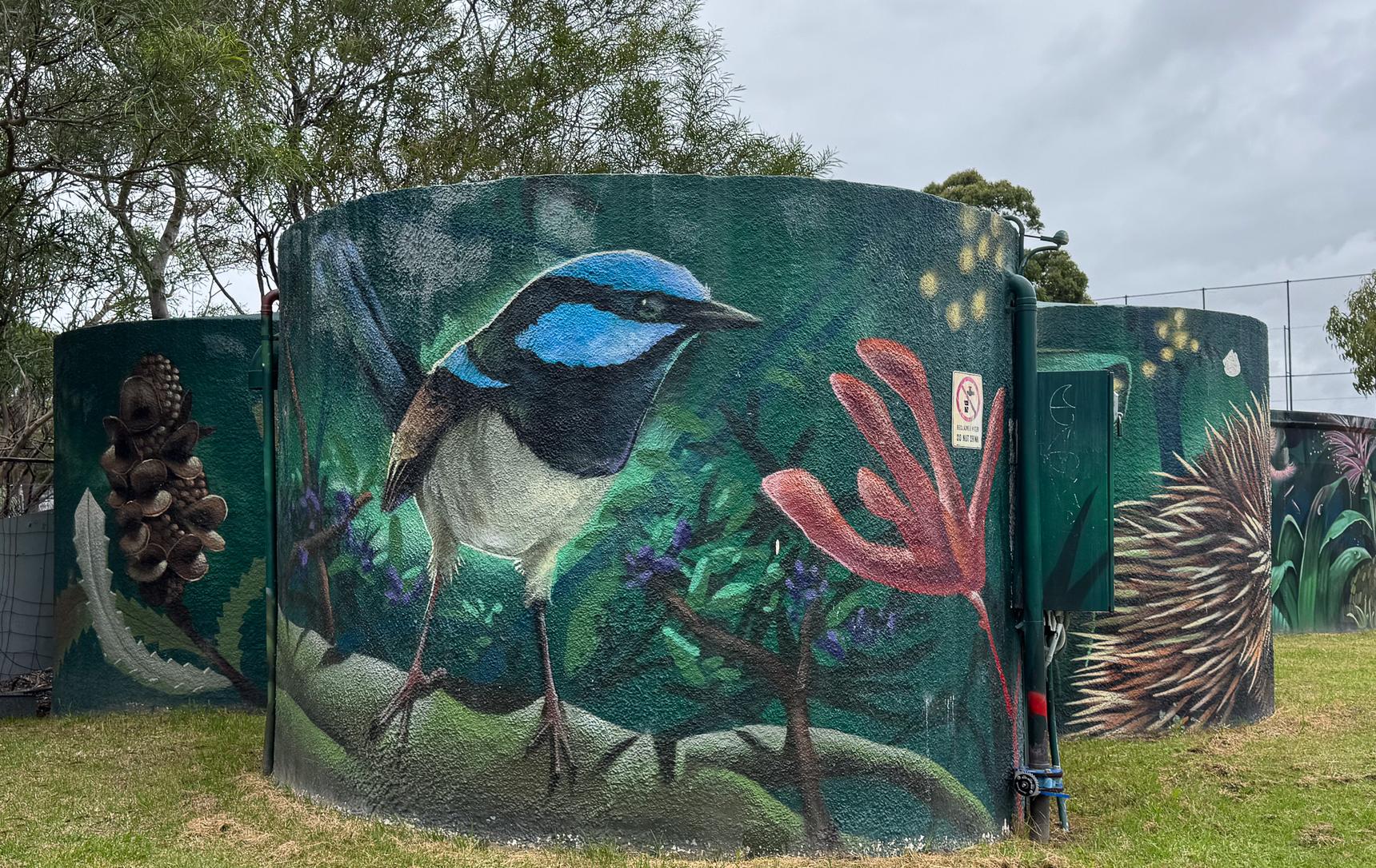 Five water tanks painted with vibrant images of Australian flora and fauna, as well as the local landscape. There are 5 tanks in total - for at the location shown below, which is a large sporting complex, the other is in playing field #5.