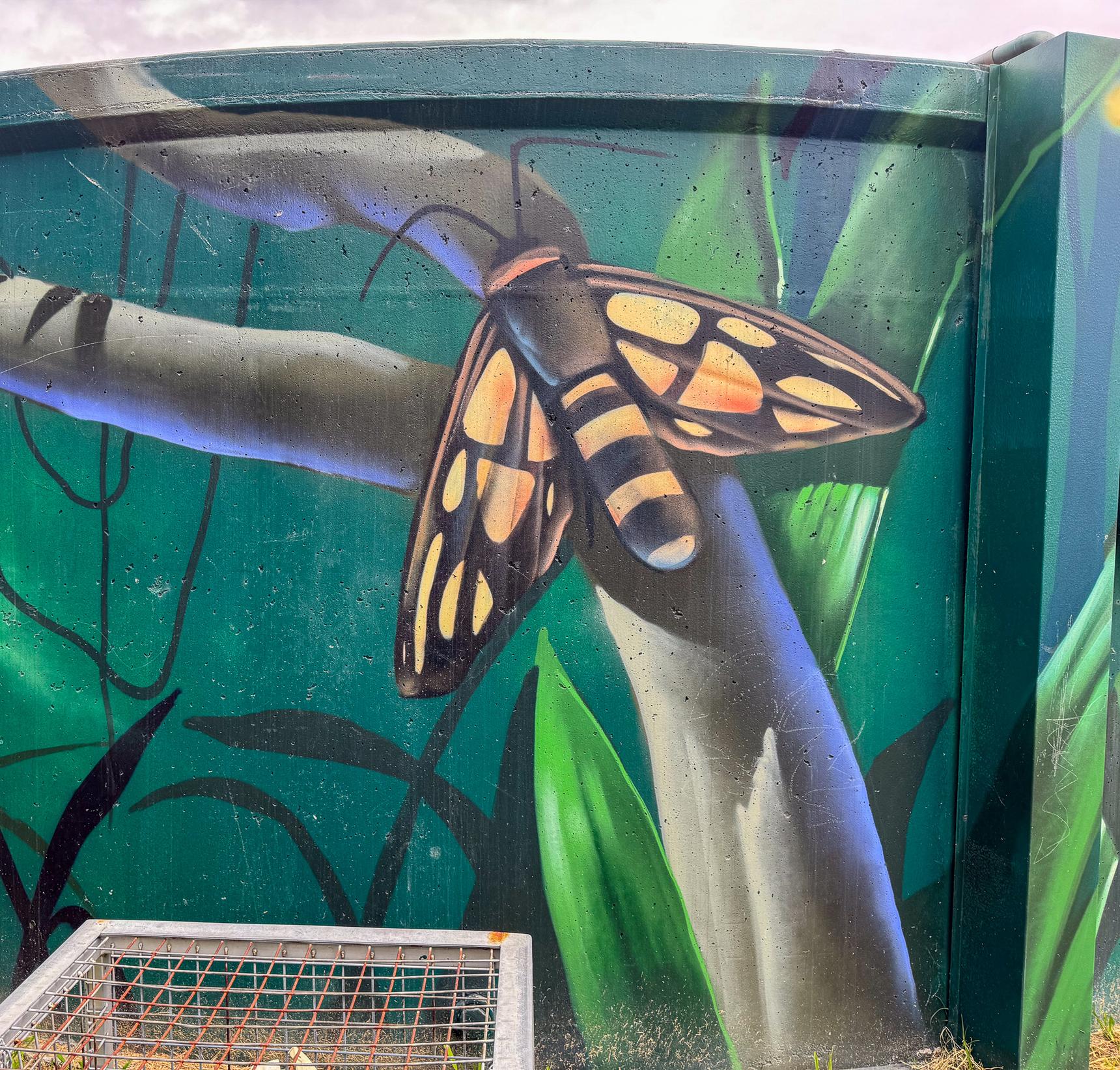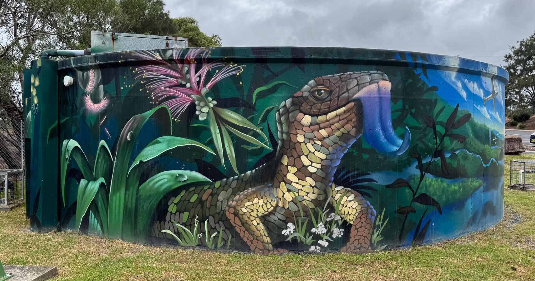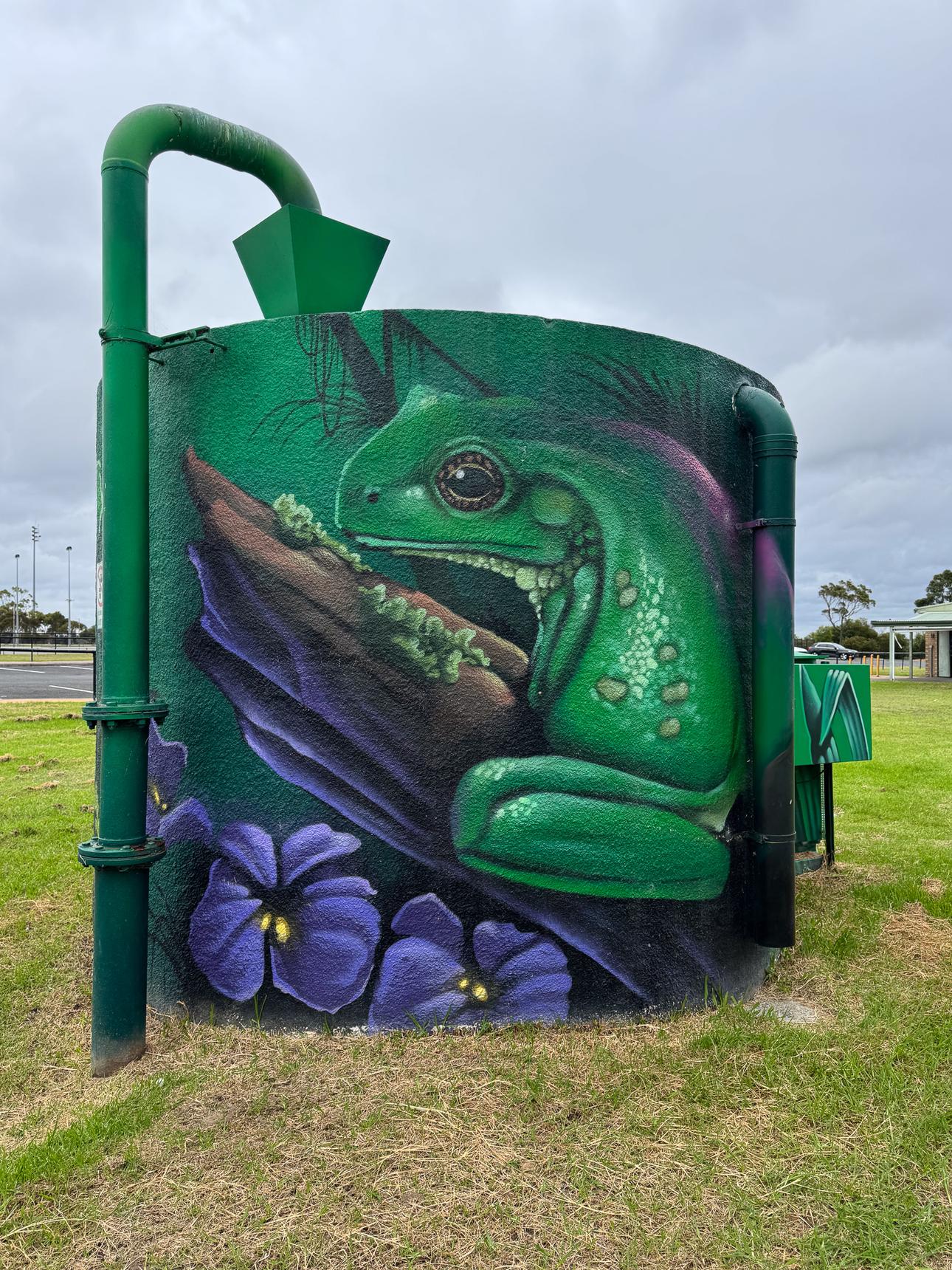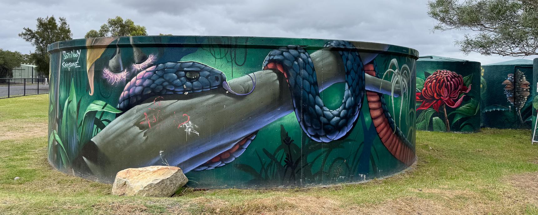 Five water tanks painted with vibrant images of Australian flora and fauna, as well as the local landscape. There are 5 tanks in total - for at the location shown below, which is a large sporting complex, the other is in playing field #5.