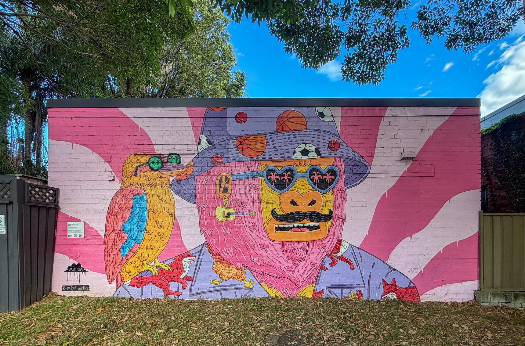 Jonno is a cartoon-like figure with bright pink hair and beard, and a yellow face with a slim black curled moustache above his grinning mouth. He wears bright blue heart-shaped sunglasses with two small palm trees painted onto each lens, and a dangling guitar-shaped earring in his ear. On his head is a lilac-coloured bucket hat the top of which is cut off by the top of the wall. The hat is printed with orange basketballs, red cricket balls and black and white soccer balls which reference the games which are played in the park. His pale blue open-necked shirt is also patterned but with a print of foxes and chickens which reference the local feral foxes that prey upon backyard chickens.