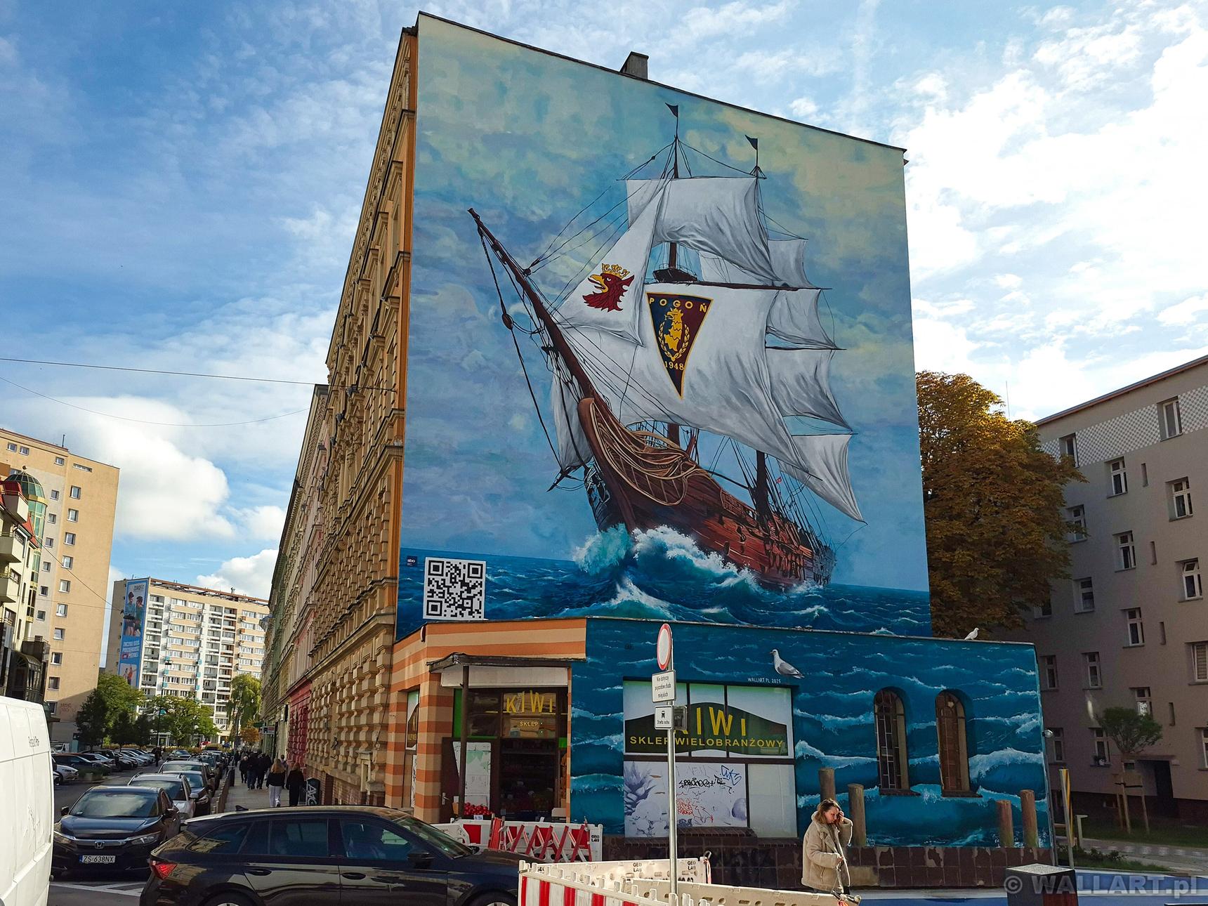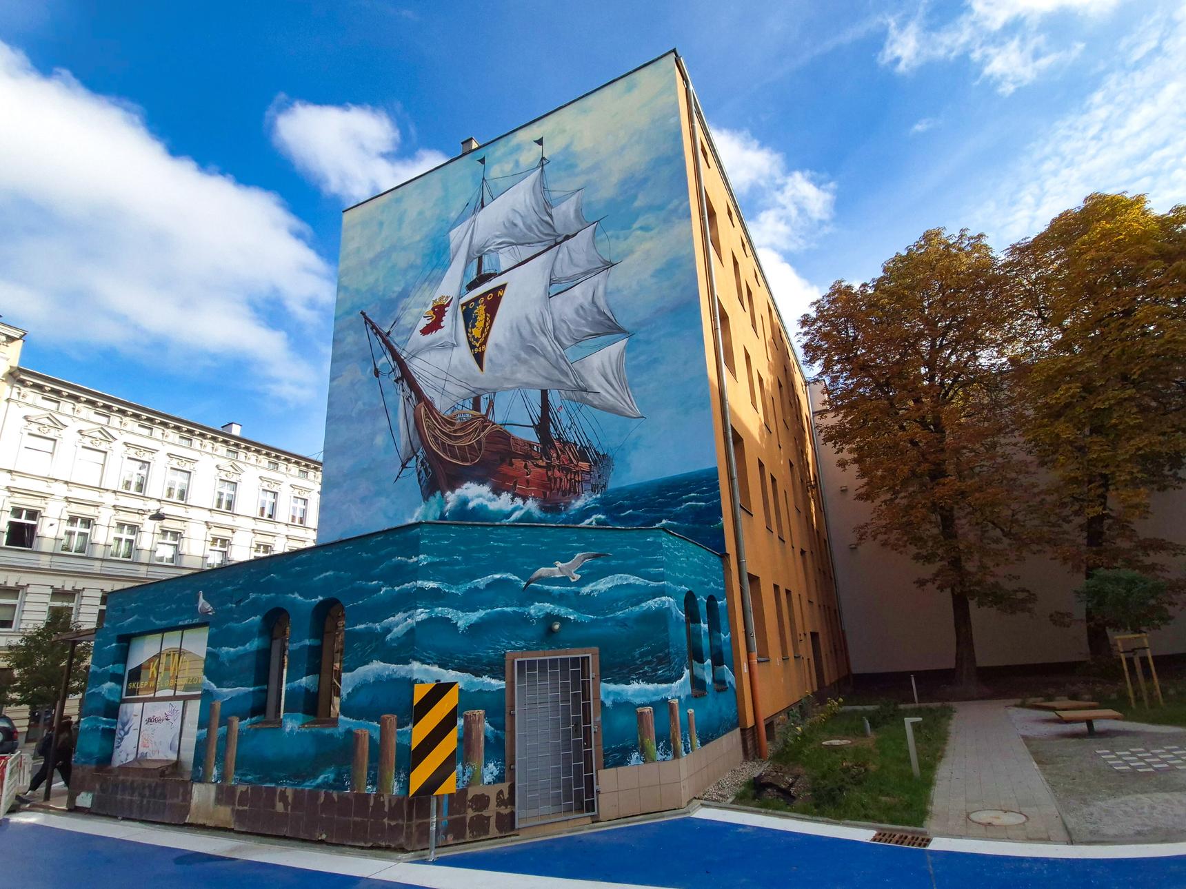 Imagine Pogo ź Szczecin as a mighty galleon that bravely faces the turbulent waves of the sea, full of passion, strength and steadfastness! This is what our mural in the heart of Szczecin represents.