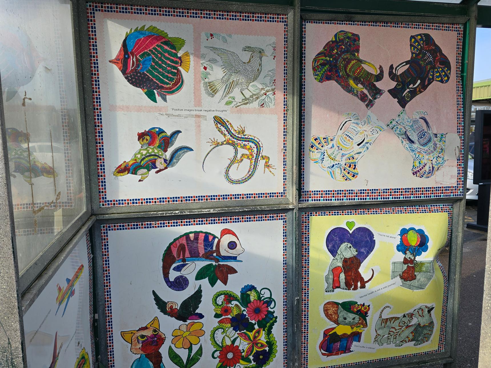 The art was printed onto panels and installed on the bus Shelter. Unfortunately, a couple of panels have been badly dented, but the art is still visible.