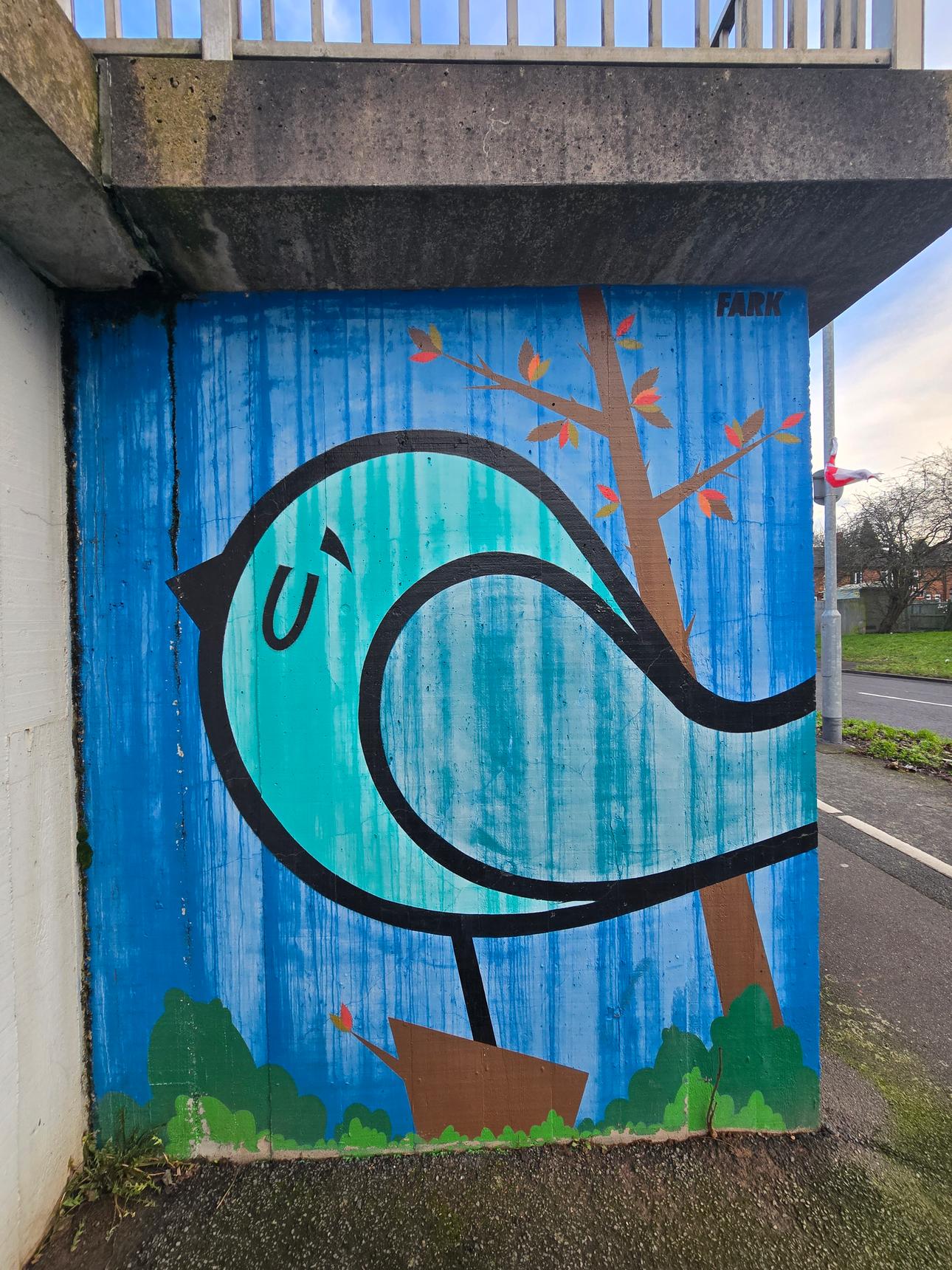On Park Farm Road, painted on the wall of the steps to the footbridge over the A5.