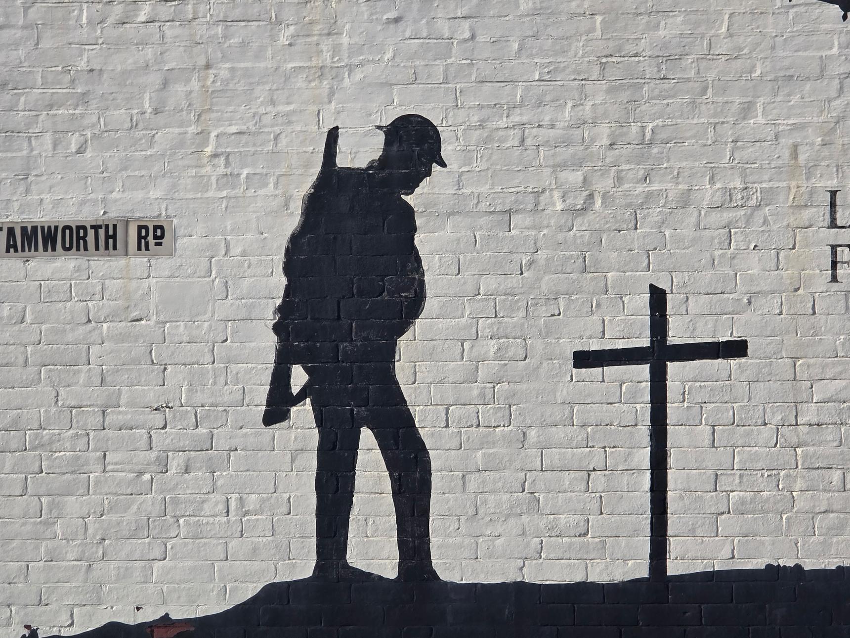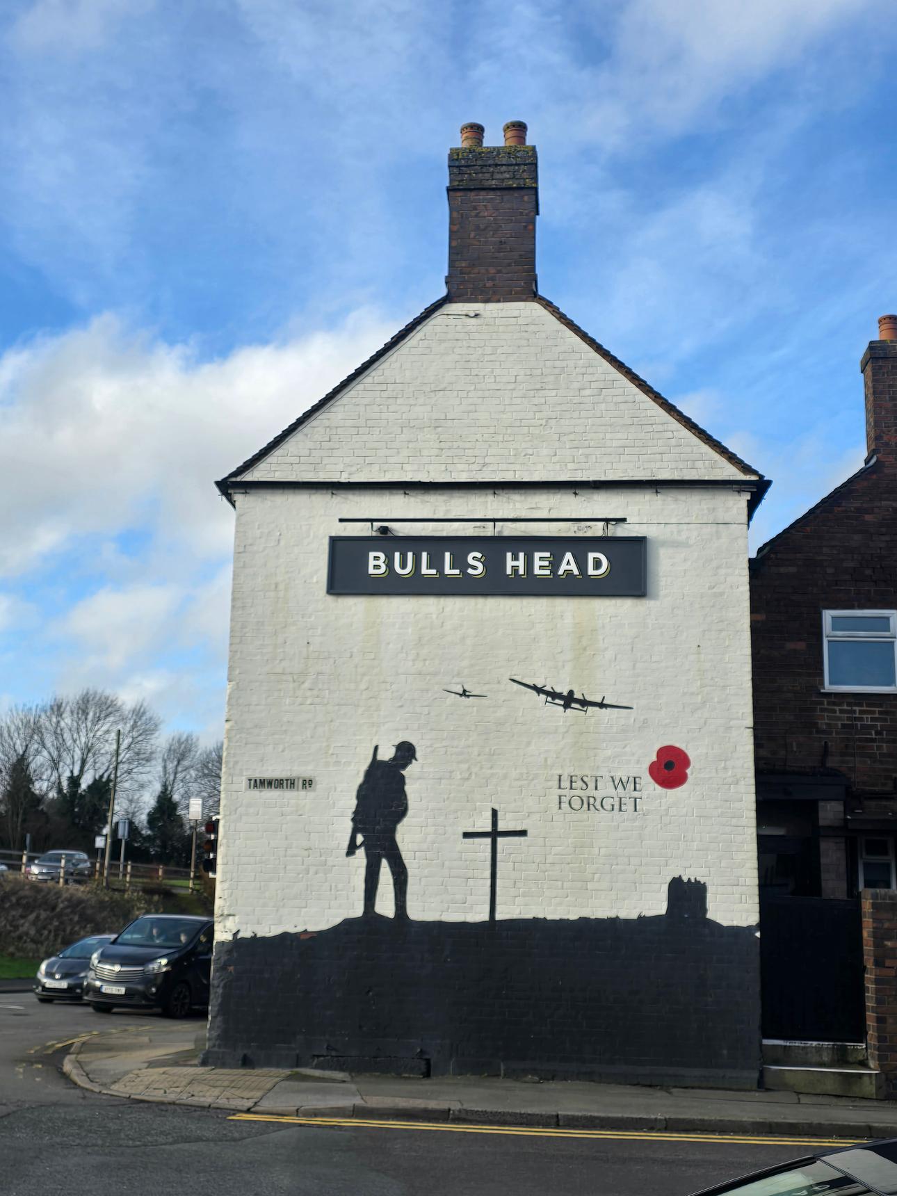 This wall was created in support of the Ride the Wall, where each year thousands of motorcyclists ride to the National Memorial Arboretum in Alrewas. The Bulls Head Pub, which commissioned this mural, is a supporter of the event.
