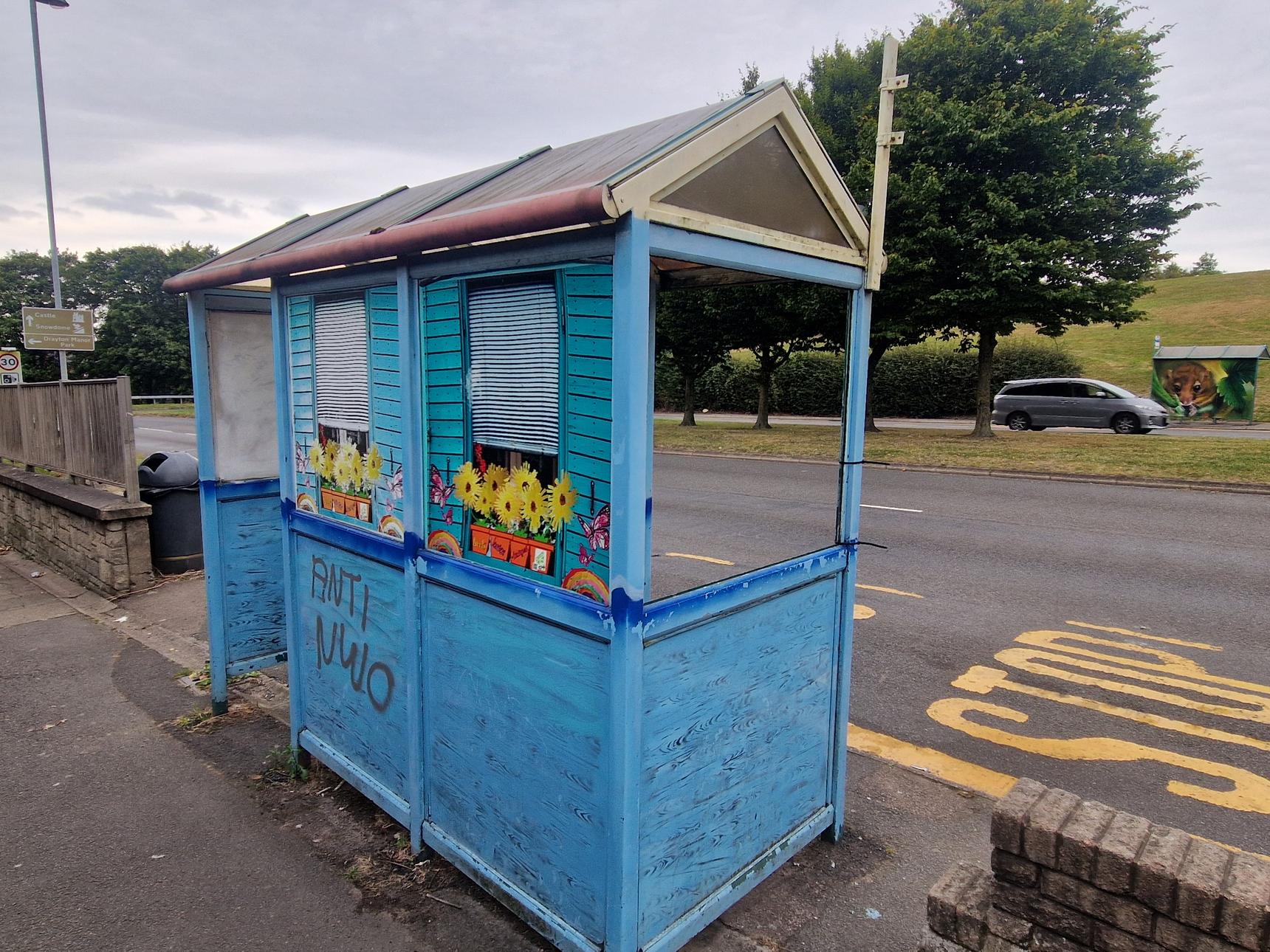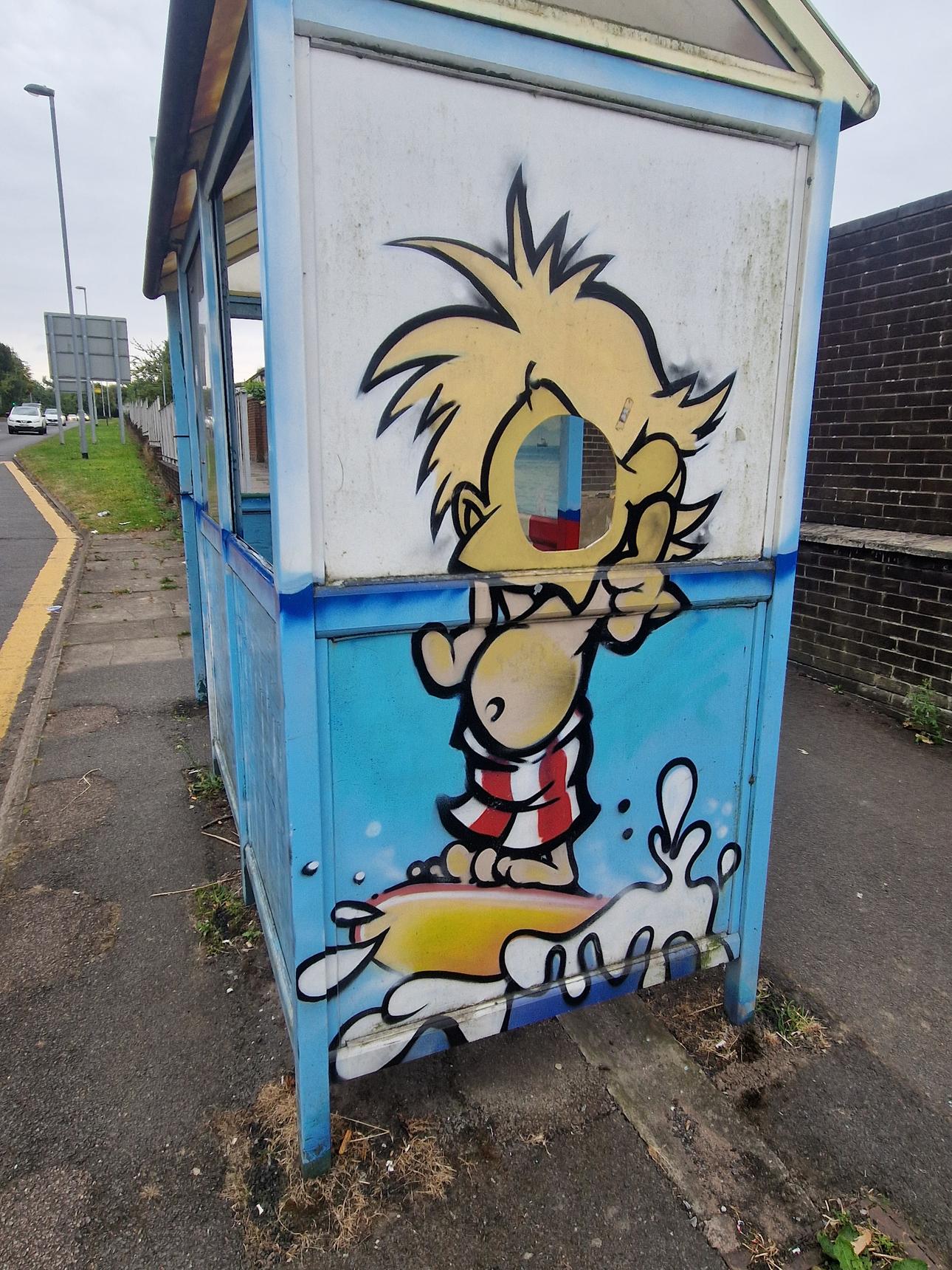 For the last few years, New Urban Era have been organising local artists to paint bus stops in Tamworth and the surrounding area. This bus stop (and the bus stop opposite) is by Wingy. He was assisted on this bus stop by Nue.