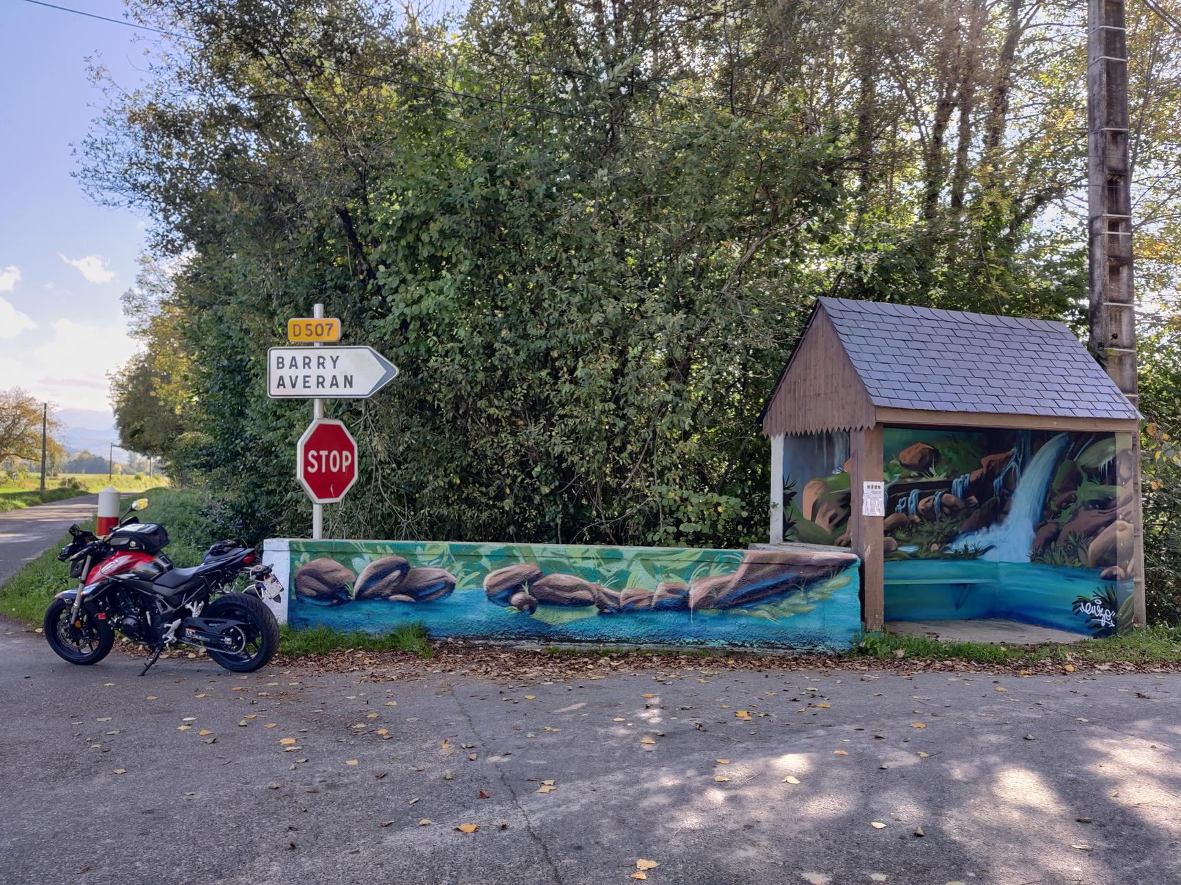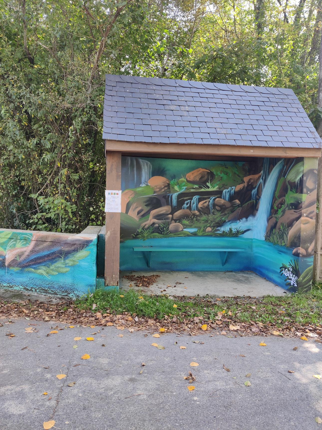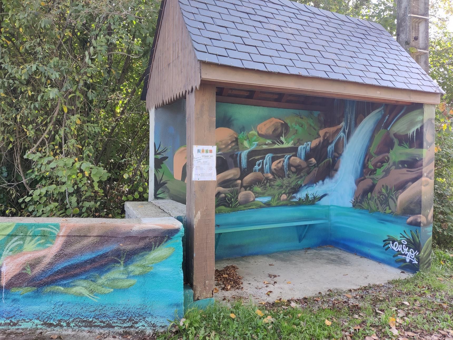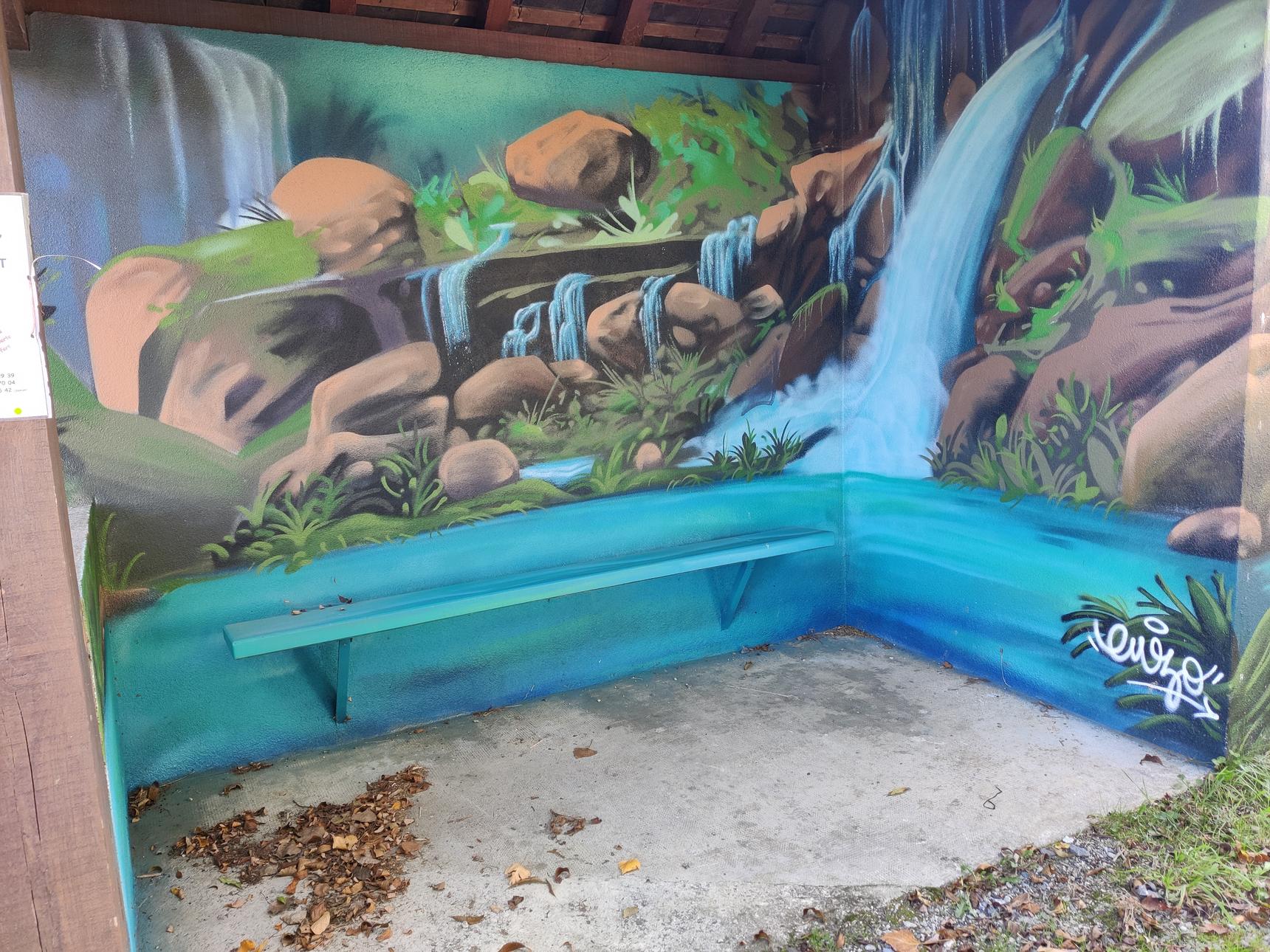 the waterfall painted on a bus stop