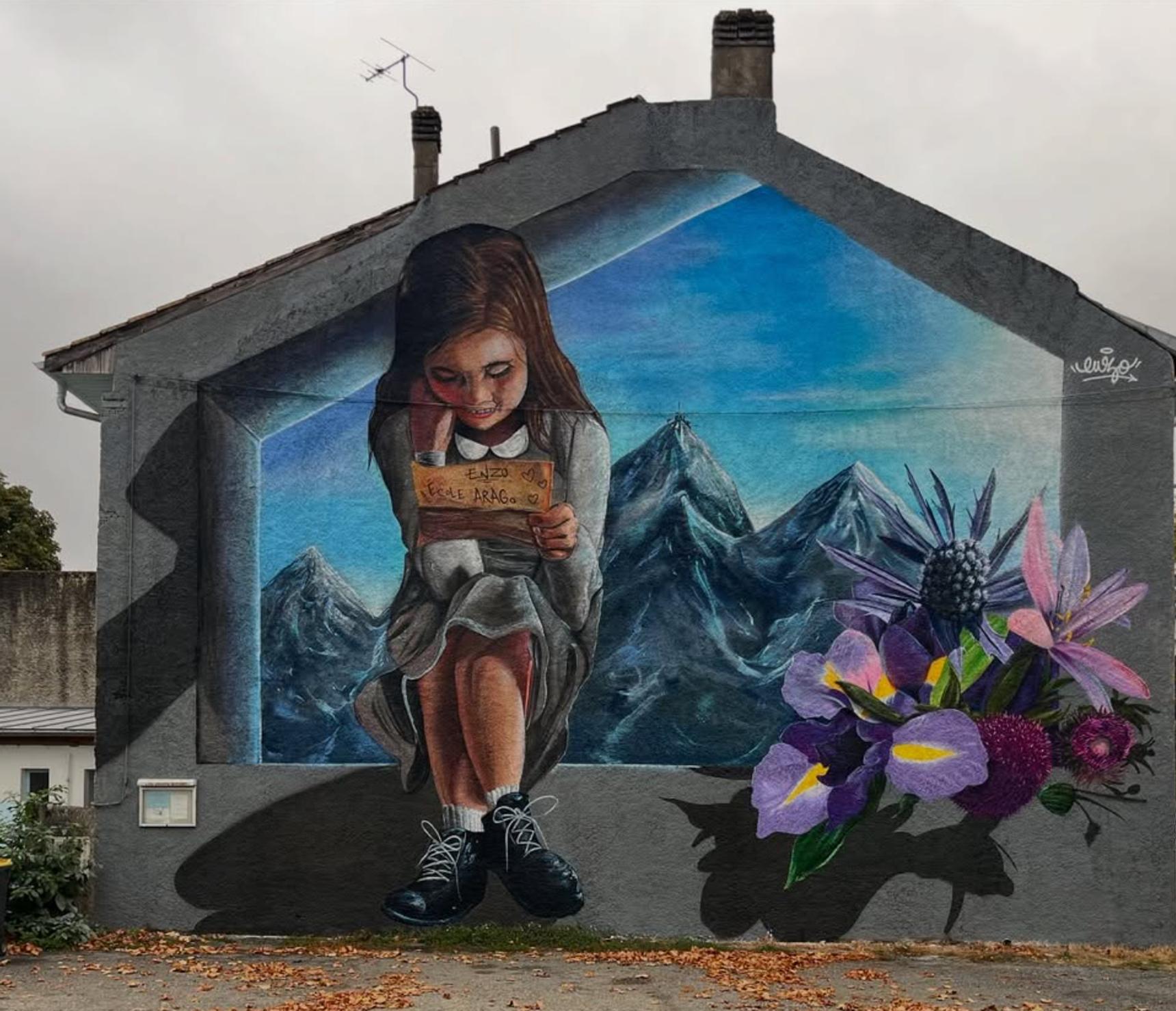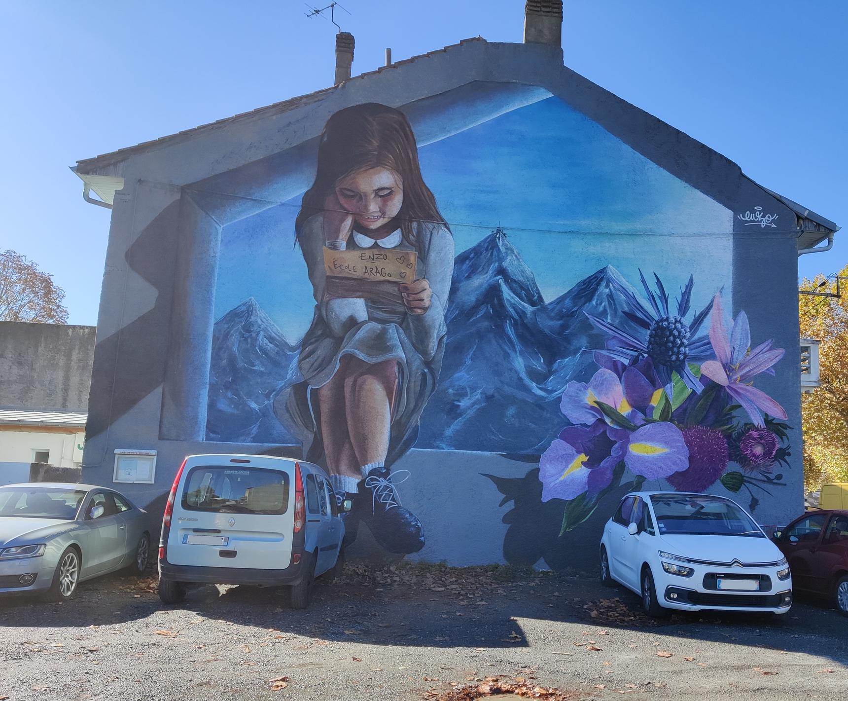 Fresque elle rend hommage à l’école Arago et célèbre la beauté des Pyrénées, chères à son enfance.