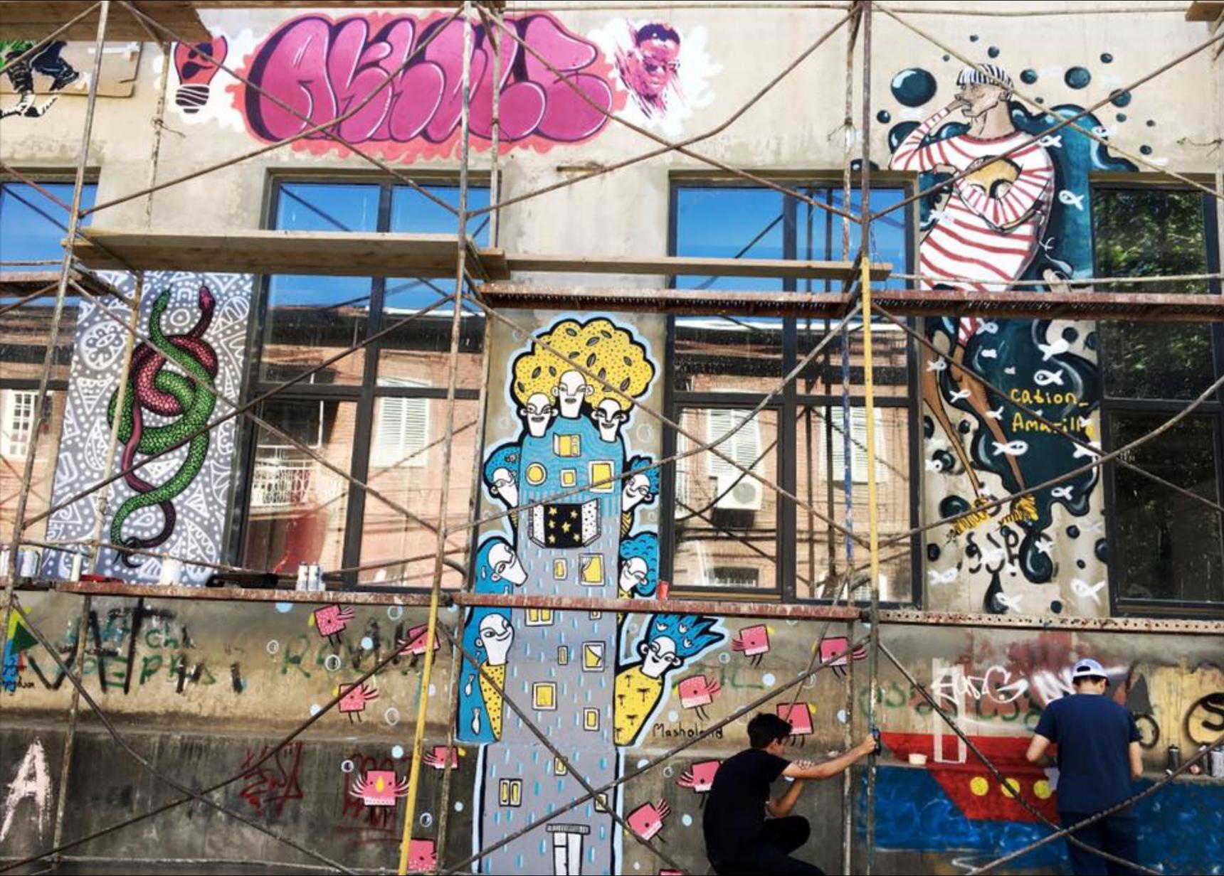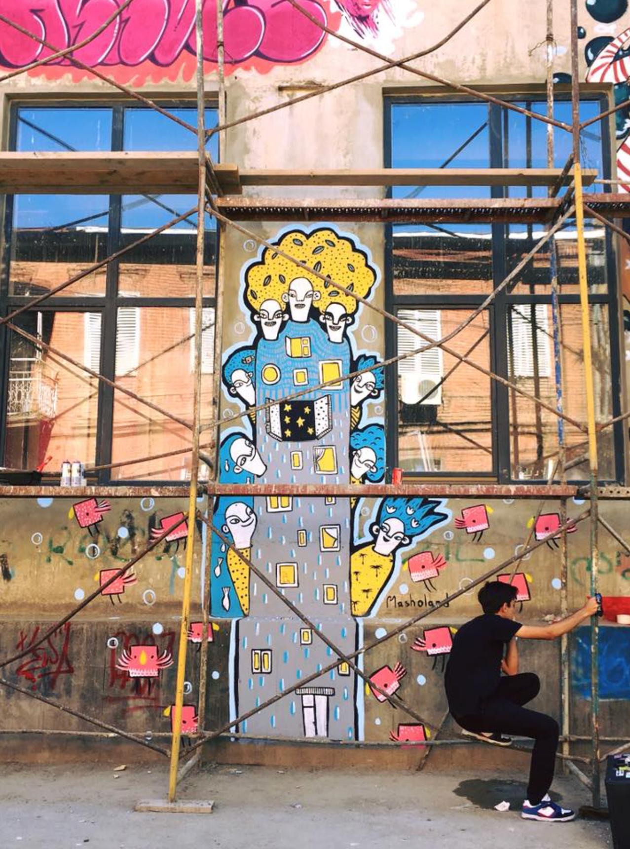 Masholand's (Masho Marg) very first mural at the Fabrikaffitti festival. The mural was painted with acrylics, which made the characters feel alive and stand out from the walls. This piece marked a new chapter in the artist's creative career.