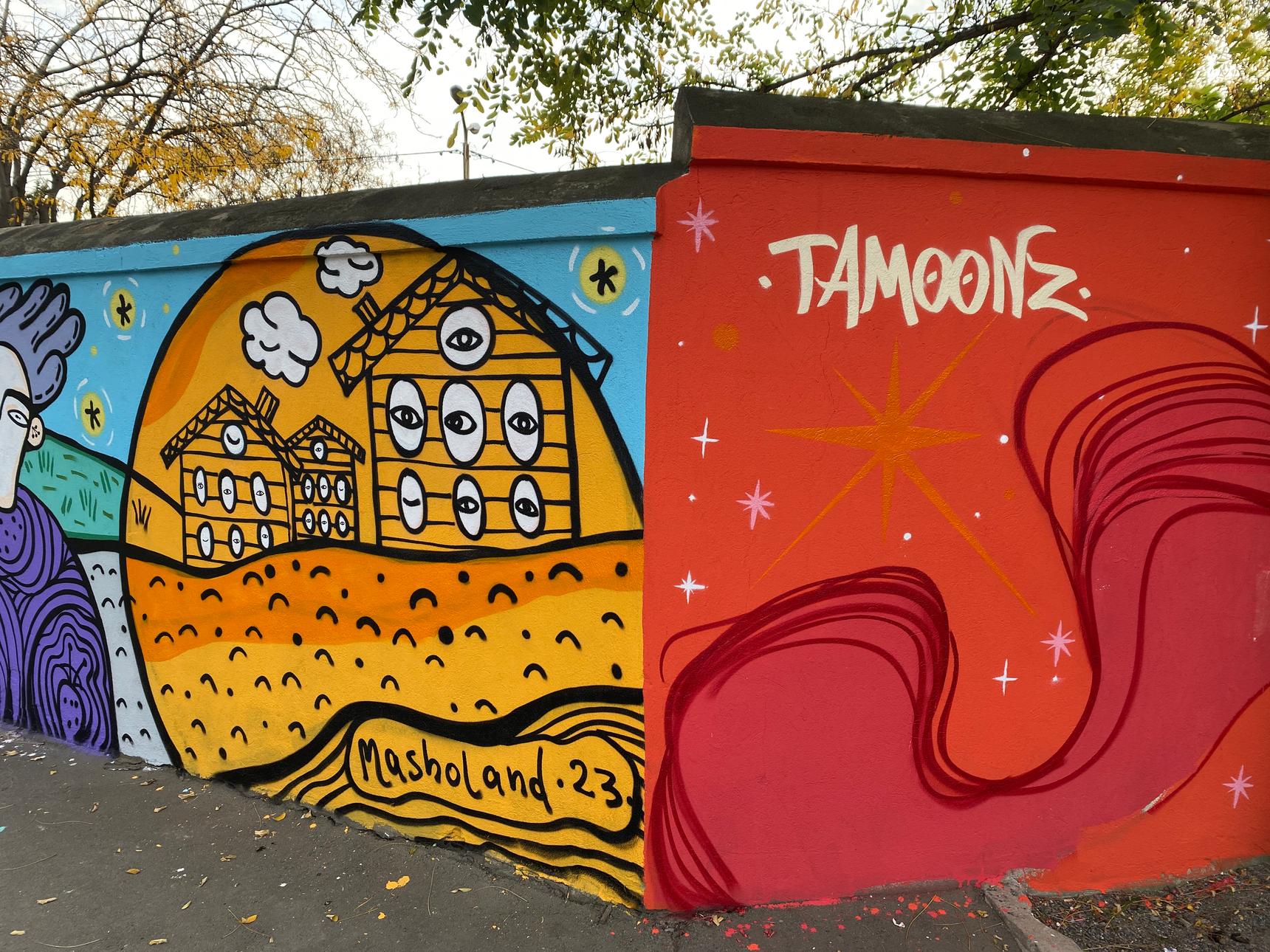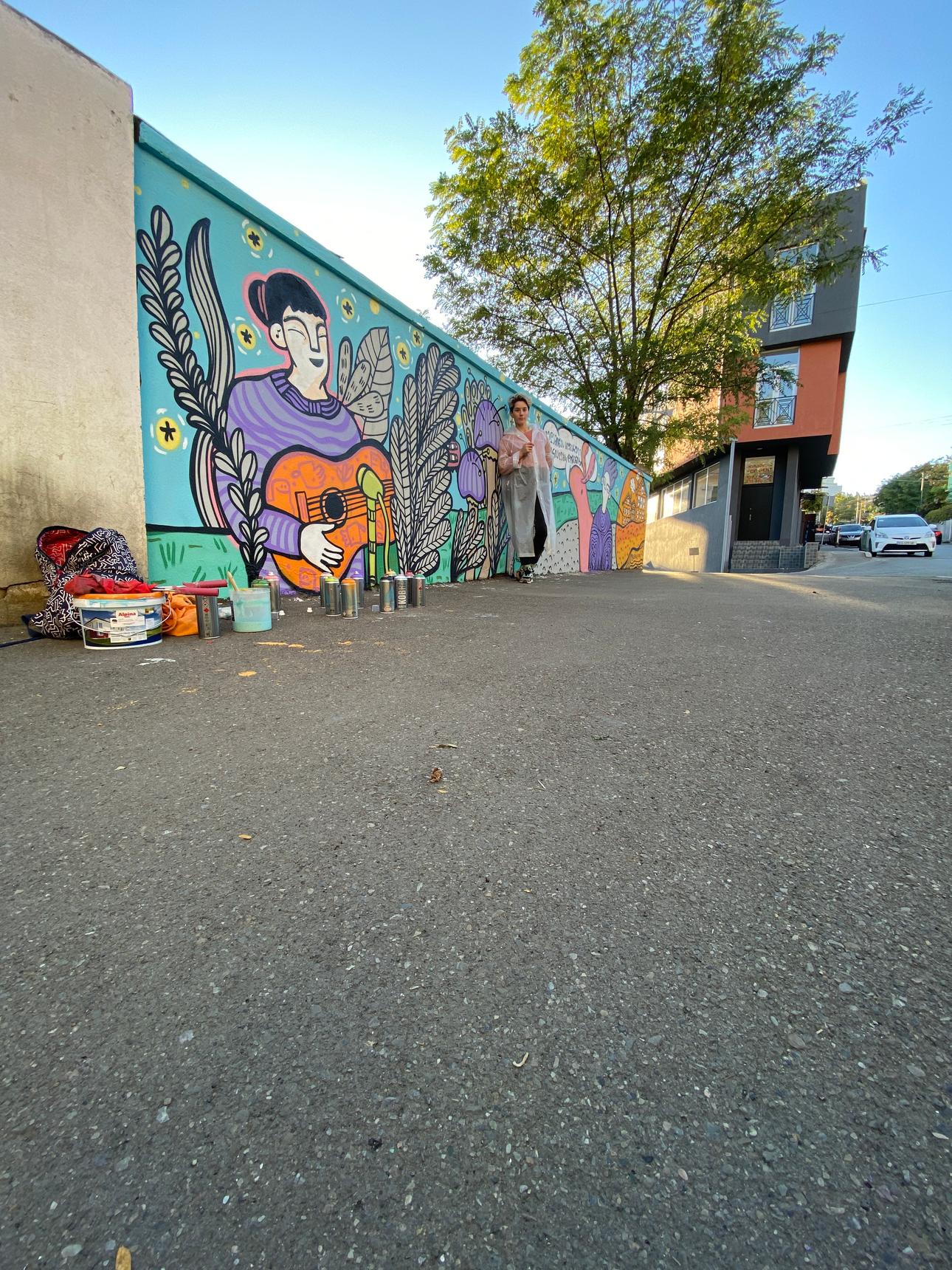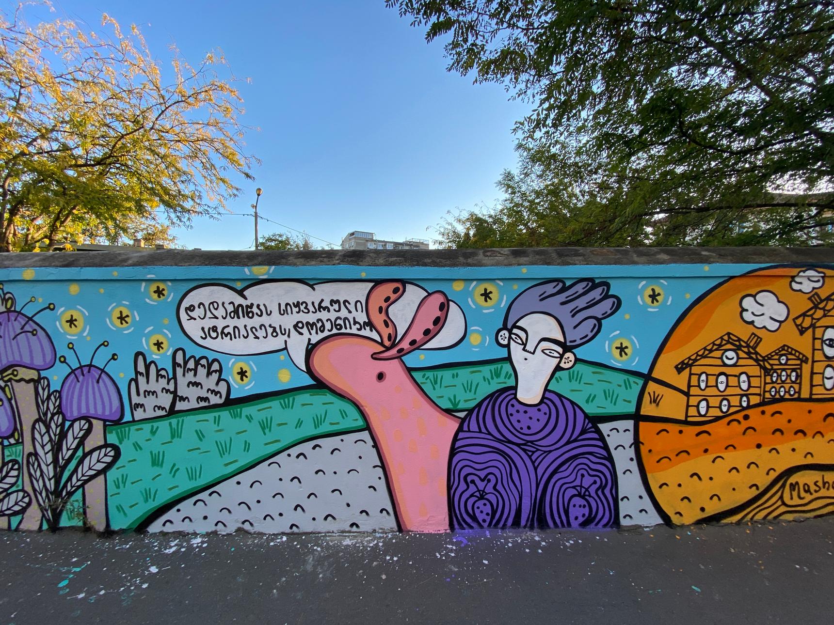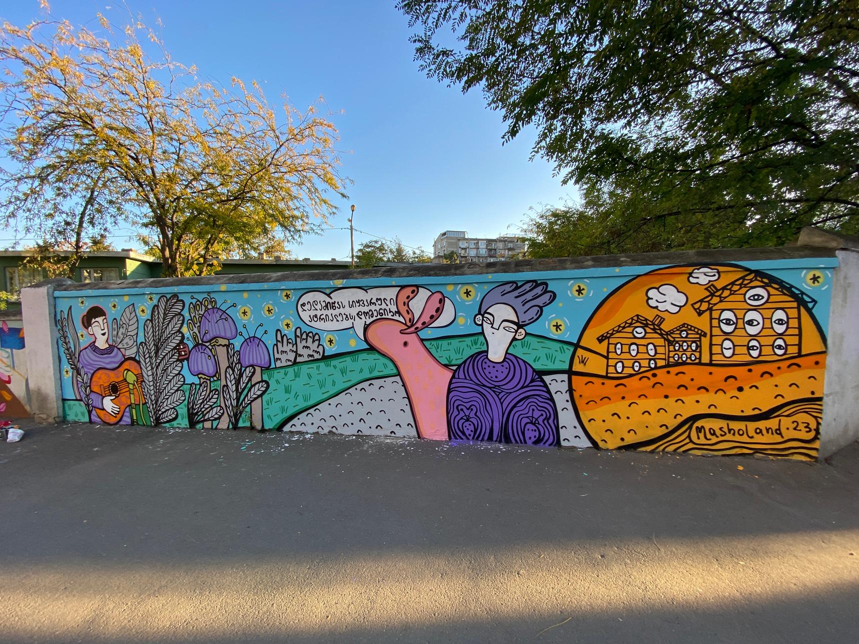 During the Street Art Sakartvelo festival, Masholand (Masho Marg) has created a mural dedicated to Georgian artists: Inola Gurgulia (singer and songwriter) and Guram Dochanashvili (writer). The wall explores her feelings toward these artist while diving deeper into their creations.