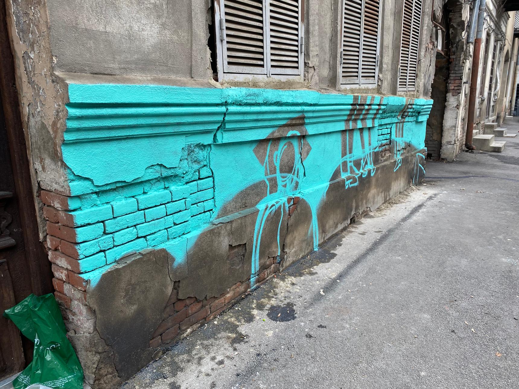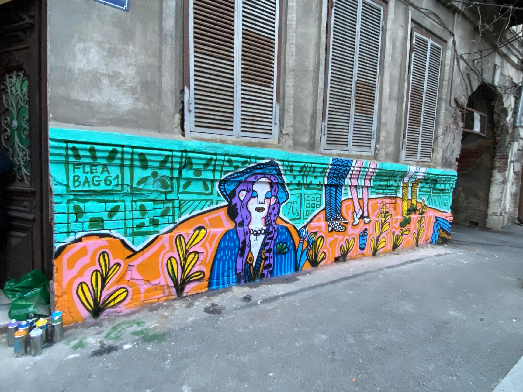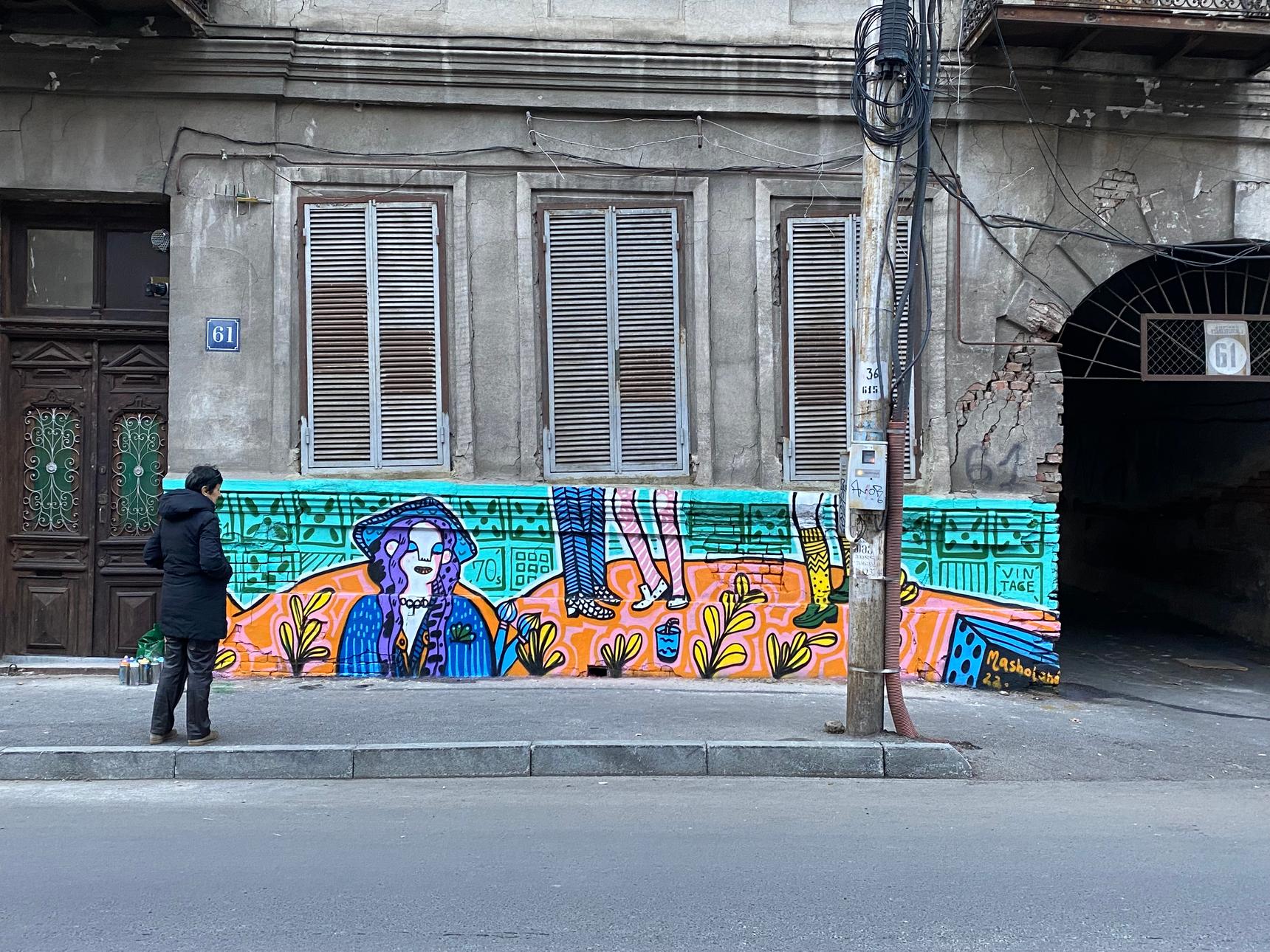 A small wall for the vintage store in the old neighborhood in Tbilisi. The mural idea was suggested by the client, but the sketch, along with the execution, was Masho's. This colorful wall was painted on a cold day, in under 5 hours.
