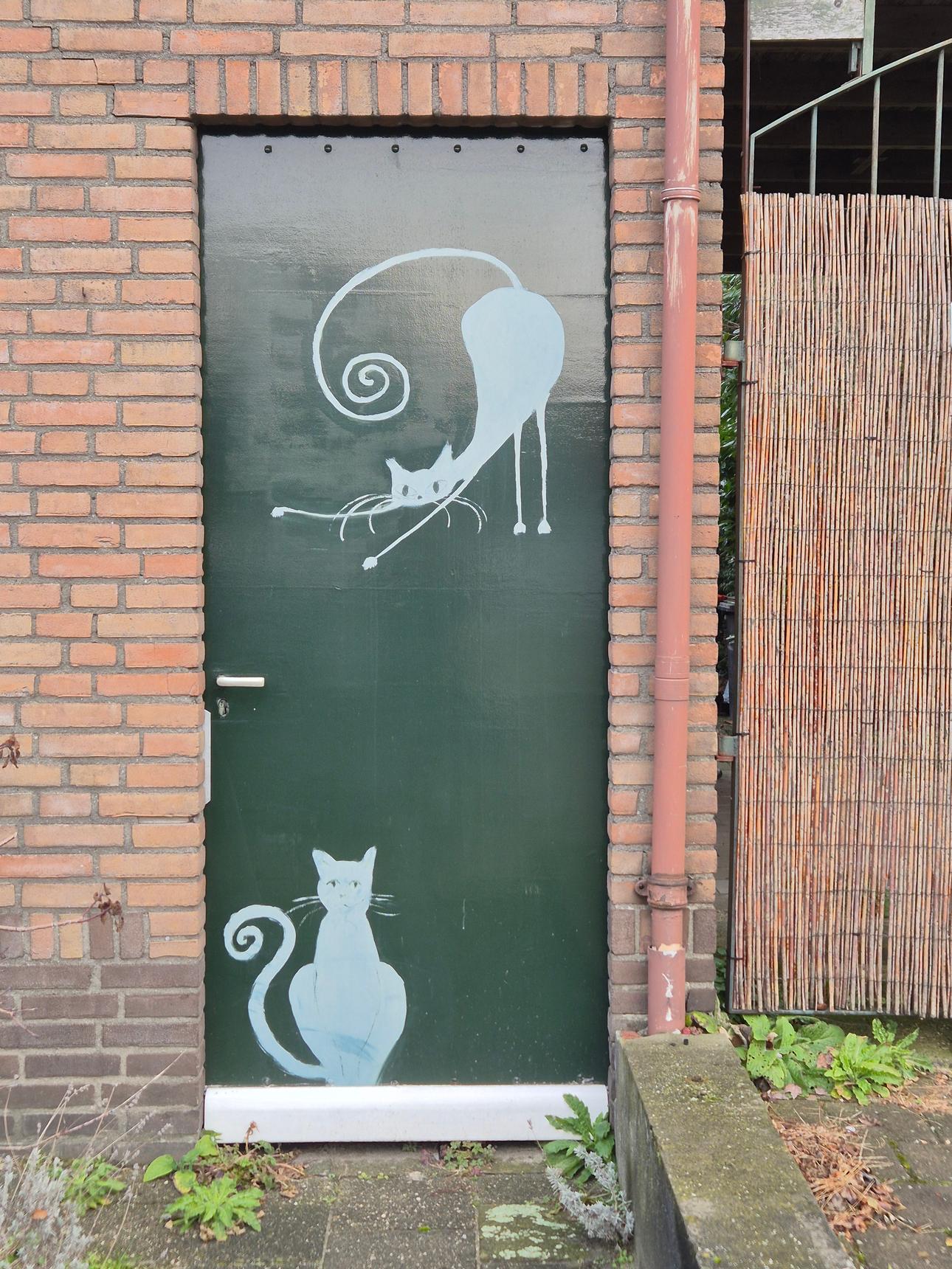 Tanja vertelde mij dat het houtwerk van het huis van haar schoonmoeder wel een likje verf kon gebruiken. In overleg met haar besloot Tanja 2 poezen op de deur van de berging te schilderen.