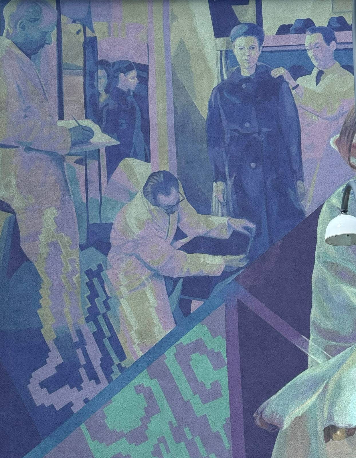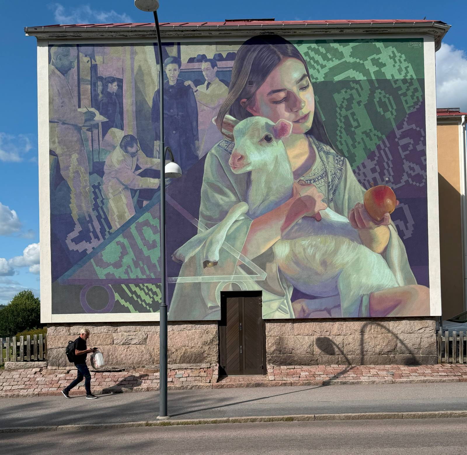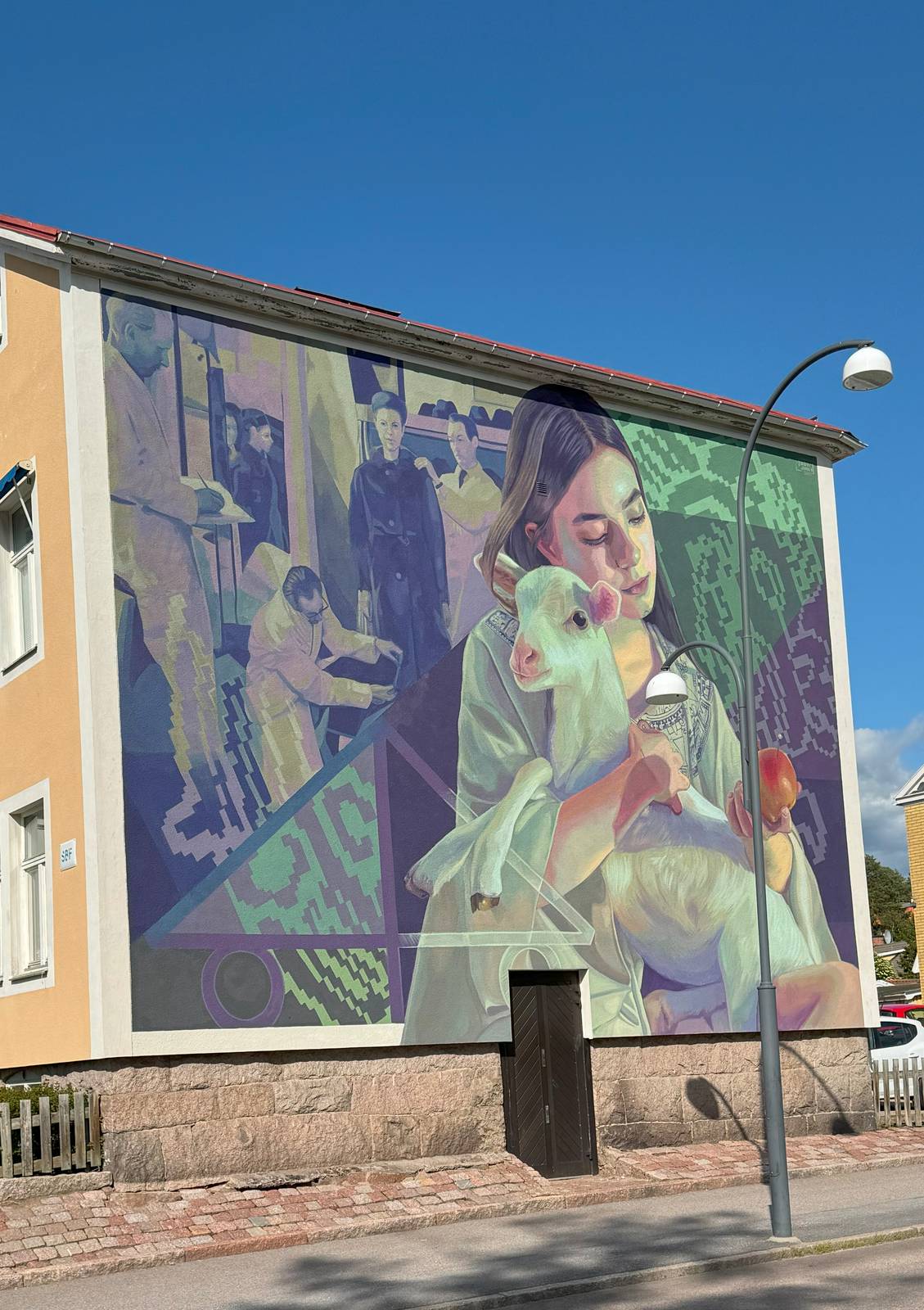 As quite often in latin american art, the wall is full of symbols. Yuda's work often depict portraits of everyday people, with an emphasis on labor and social history. The background includes geometric patterns, textile motifs, and people working in a factory or workshop setting, referencing Tranås’ historical textile and fur industry. And then the lamb and the apple... How many interpretations of their symbolic meaning are there? I had a very interesting chat with ChatGPT on this subject and one of the most interesting interpretations had a femeinist/contemporary approach, "The woman might also be interpreted as embodying dual roles: the nurturing, protective (toward the lamb), and the thoughtful, reflective (toward the apple). This could mirror a modern woman’s position, balancing emotion and intellect, tradition and independence."