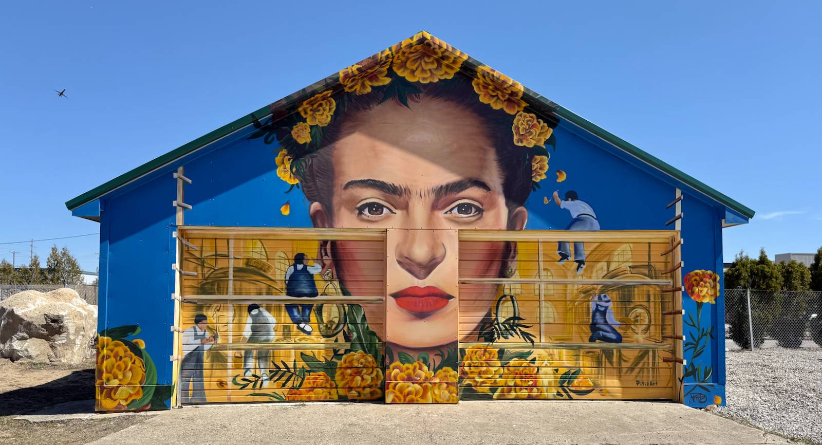 Frida Kahlo with artwork extending to side wall of building.