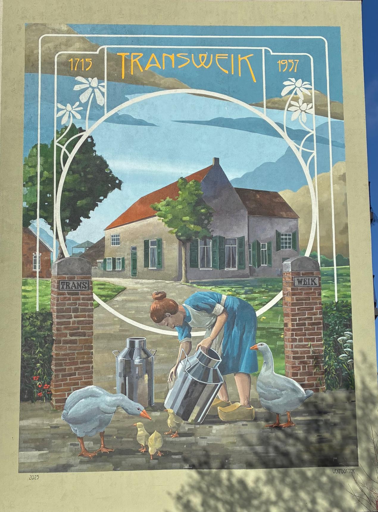 The artwork is reminiscent of the rural Kanaaleiland area from 70 years ago, when there were several farms. Those had to make way for housing. One of those farms was called Transweik. Before leaving, the farmer expressed the wish that the name of his agricultural business should live on. That happened: the new neighborhood was given the name Transwijk (with ij).